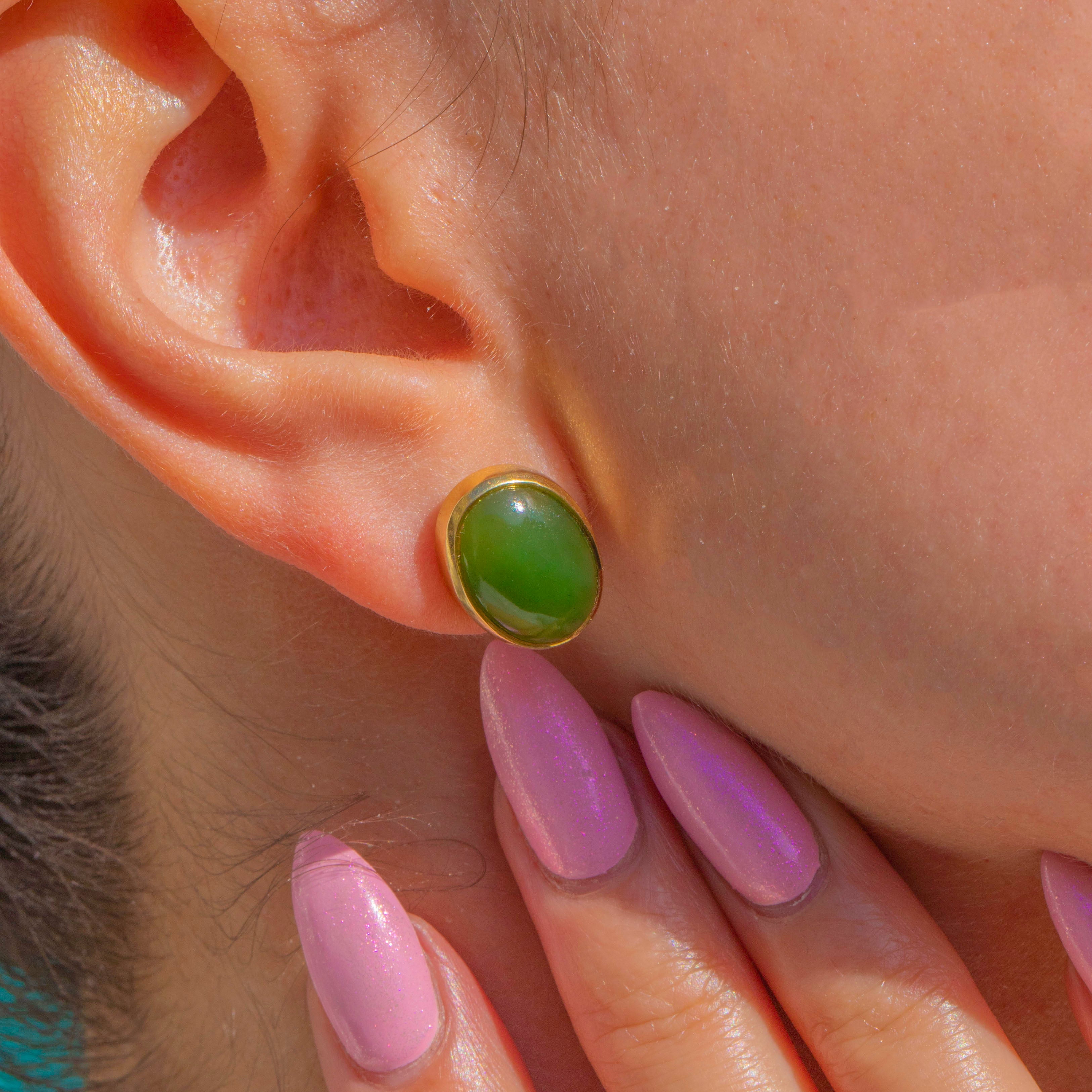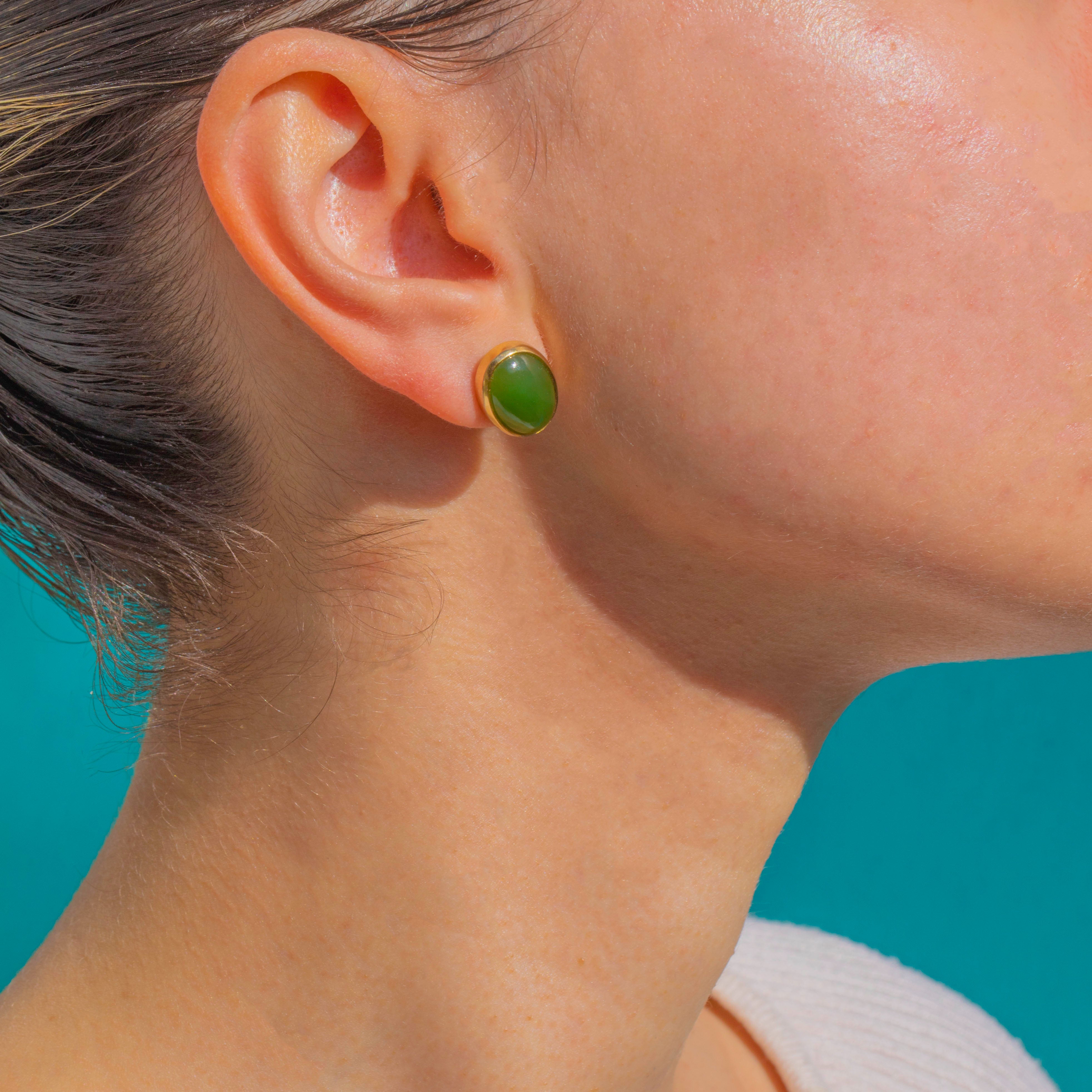Imbued with lush, even colour, these Jade cabochon studs are a timeless study in restraint. Smooth oval cabochons sit within polished 18ct Gold bezels, the minimalist silhouette letting the verdant green take centre stage.