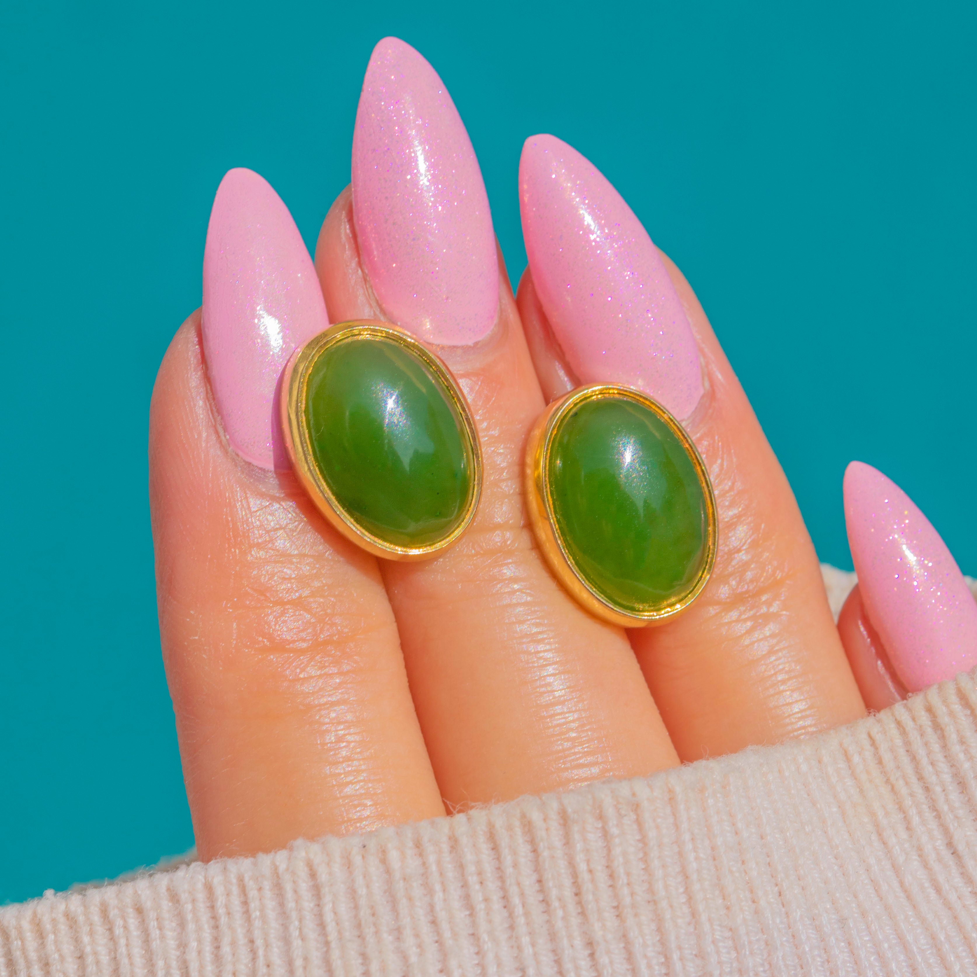 Jade cabochons measure 12.5mm long x 9mm wide x 4mm deep.