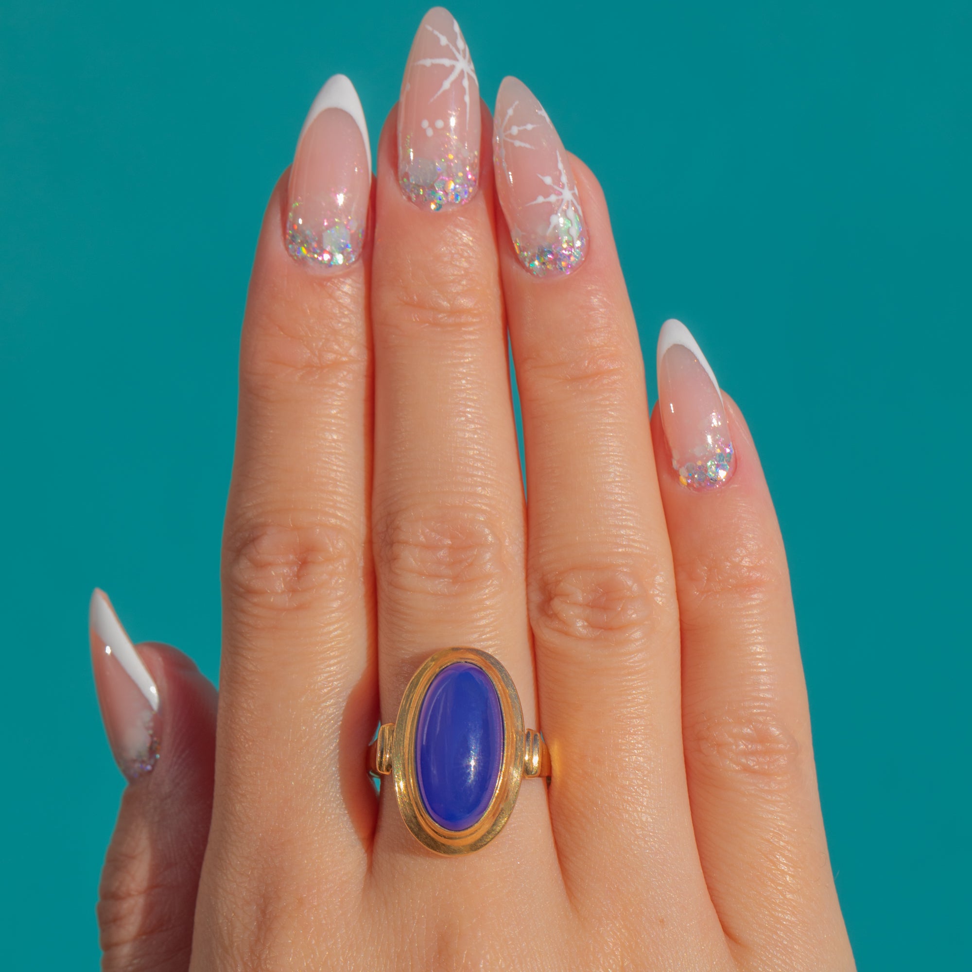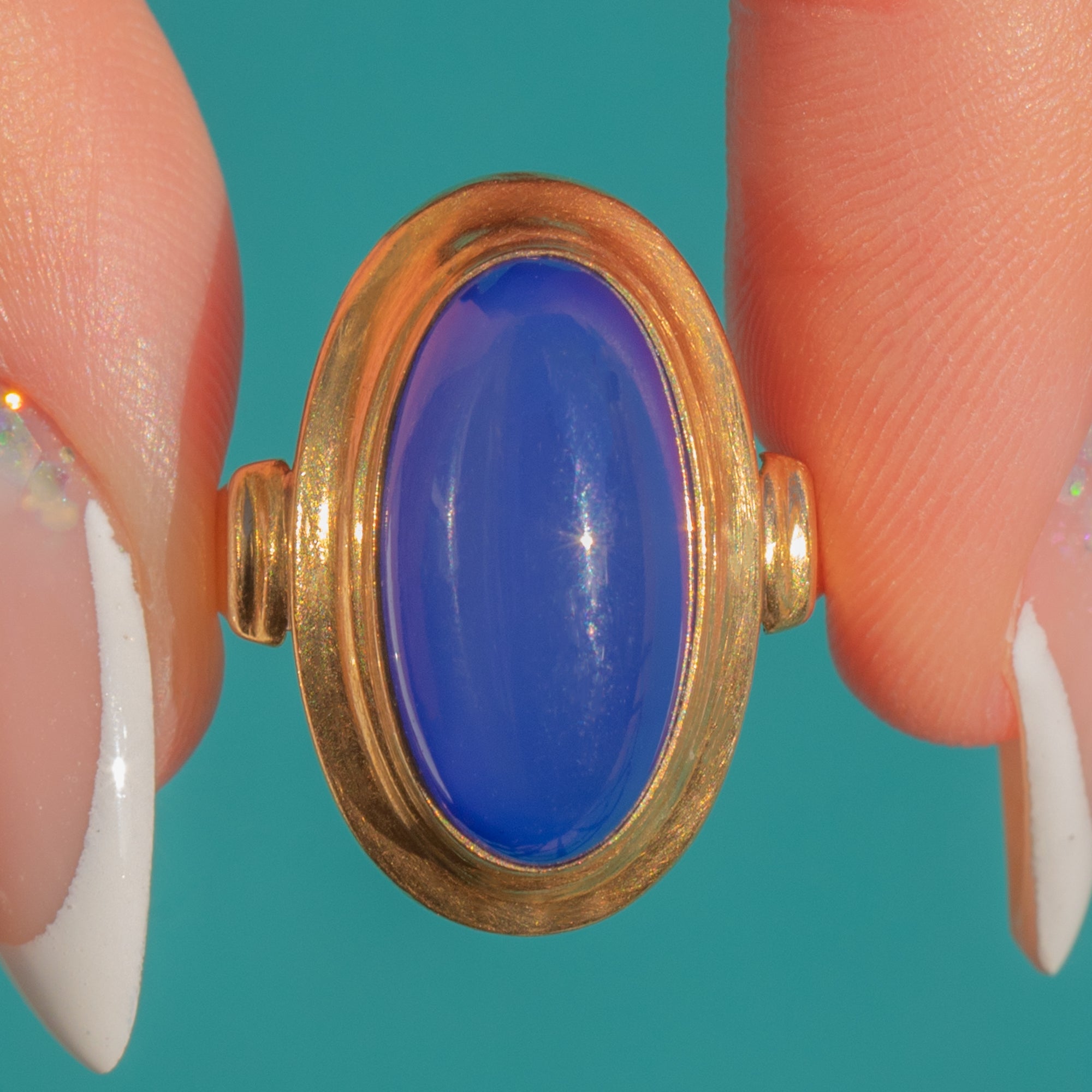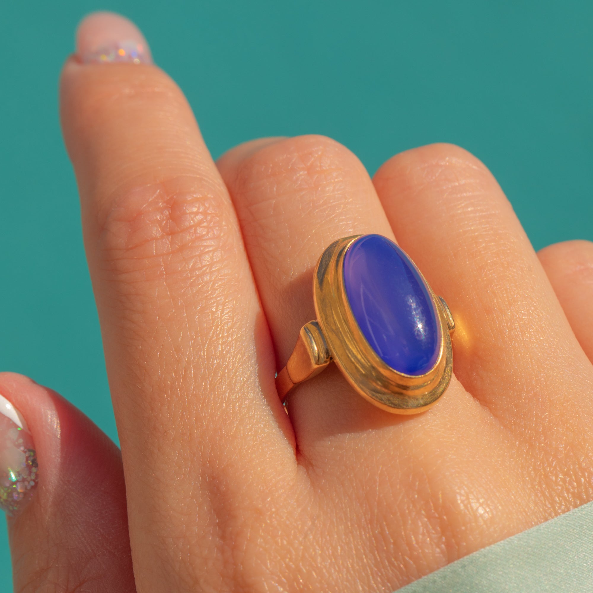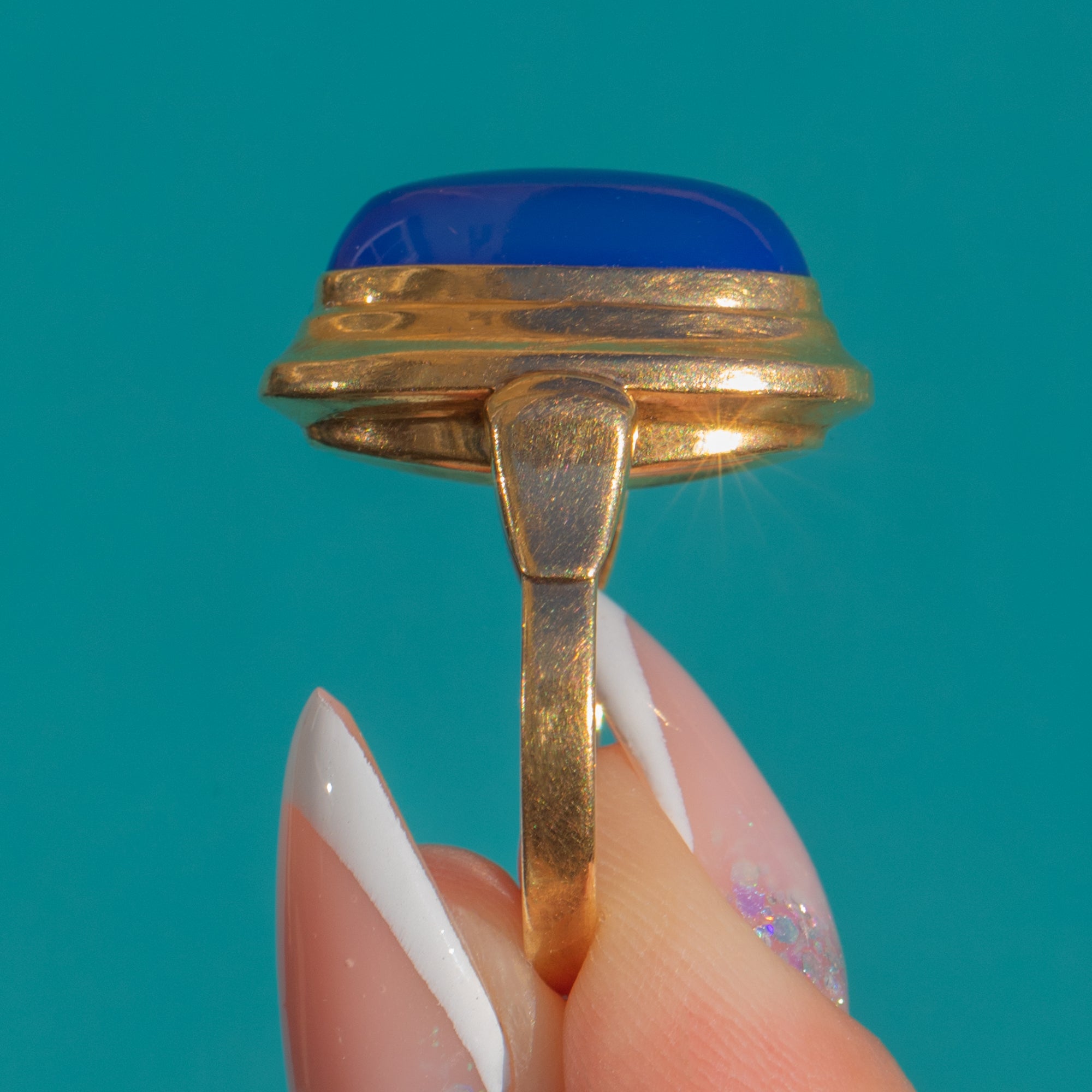 The elongated bezel setting gives the ring a wonderfully architectural silhouette, its smooth contours framing the lush Blue Chalcedony like a pool of cool, serene light. The rich Gold and luminous blue create a timeless, quietly luxurious contrast — refined, glamorous, and effortlessly wearable.