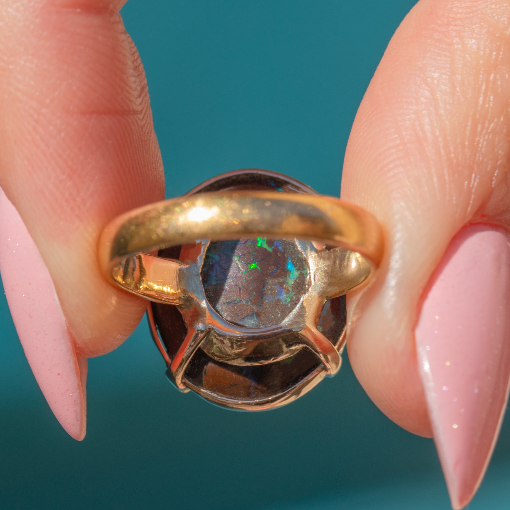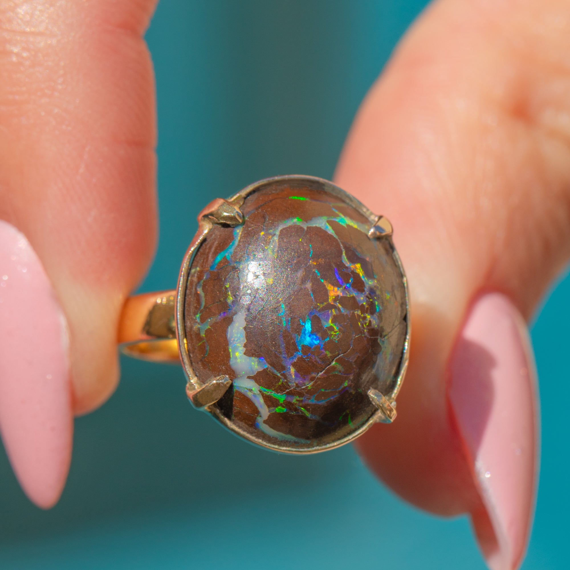 This 18ct Gold Boulder Opal dress ring is a beauty to behold! The smoothly cut Boulder Opal is mesmerising to look at, with sparkling electric blue, zingy greens, and pink hues peeking through her mahogany-toned surface.