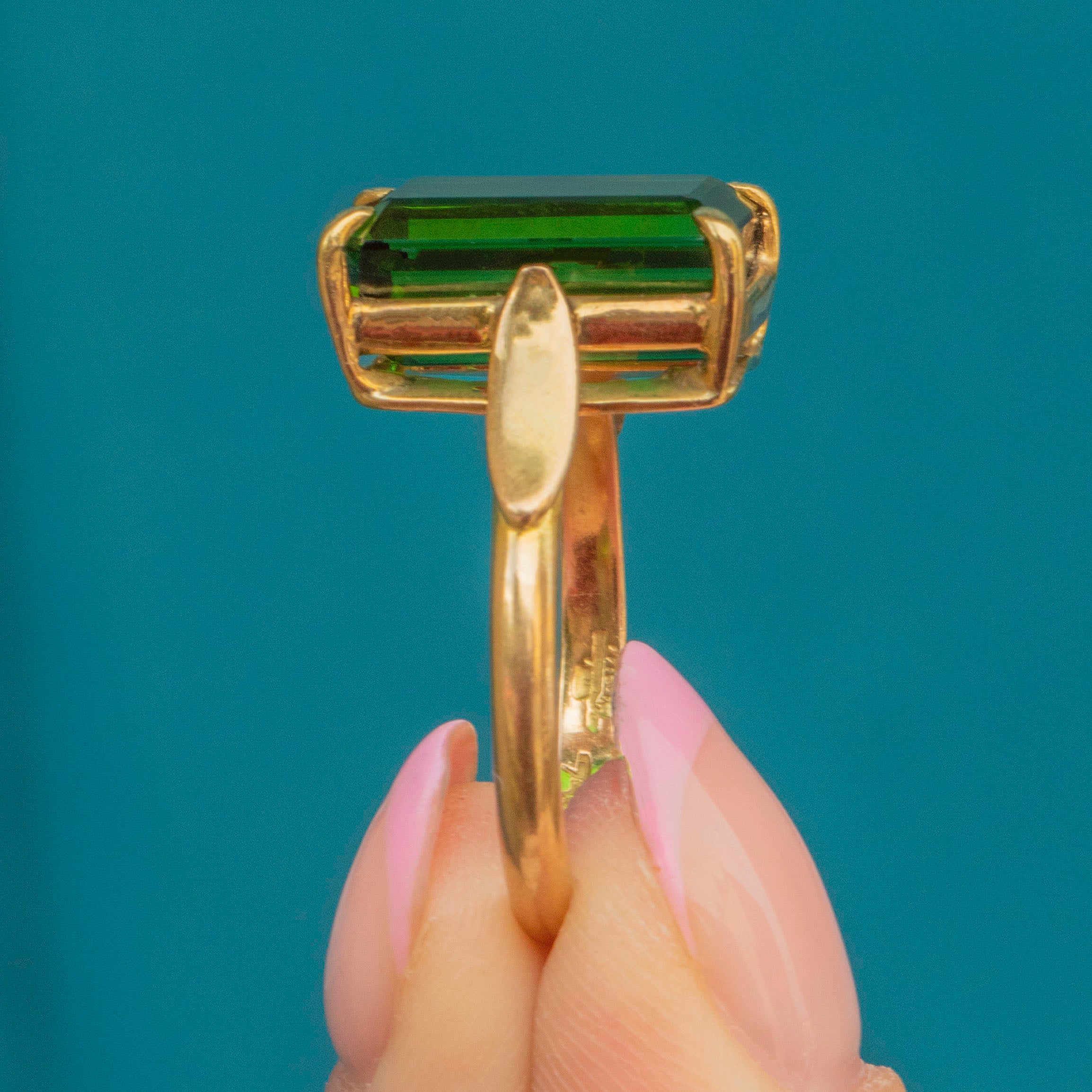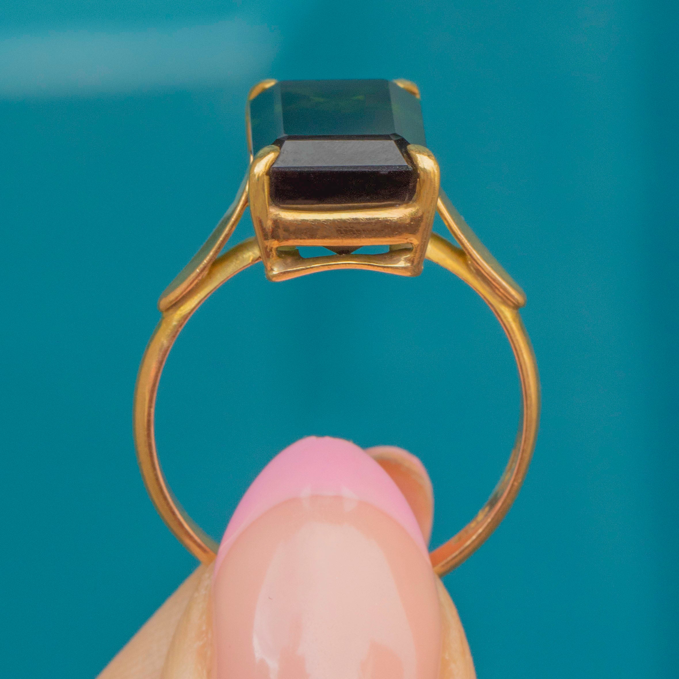 Expertly handcrafted, this rectangle Tourmaline perfectly fits with its architectural settings and amazing shoulders. The bright yellow band brings it all together to create a lovely, unique piece of Deco jewellery. If you're after an unusual and one-of-a-kind vintage engagement ring then look no further!