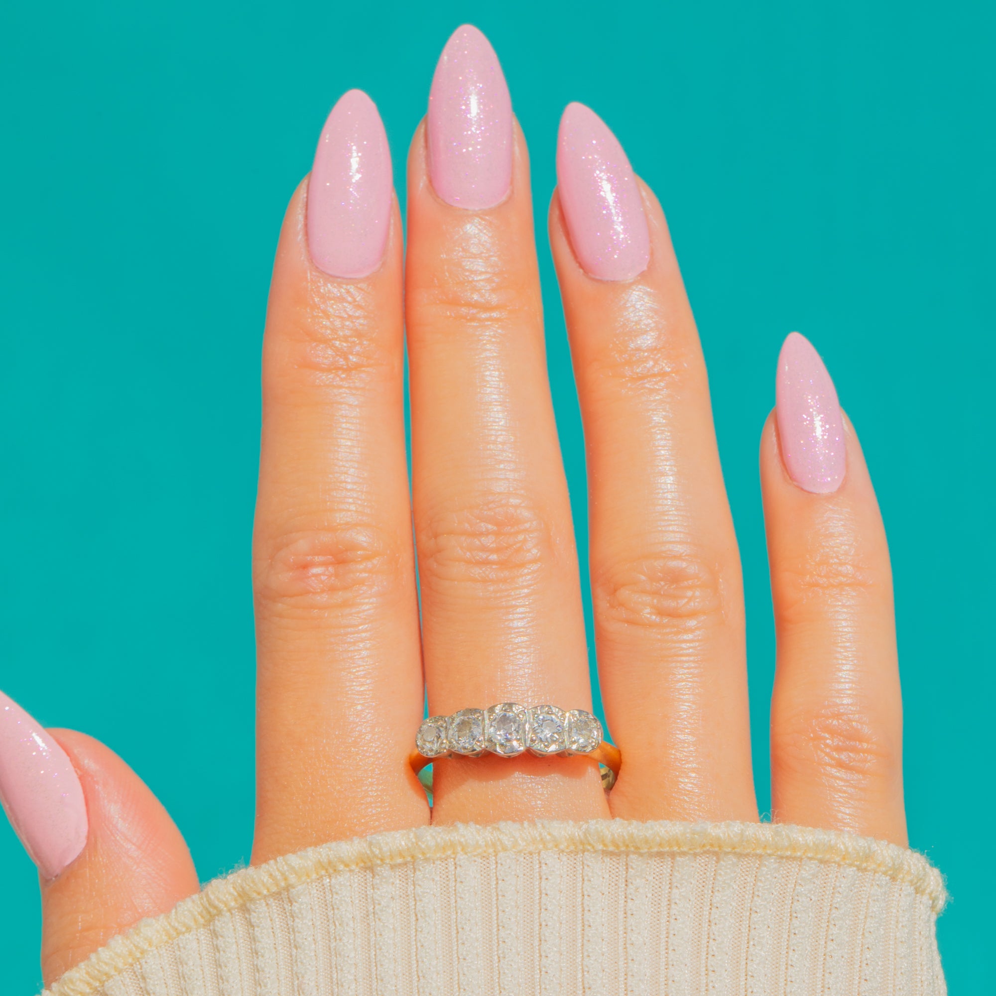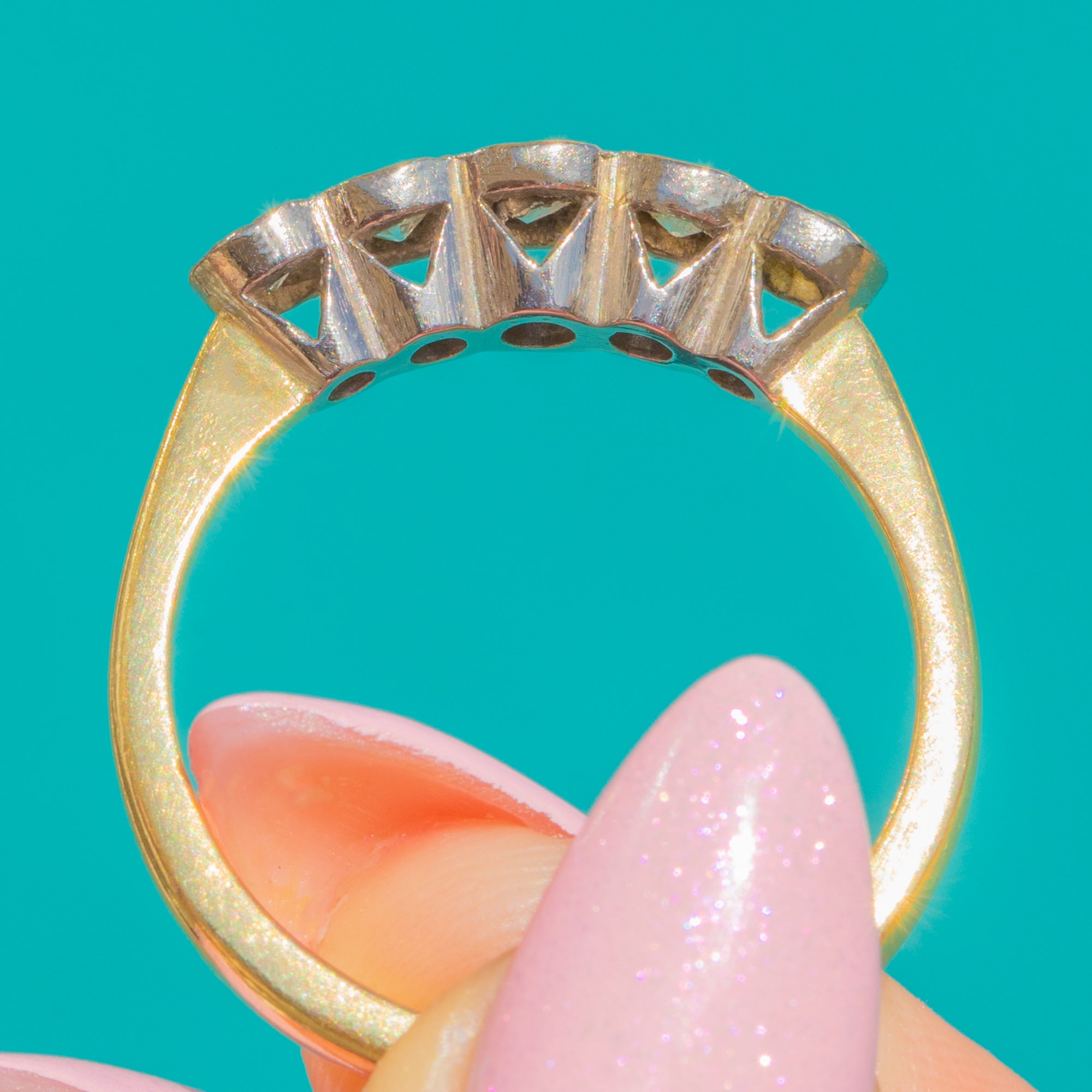 A timeless five-stone Diamond ring in luminous 18ct Yellow and White Gold. Five round Diamonds graduate gracefully across the finger with the centre slightly larger, each in a bright White Gold setting that amplifies their sparkle against the warm Yellow Gold shank. The low-profile silhouette is elegant, wearable and effortlessly chic.