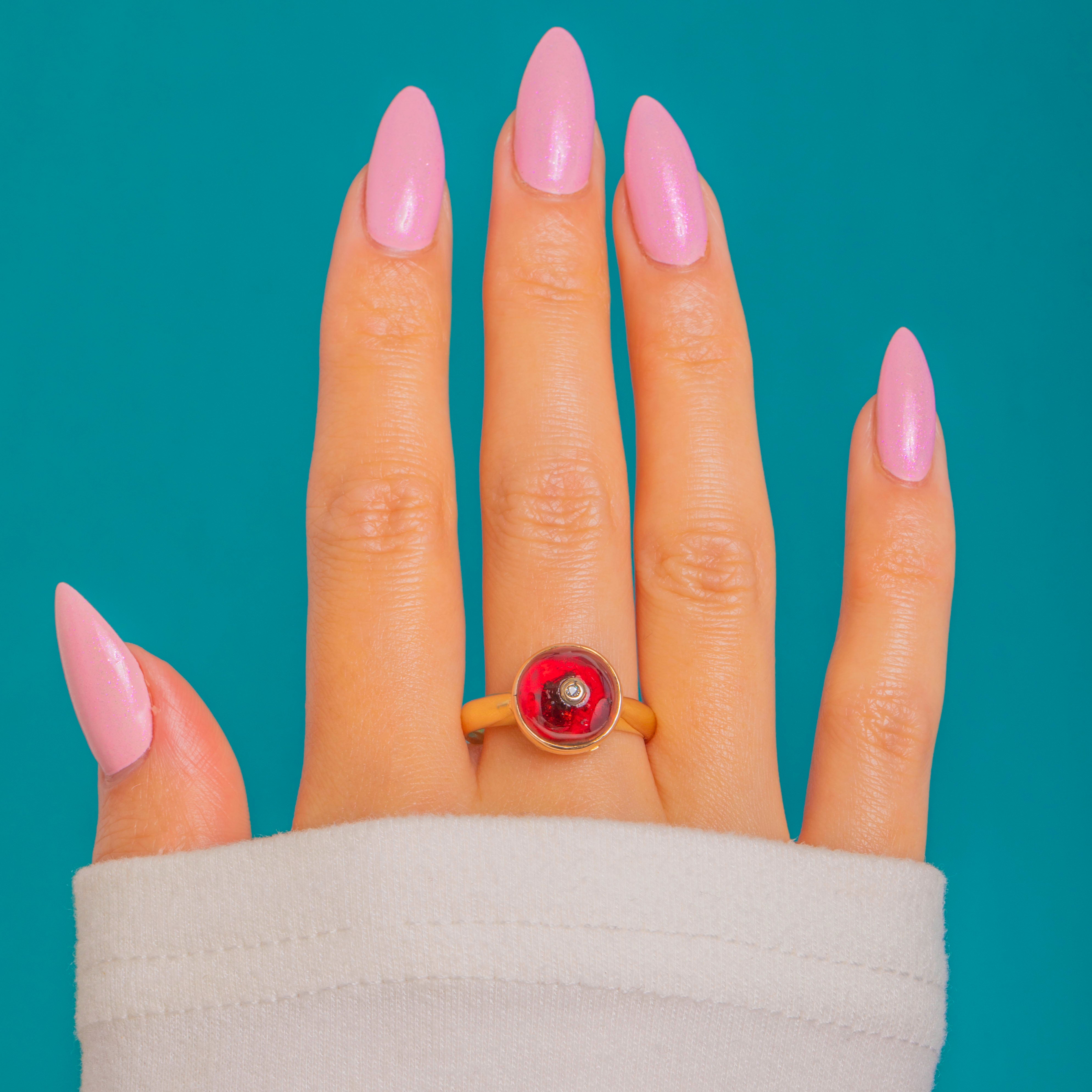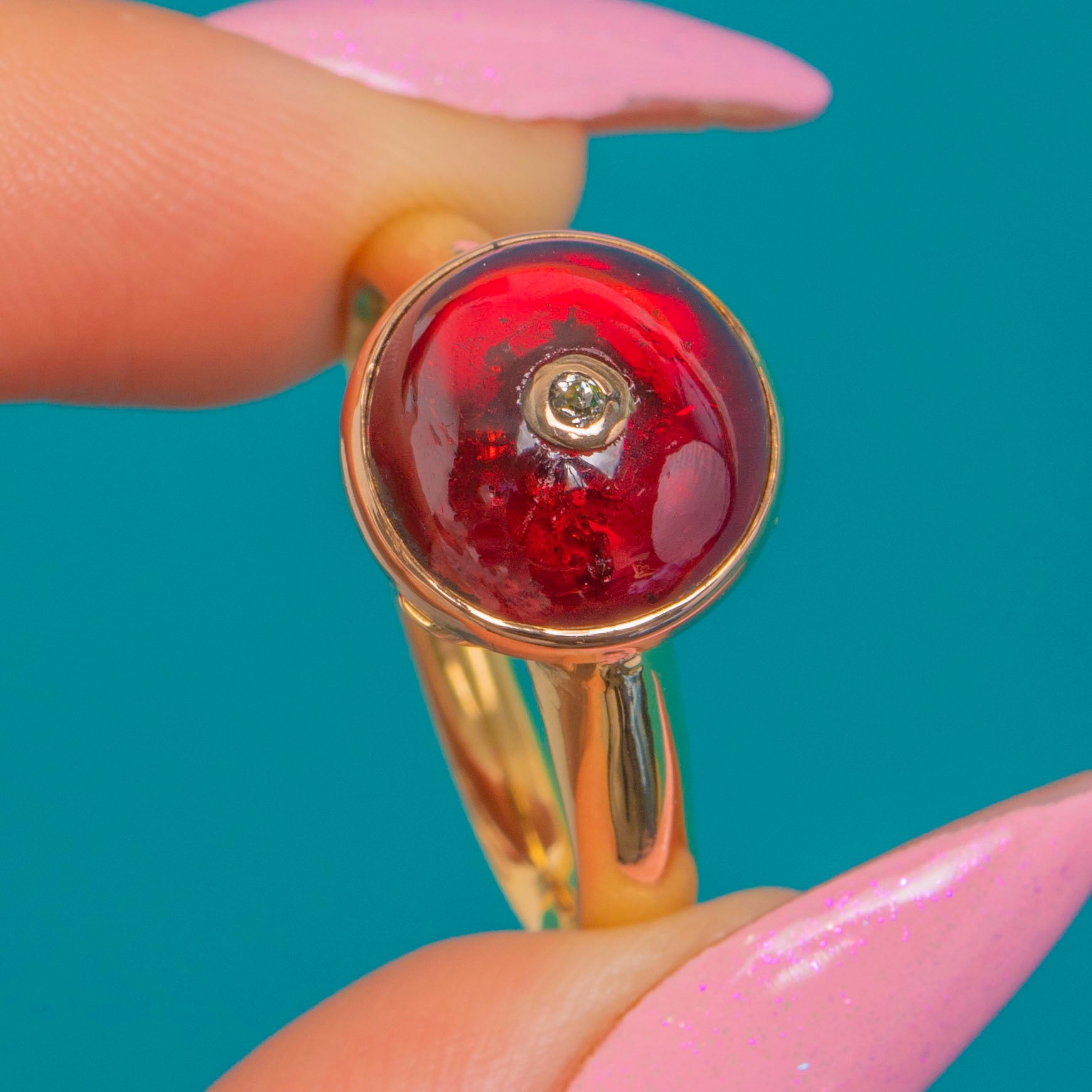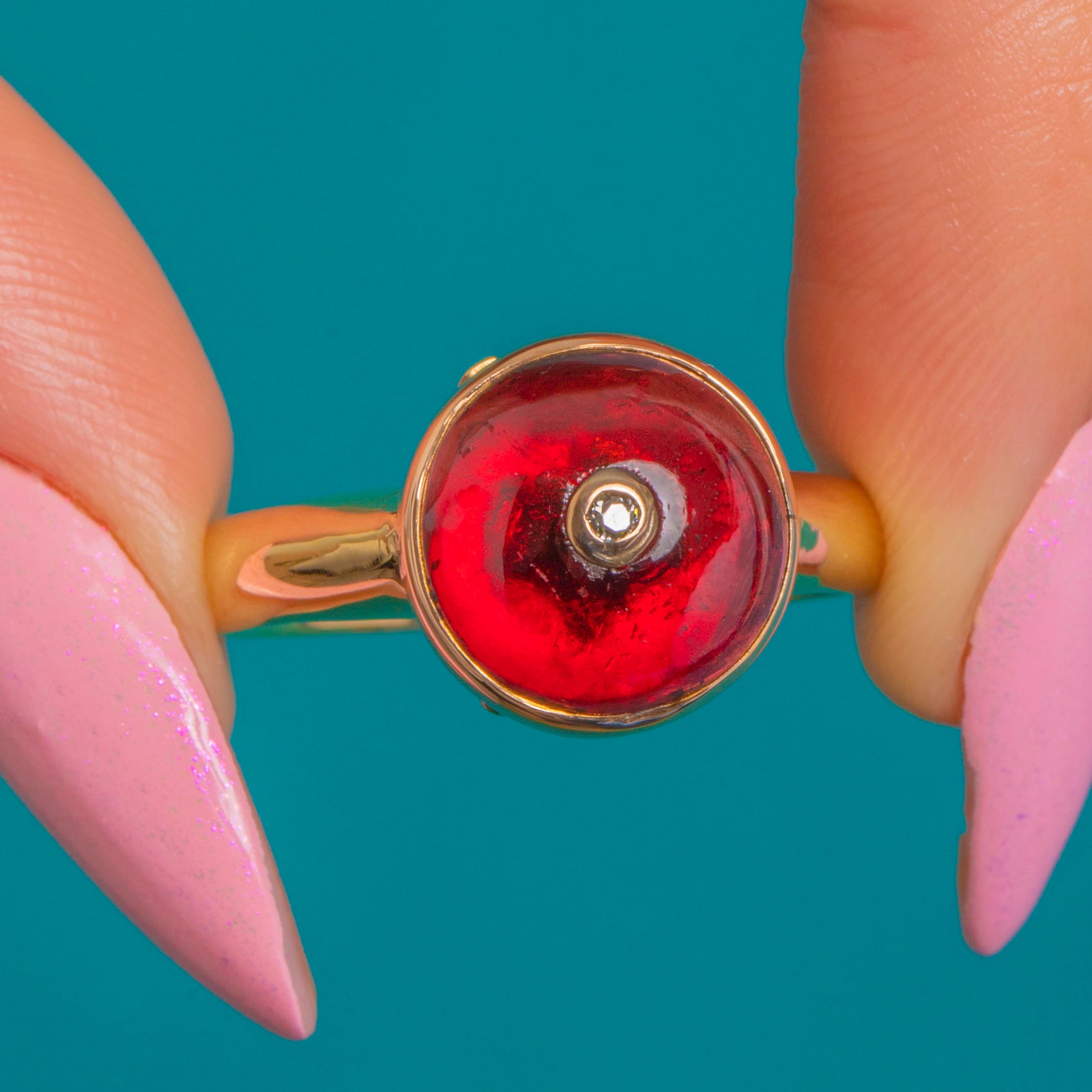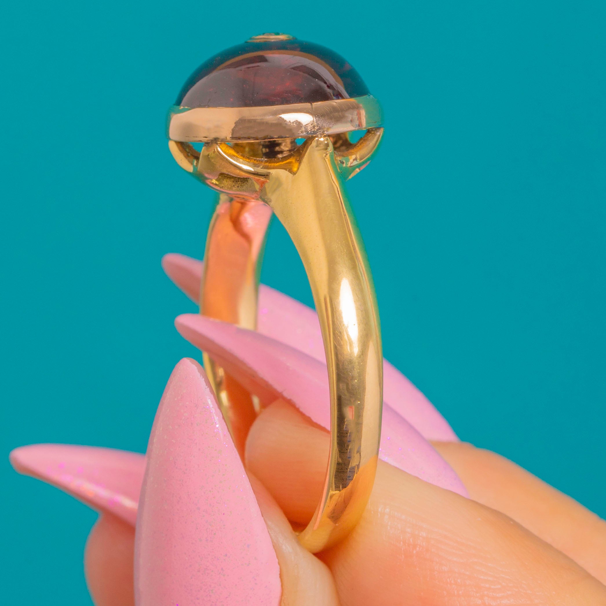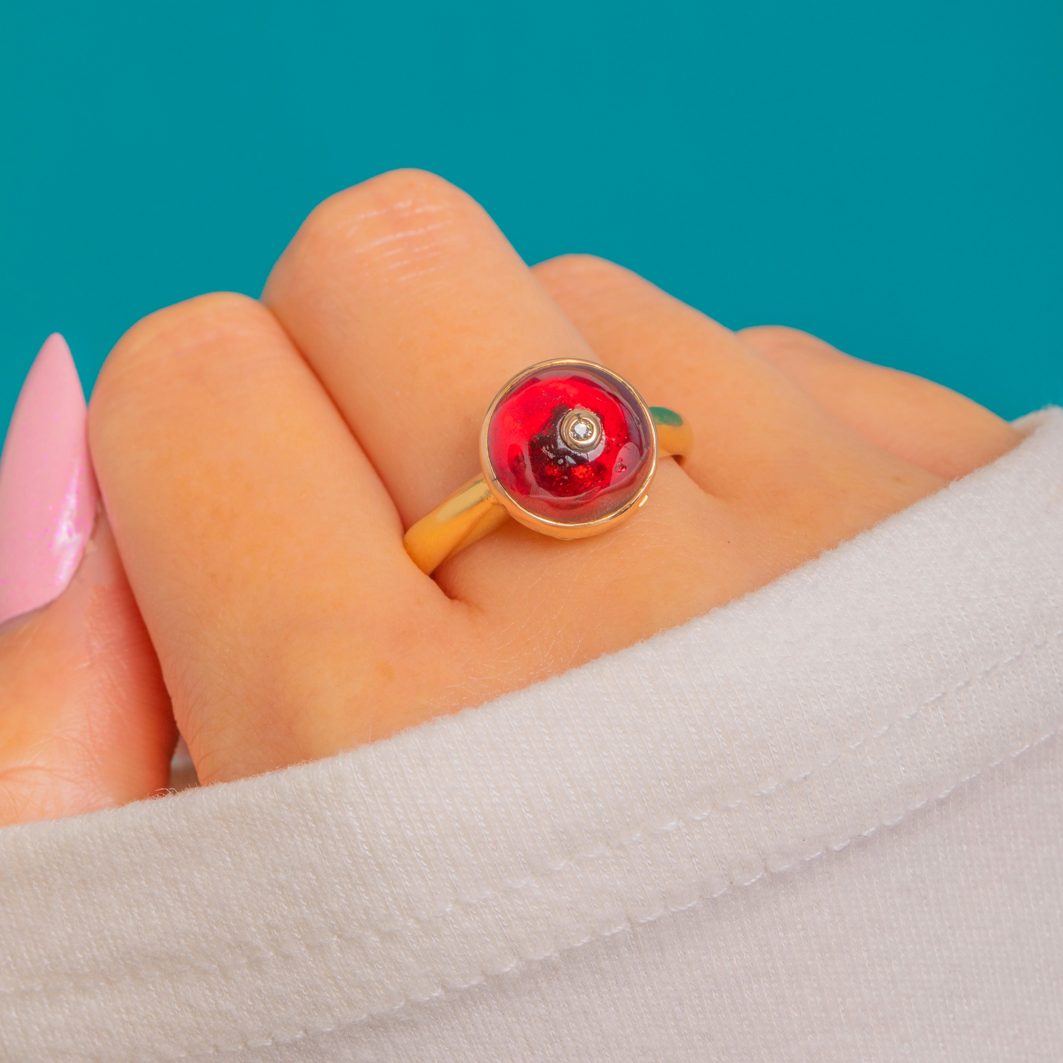 The translucent Garnet’s glossy dome is beautifully complemented by the warm Gold, while the central Diamond adds a crisp sparkle for balance. Clean lines, a rounded shank and a compact, wearable silhouette make this a luxurious statement piece.