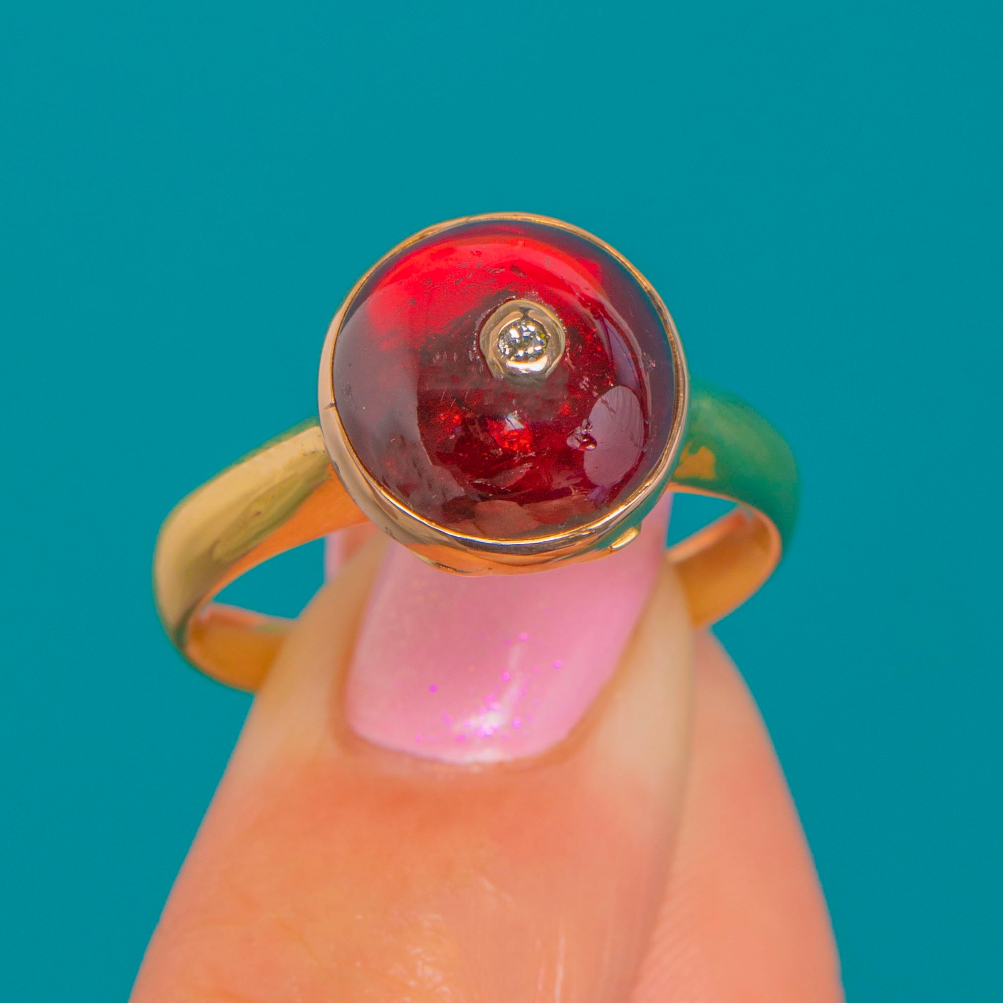 EXCELLENT: The Garnet cabochon is secure with a bright, glossy dome; under magnification, it shows light surface wear and internal characteristics only, with no chips or cracks. The Diamond is lively and well-set. The 18ct Gold bezel and shank display minimal surface wear consistent with age, with no signs of repair or resizing; the band remains sturdy and true.