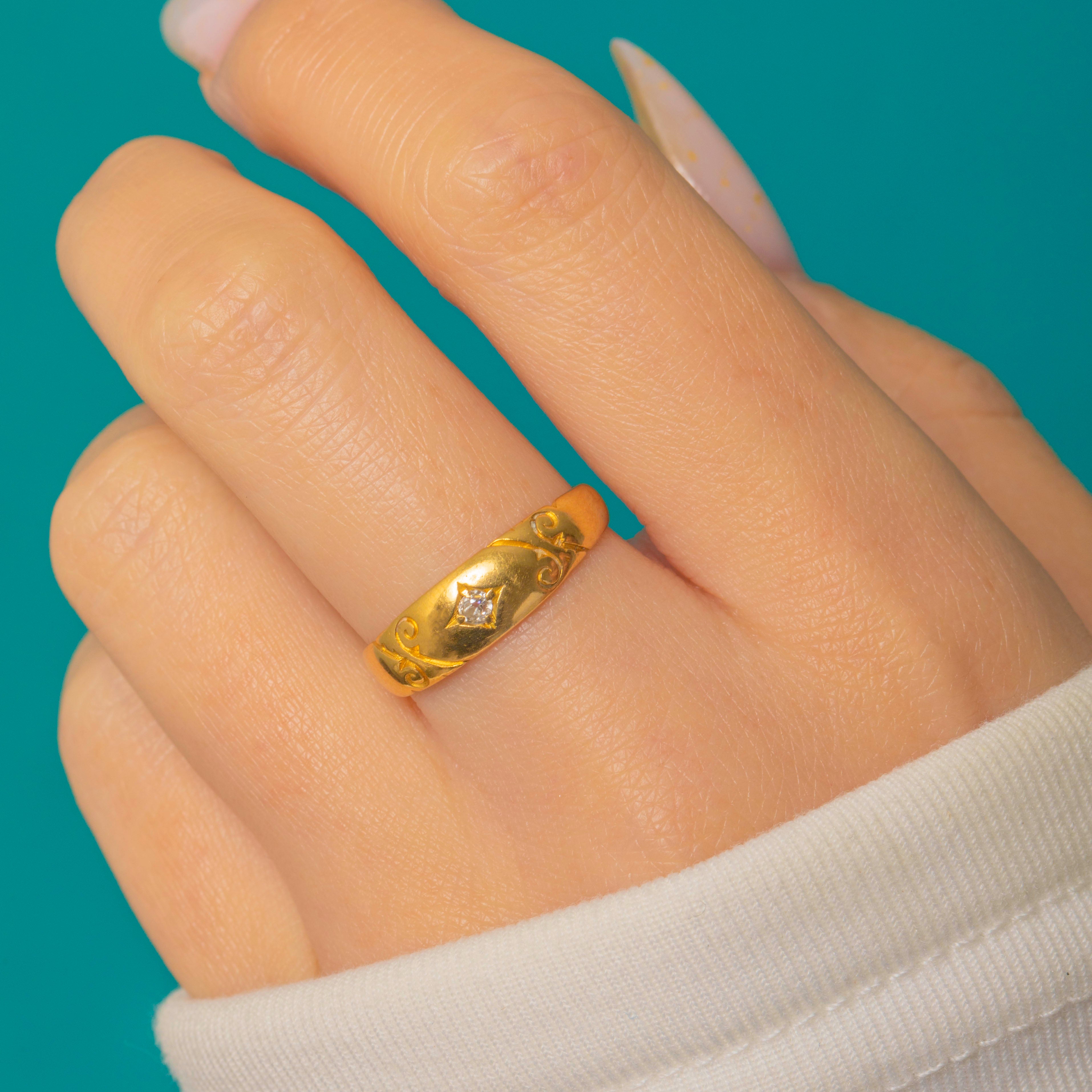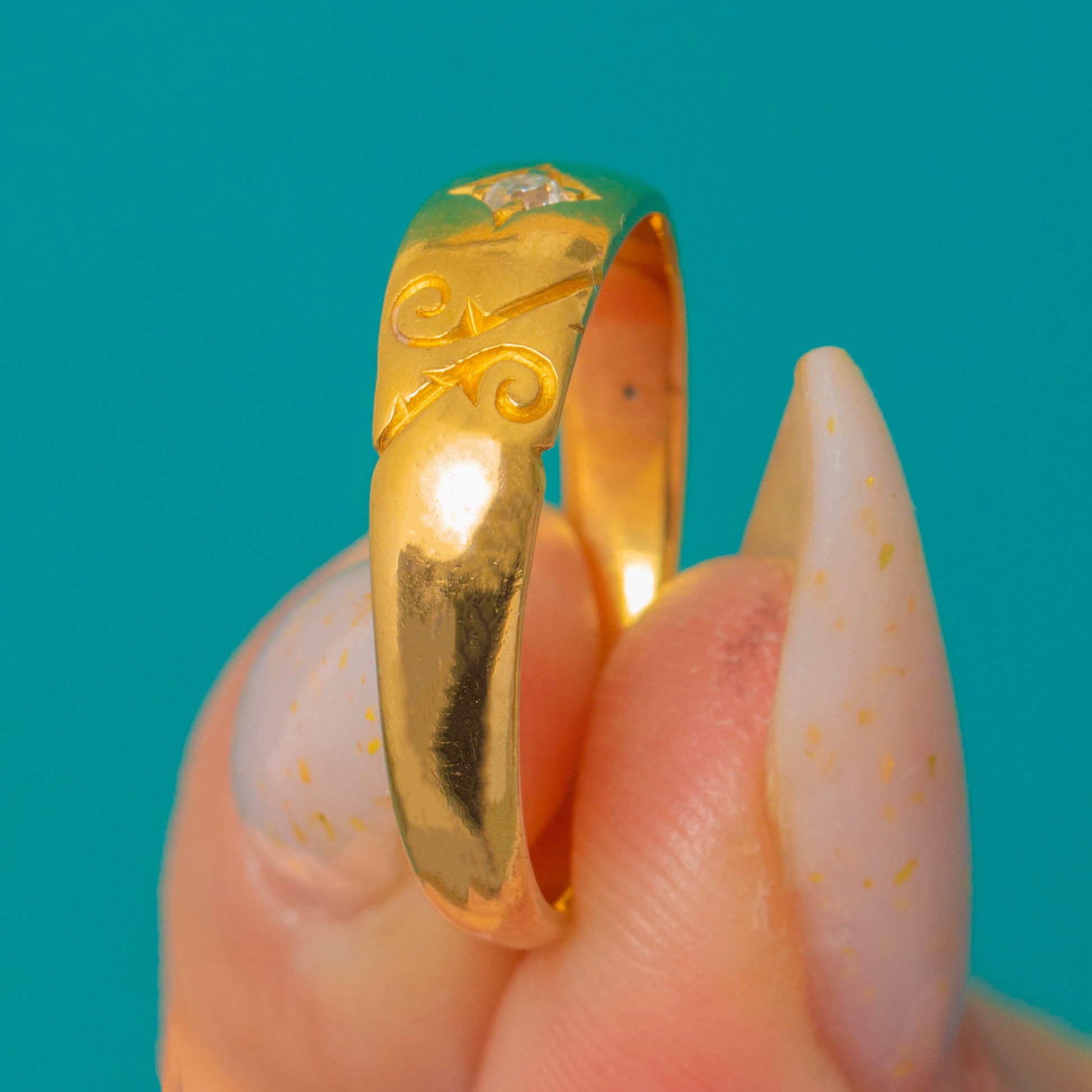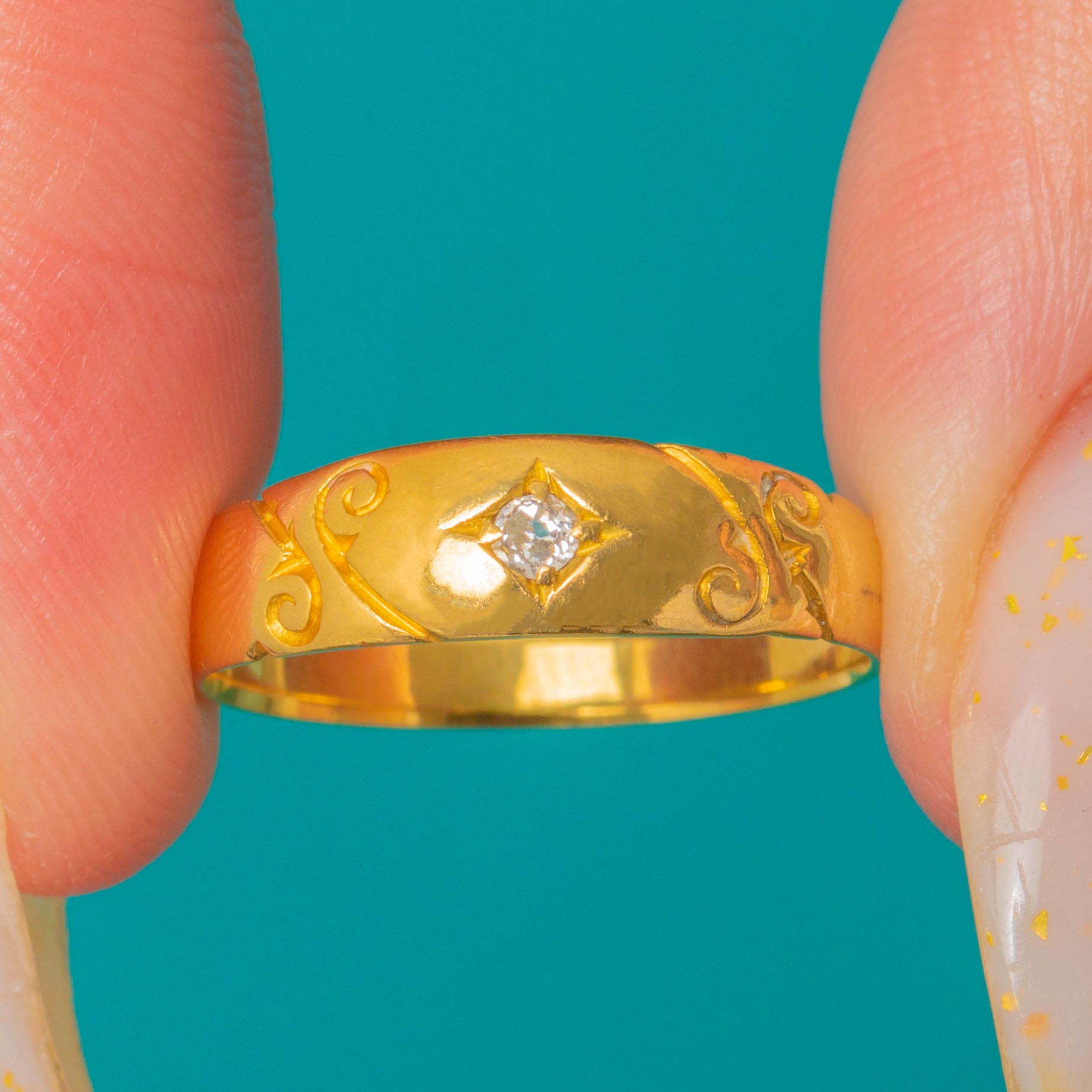 EXCELLENT: The Old Mine Cut Diamond is bright and secure with no chips or noticeable abrasions, retaining crisp facet definition. The 18ct Gold band is in excellent condition with light surface marks and gentle softening to high points consistent with age; the engraved details remain clear. No evidence of resizing or restoration observed.