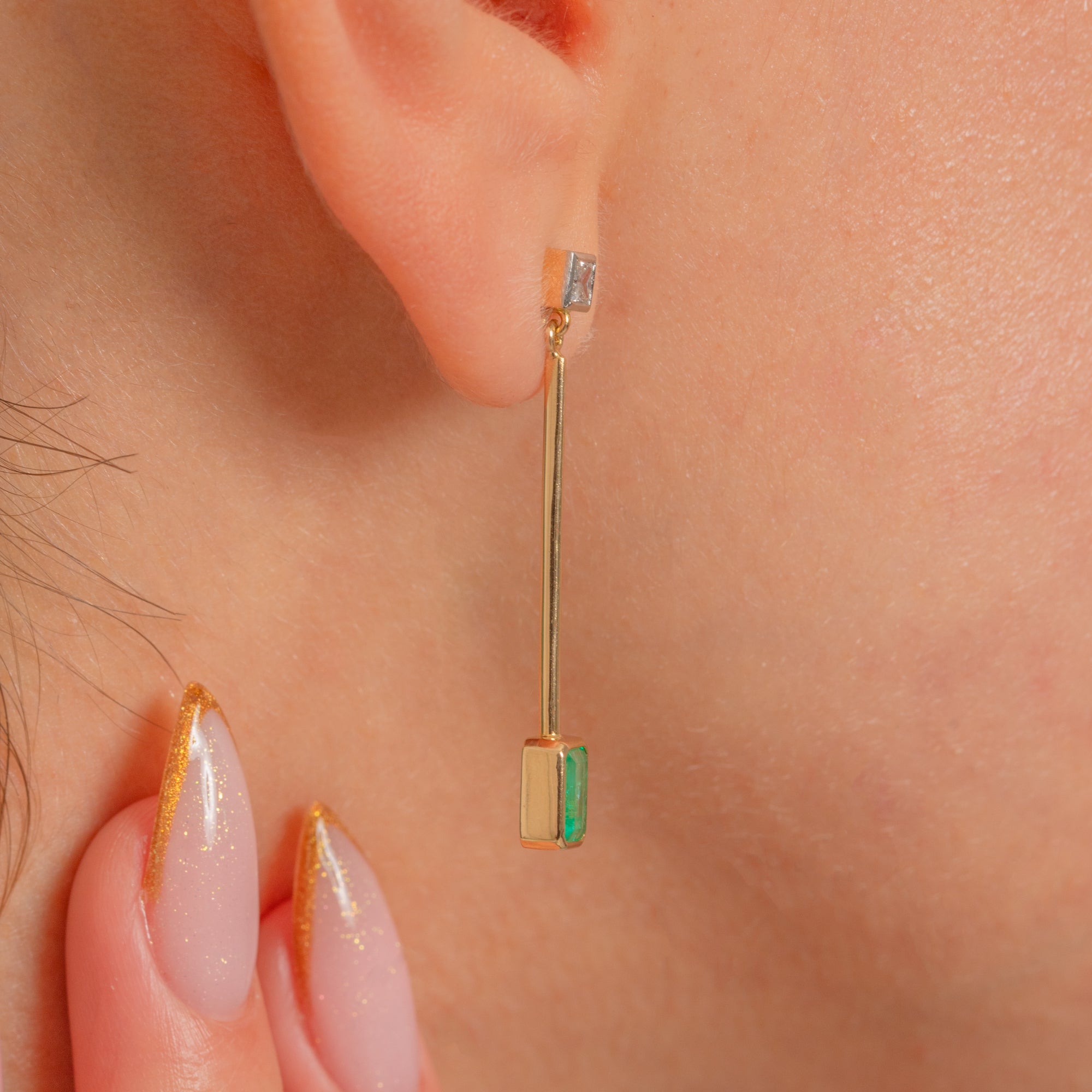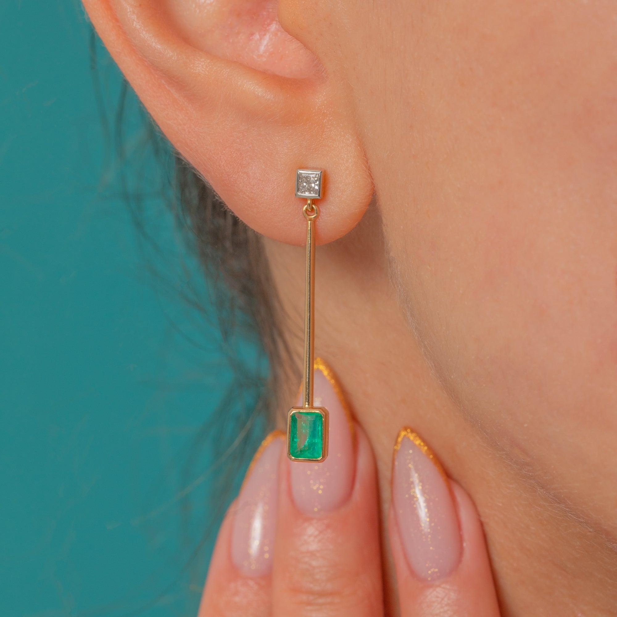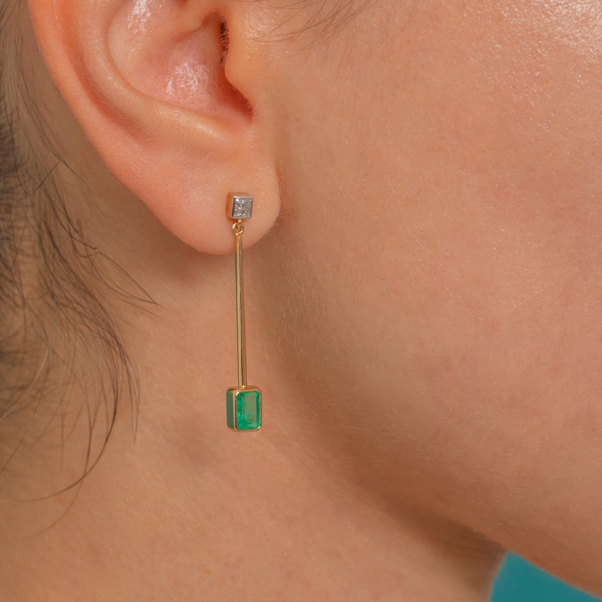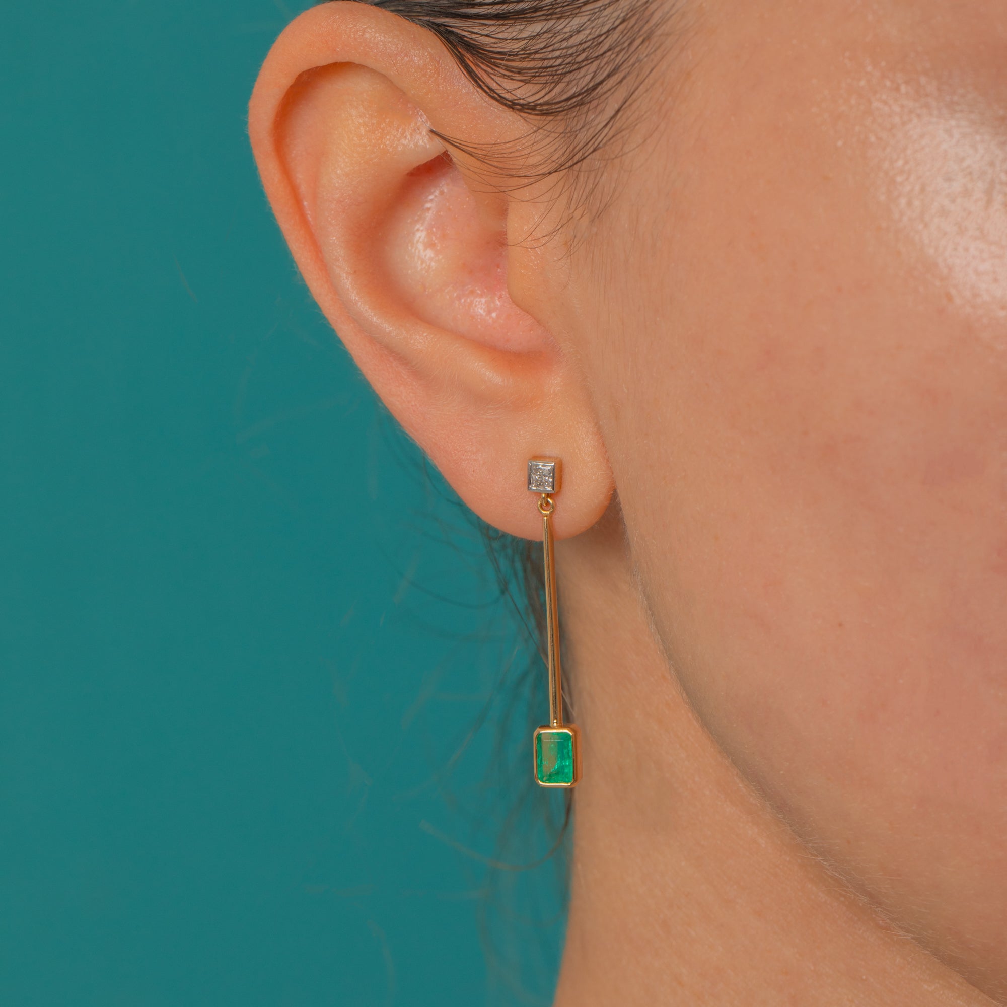 These elegant 18ct Gold drop earrings pair timeless sophistication with modern minimalism. Each earring features a vivid green Emerald suspended from a fine 18ct Gold bar, topped by a sparkling Diamond stud. The sleek geometric design gives them a contemporary edge, while the luxurious materials ensure enduring beauty and brilliance.