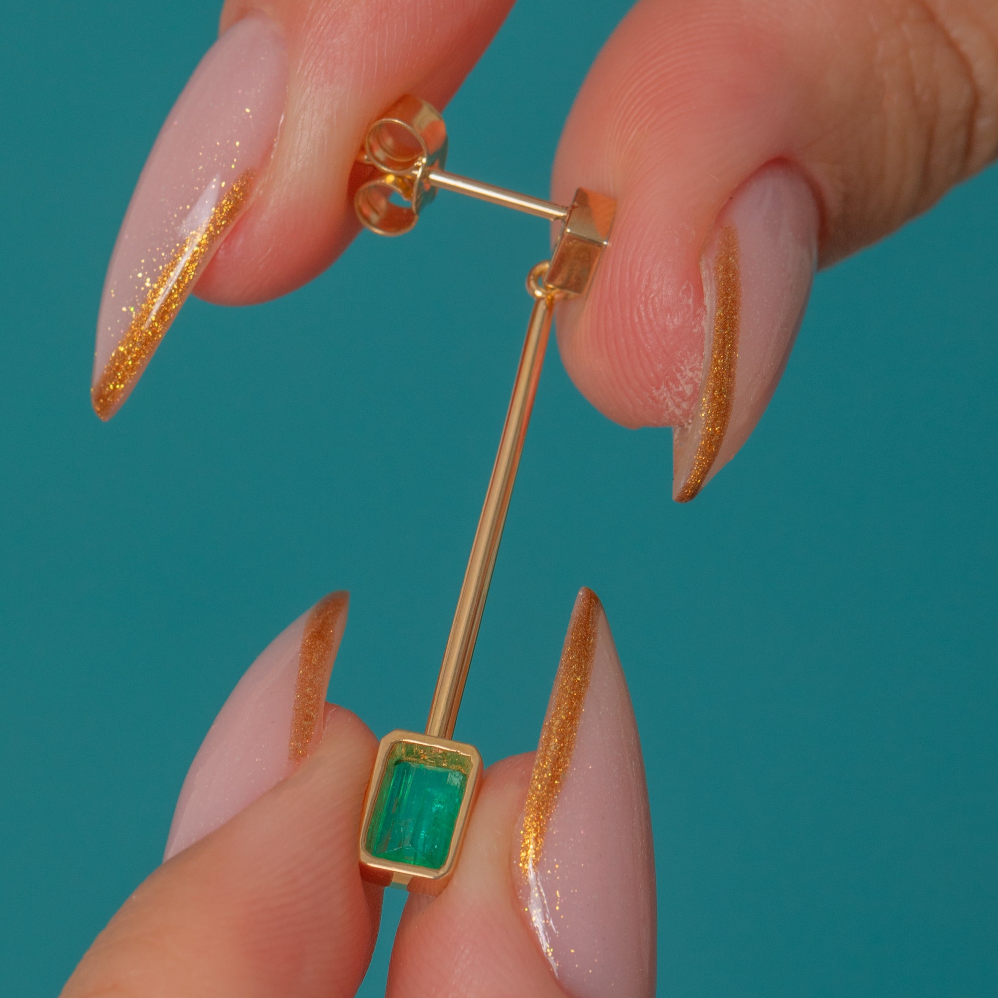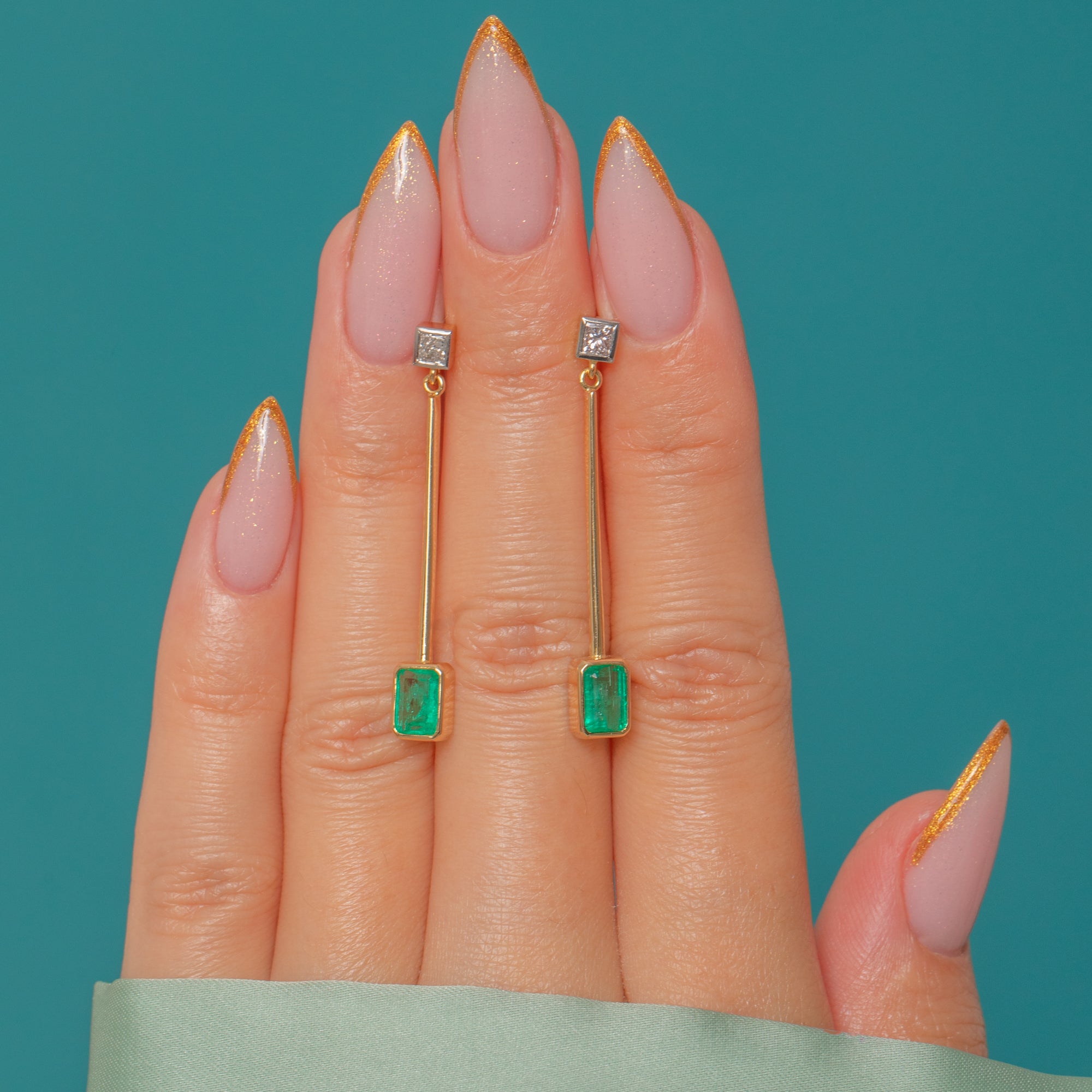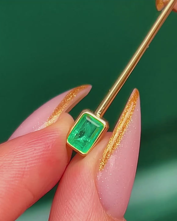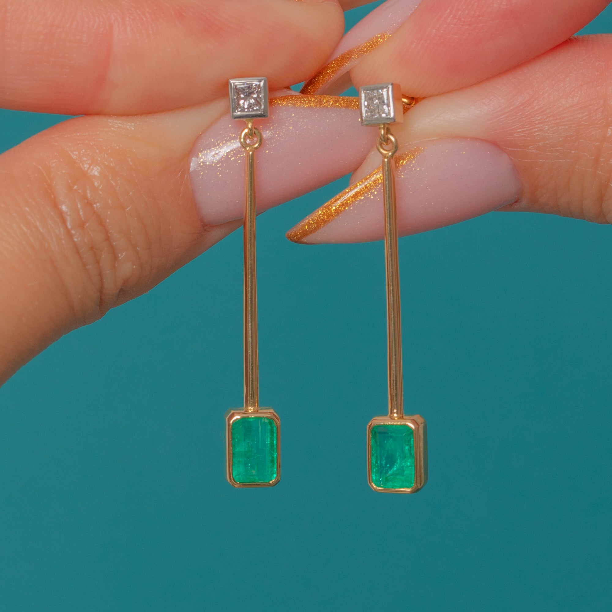 These elegant 18ct Gold drop earrings pair timeless sophistication with modern minimalism. Each earring features a vivid green Emerald suspended from a fine 18ct Gold bar, topped by a sparkling Diamond stud. The sleek geometric design gives them a contemporary edge, while the luxurious materials ensure enduring beauty and brilliance.