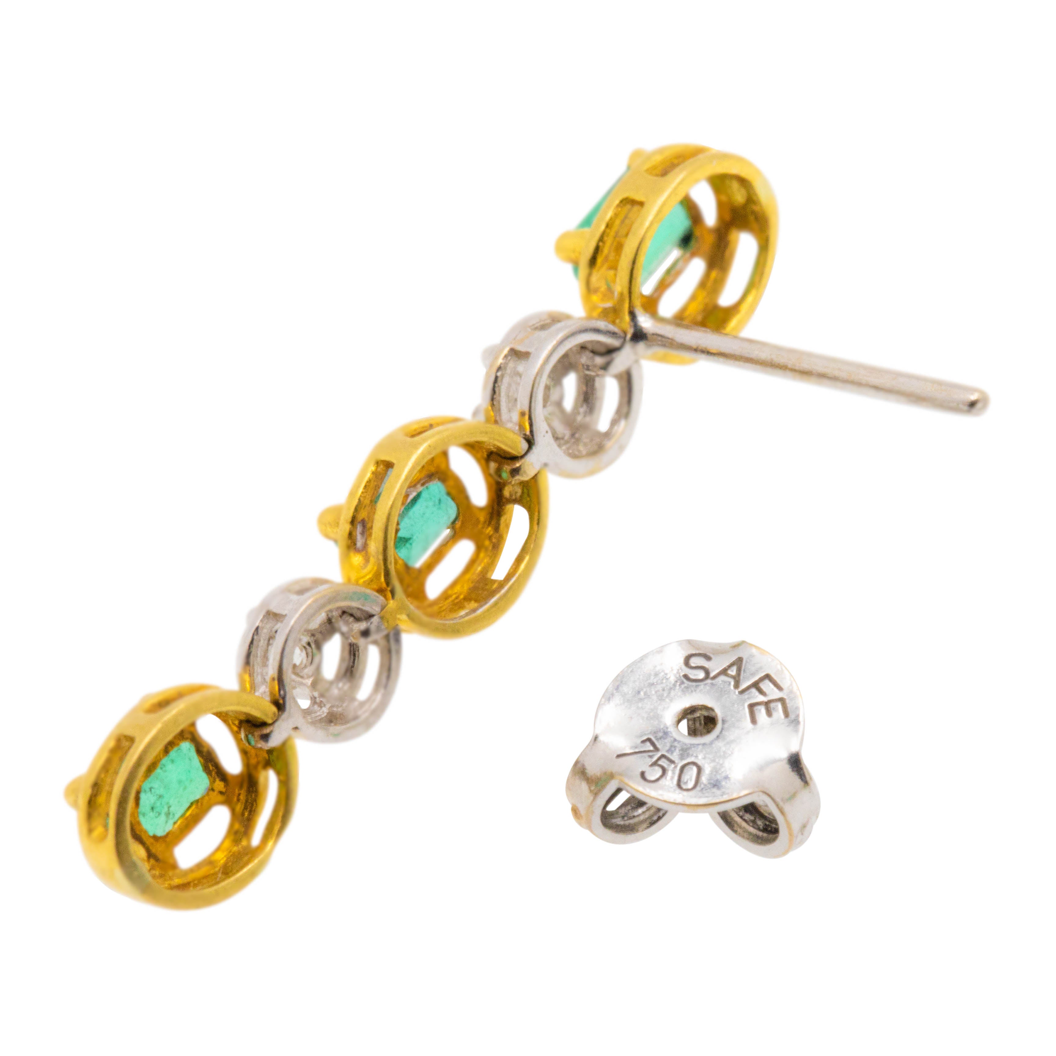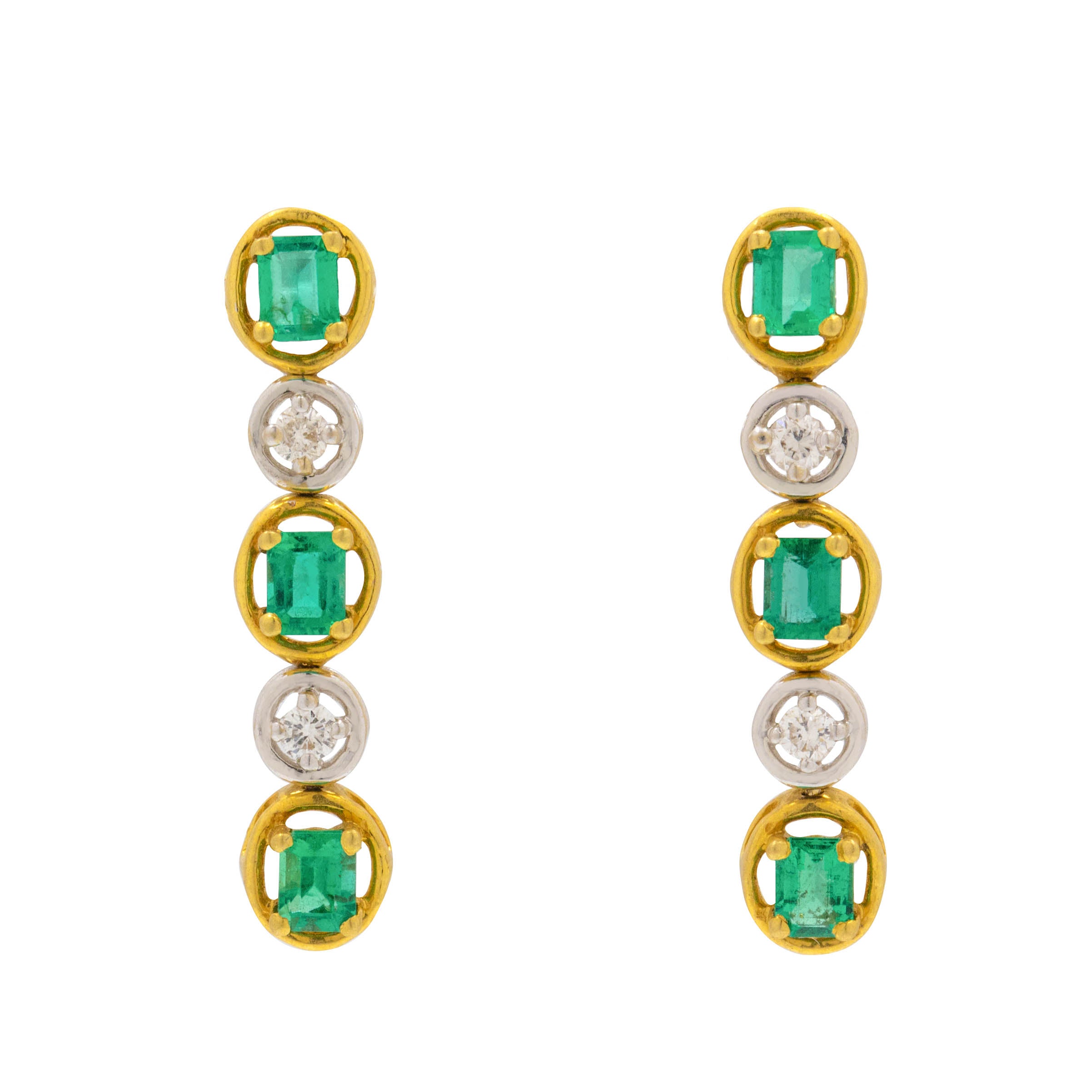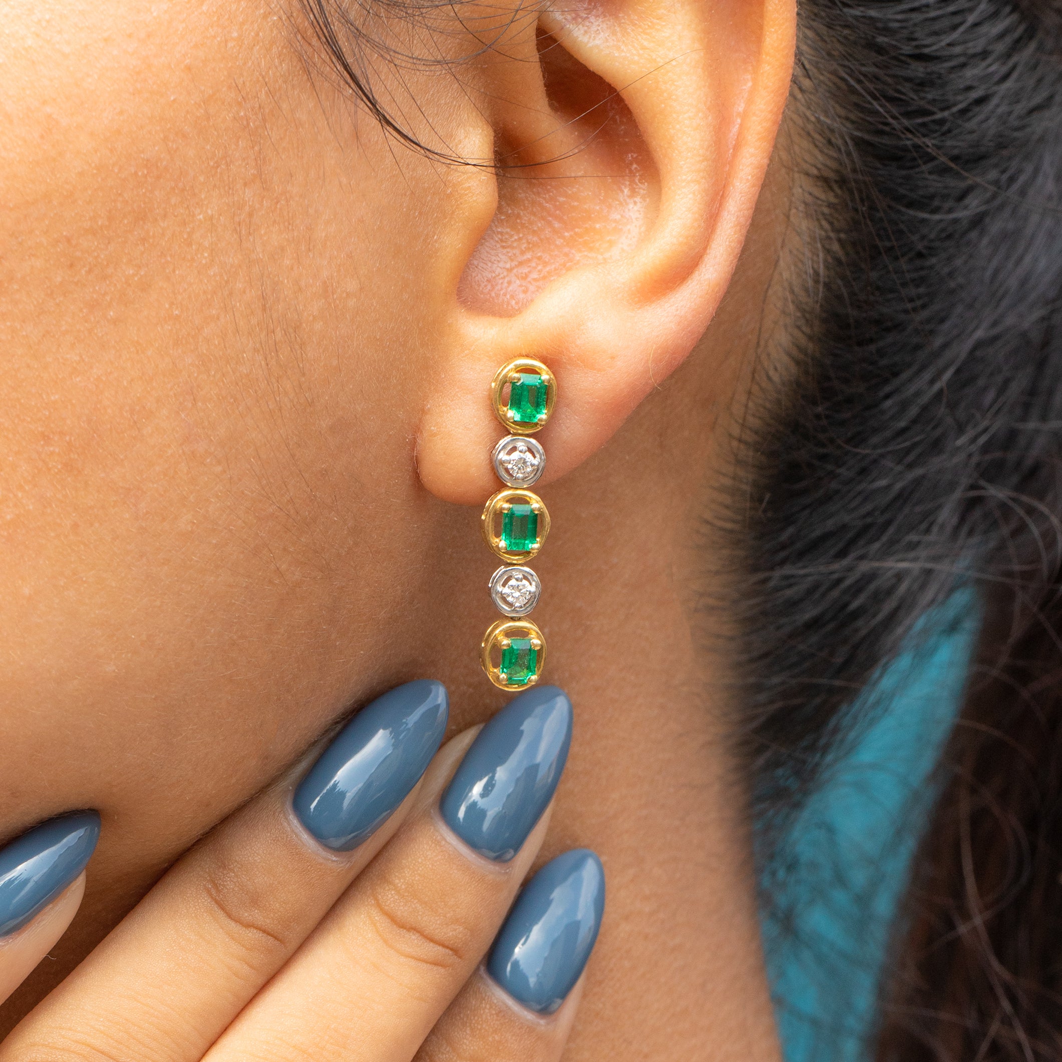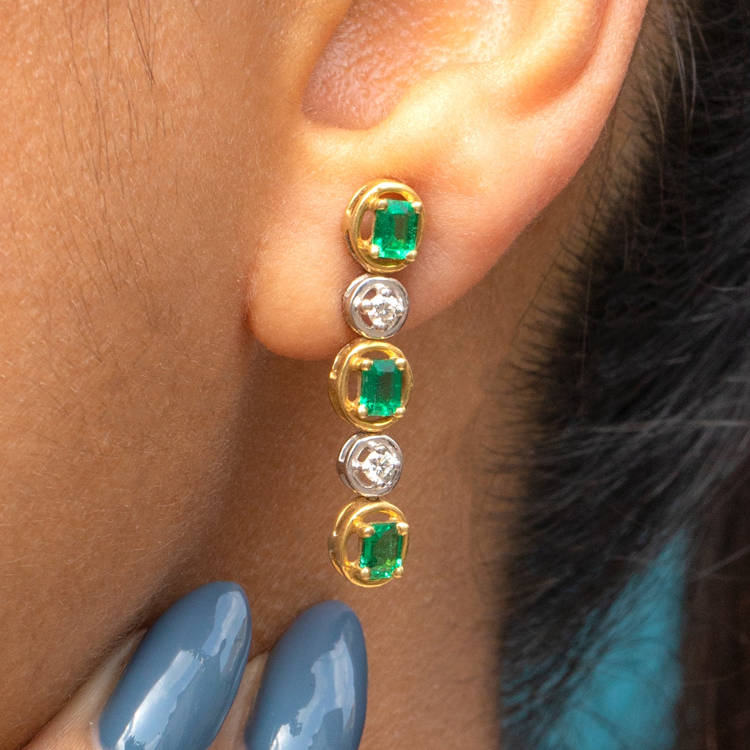 These 18ct Gold Emerald Diamond drop earrings demand attention! Boasting fern green Emeralds alternating with glistening Diamonds, these mid century earrings are crafted from 18ct Yellow and White Gold giving these earrings a contemporary flare.