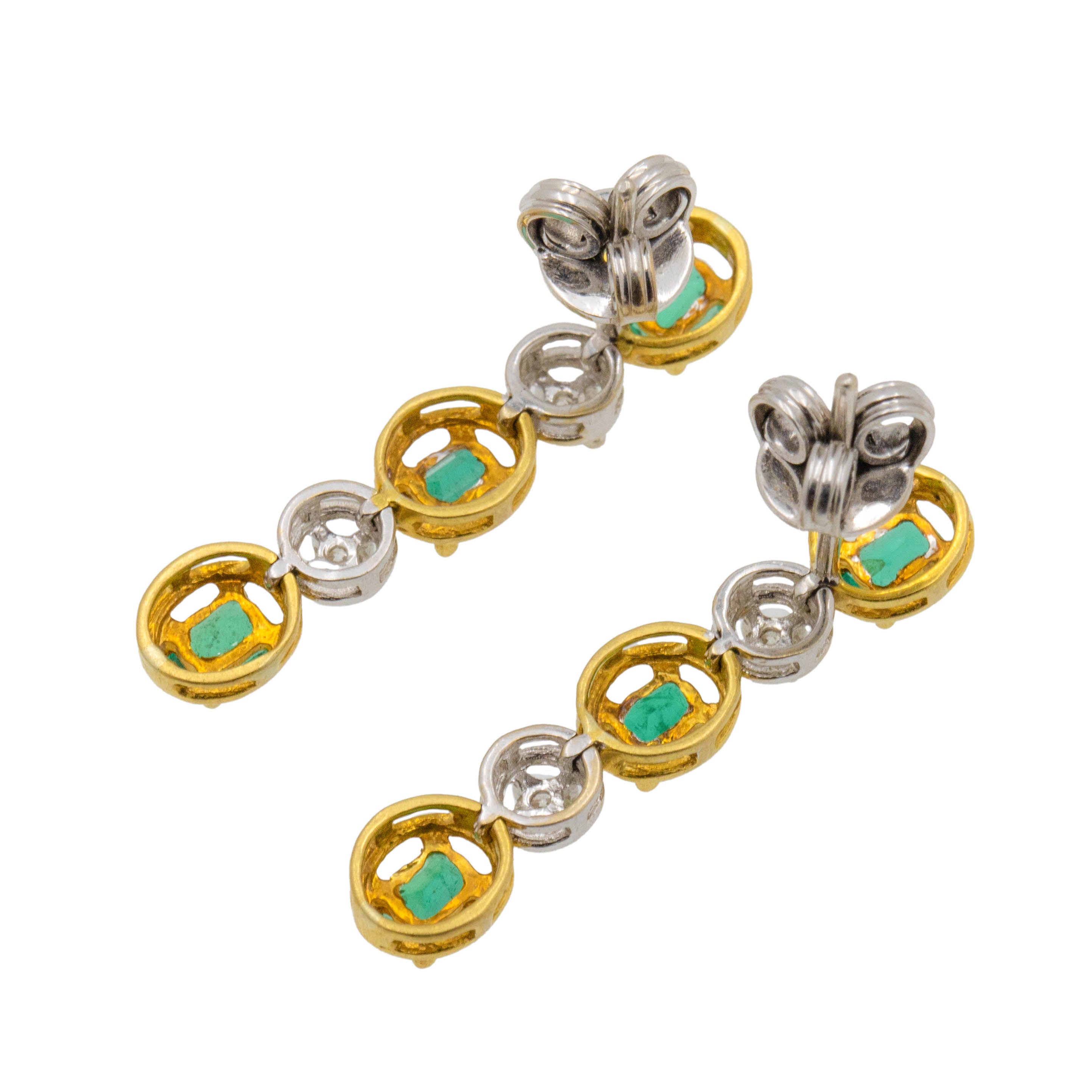 EXCELLENT. These 18ct Gold Emerald Diamond drop earrings are in excellent condition! The Emeralds and Diamonds are all secure within their setting and free from any wear, with their dazzling hues complimenting one another to perfection. The Emeralds have admirable inclusions, adding to their vintage charm. The yellow and white Gold are firmly connected, free from any dings or dents to note. With sturdy and secure-fitting butterfly backs, you can wear these Vintage Diamond earrings with confidence!