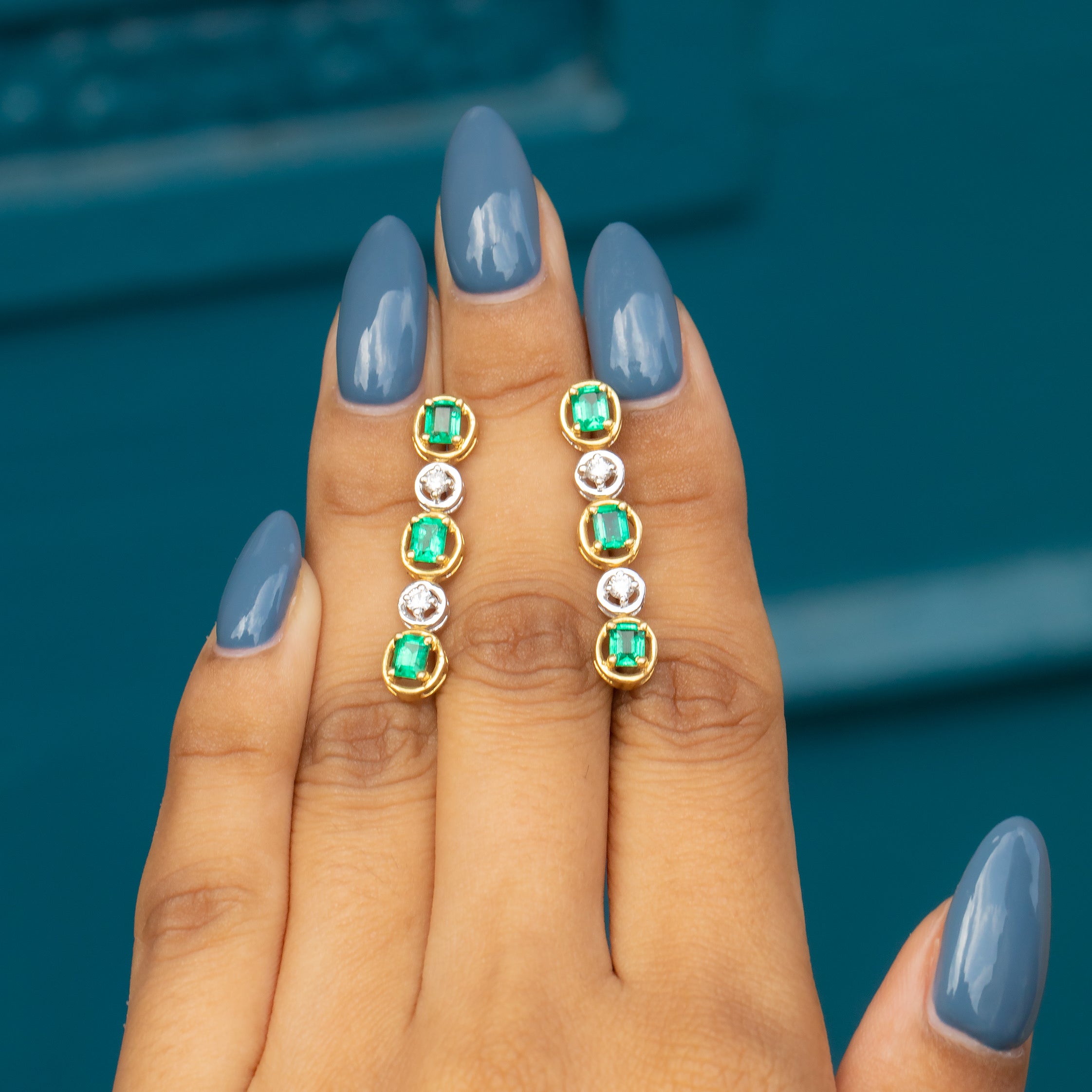 The open work design of their settings allows the light to stream through from every angle, creating a wonderful display of sparkle. The slender form of these Gold Emerald earrings trickles down your lobes, providing an effortless fluidity and elegance to your ear stack. If you are looking for that perfect pair to accompany your evening attire, these lovely ladies are the one for you!