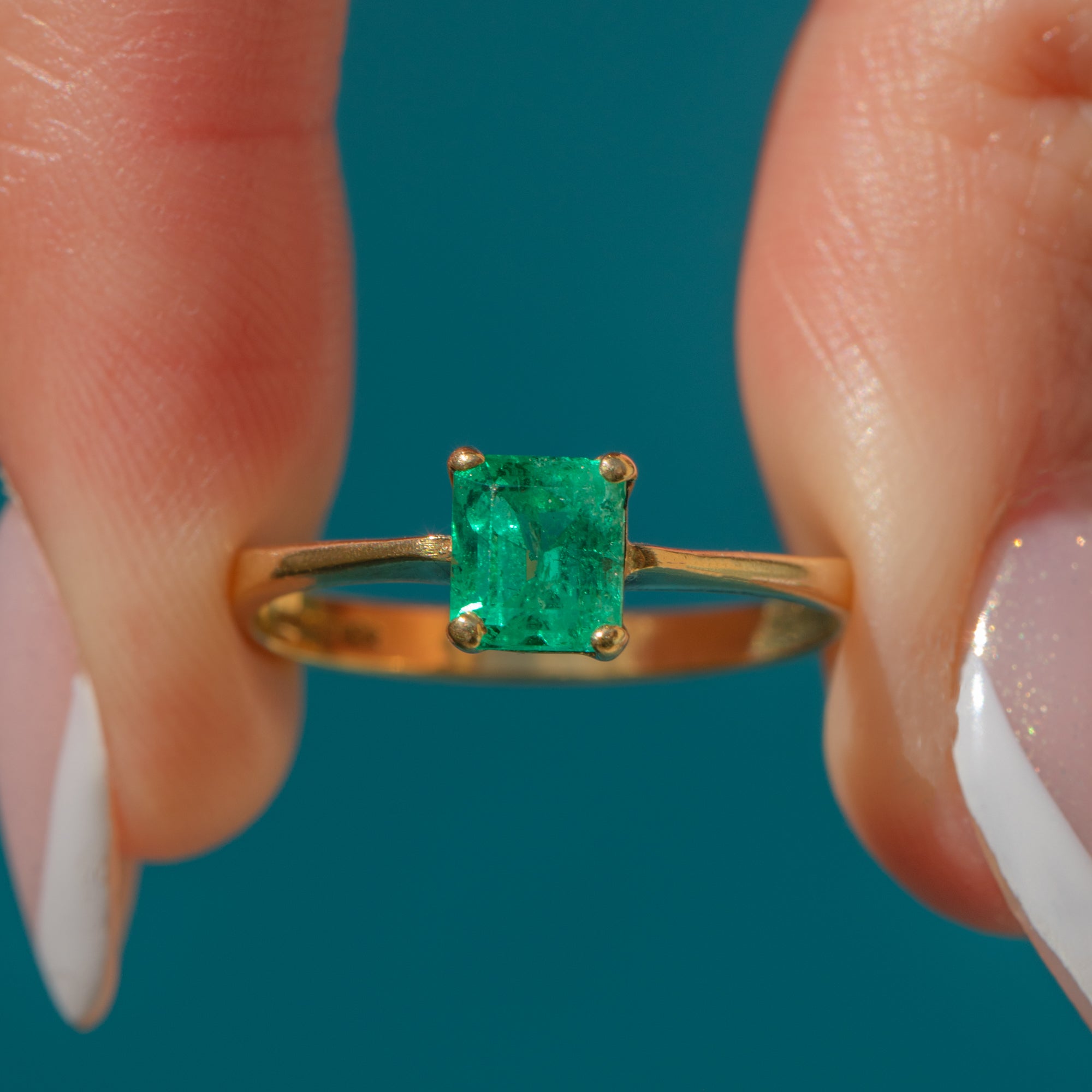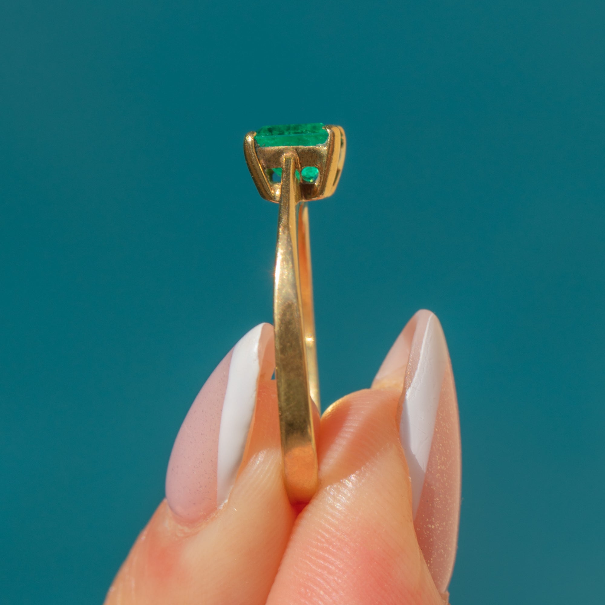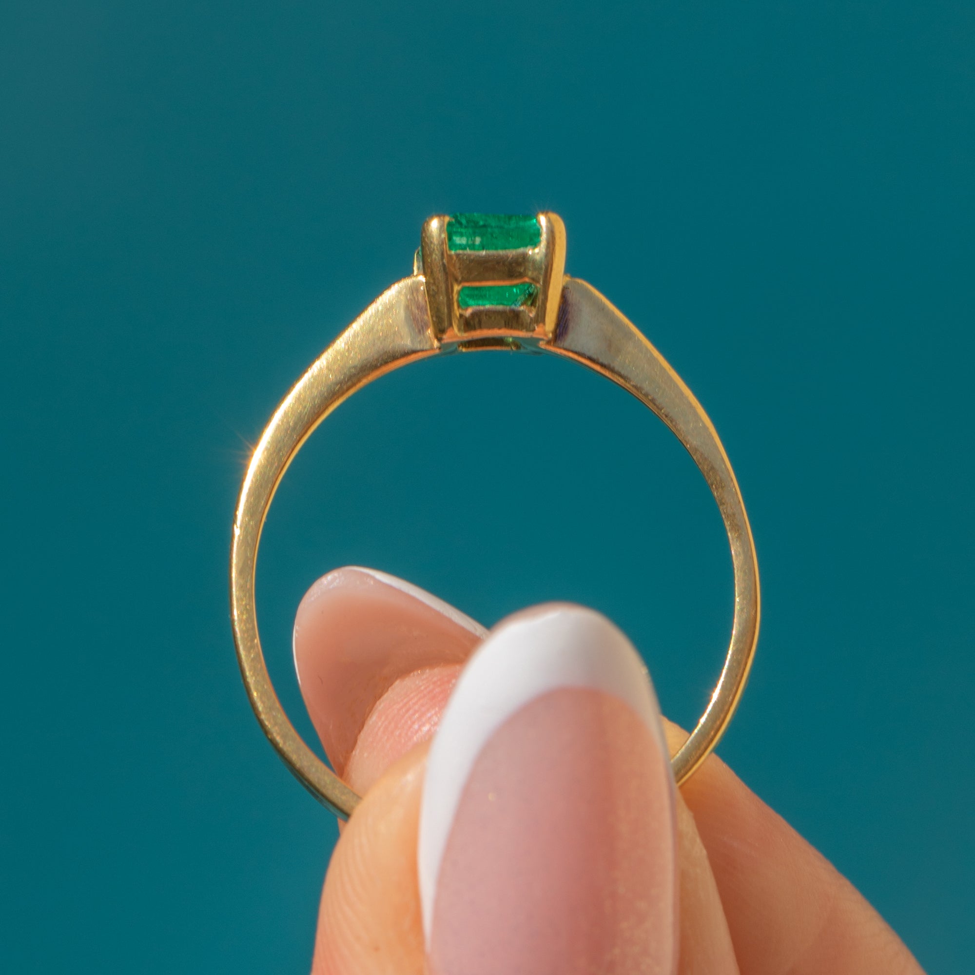 This elegant 18ct Gold Emerald solitaire ring is a classic example of the striking craftsmanship of the modern vintage era, and would make the most wonderful choice for a unique engagement ring!