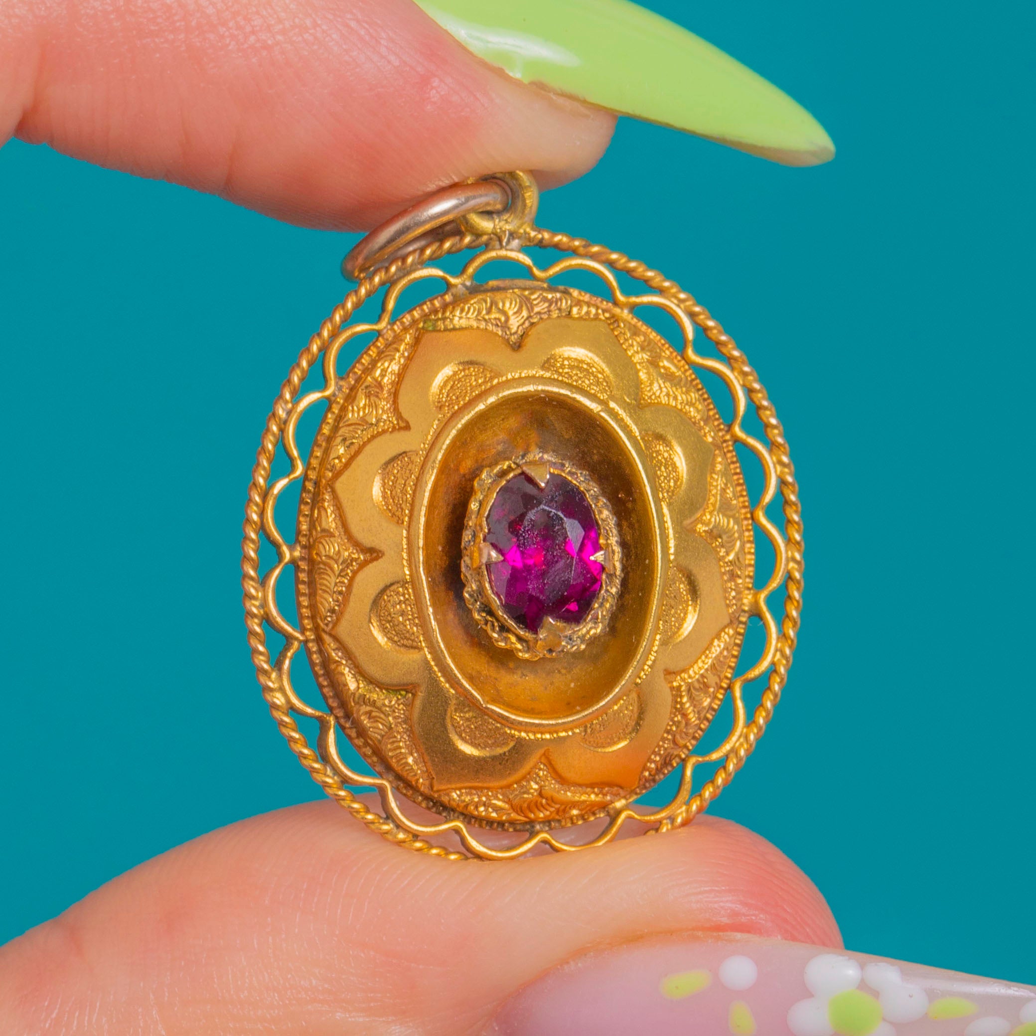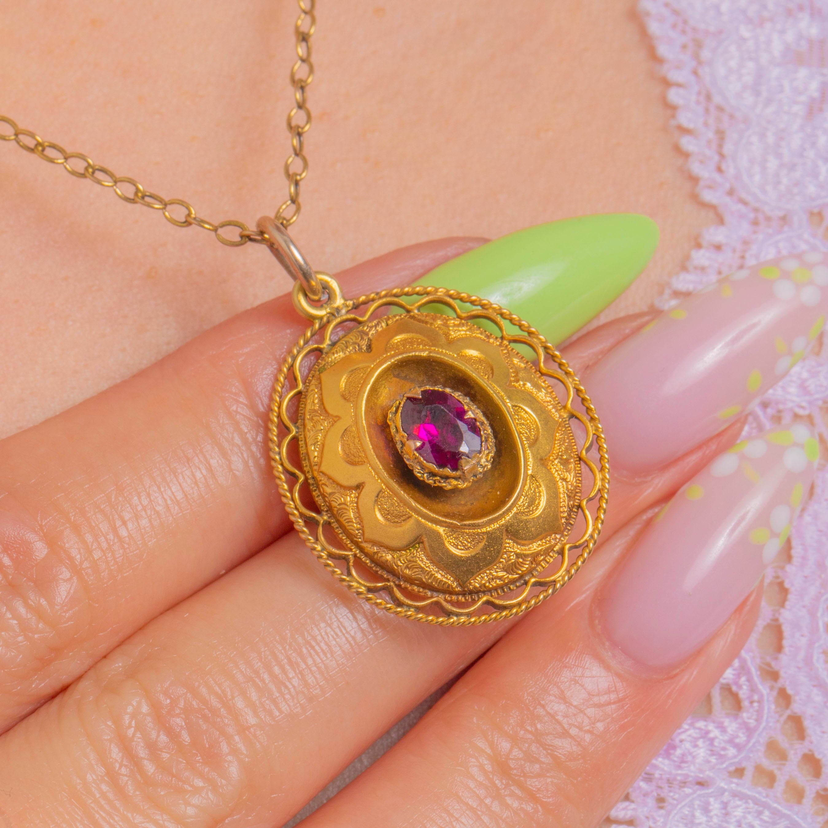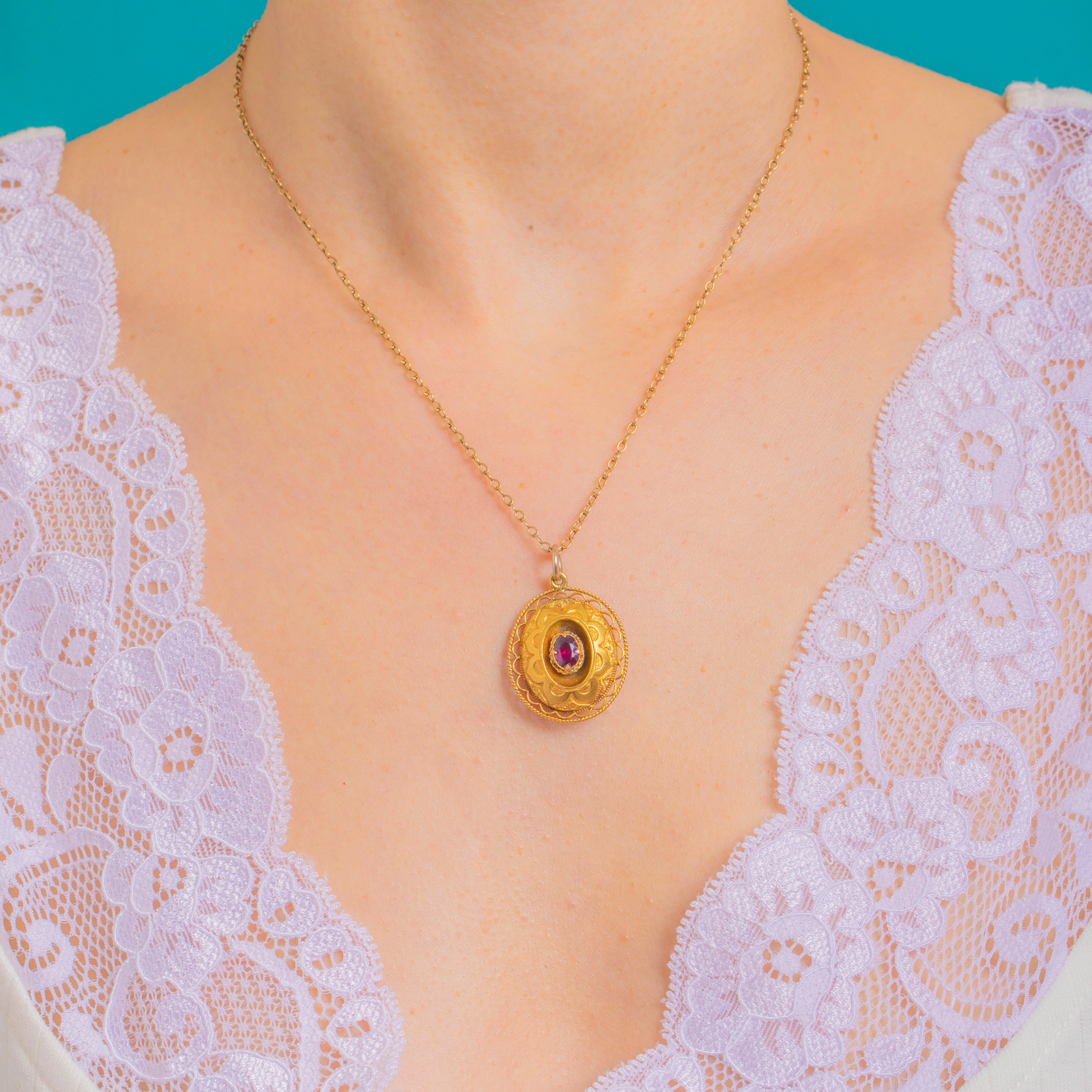 A delicious slice of Victorian Etruscan Revival in rich 18ct Gold, this ornate pendant centres a glowing 0.55ct Garnet, embraced by a scalloped rosette and finished with a beautifully pierced rope‑twist border. The intricate textures and romantic floral motif catch the light with every movement, lending warmth and depth to the Garnet’s deep pinkish‑red hue.