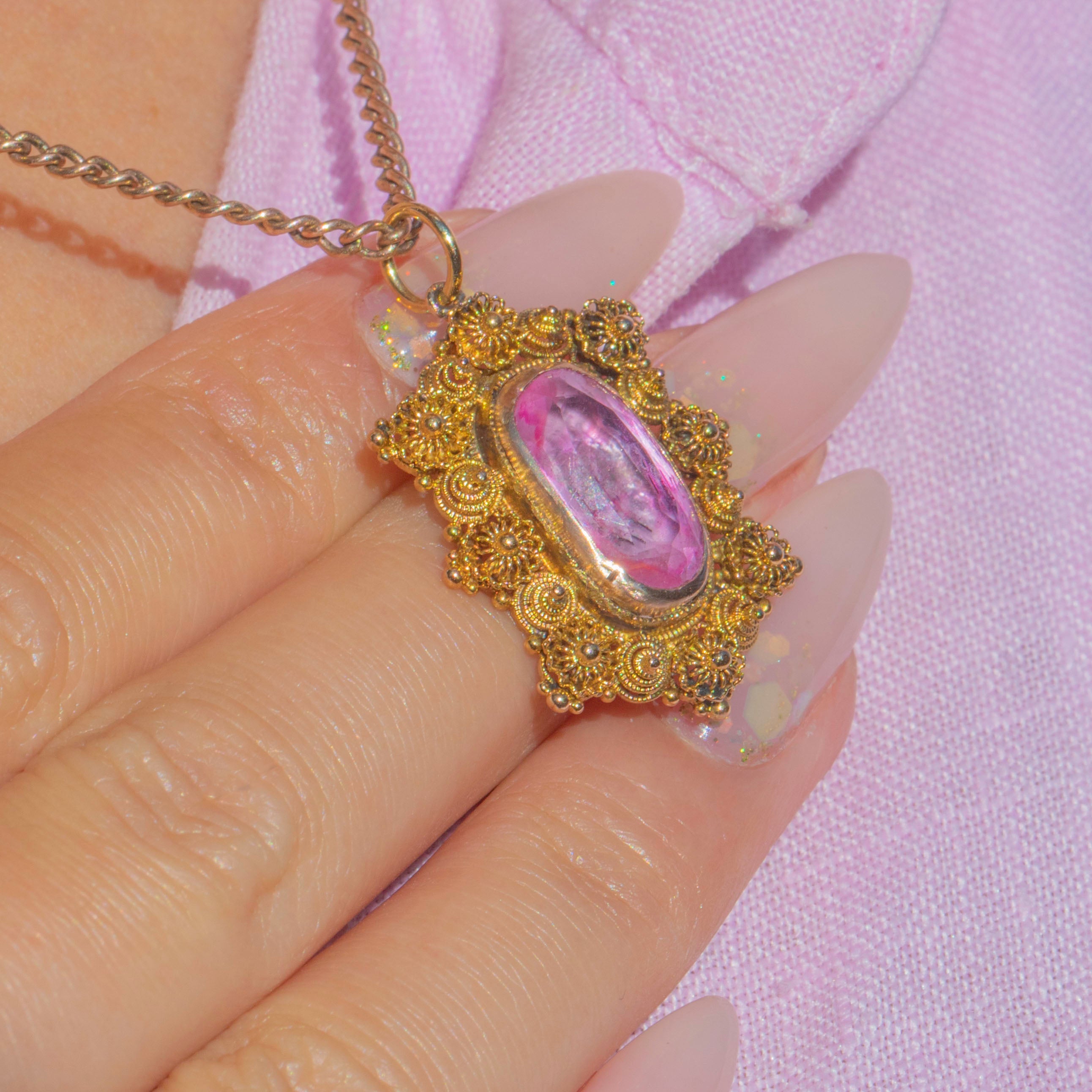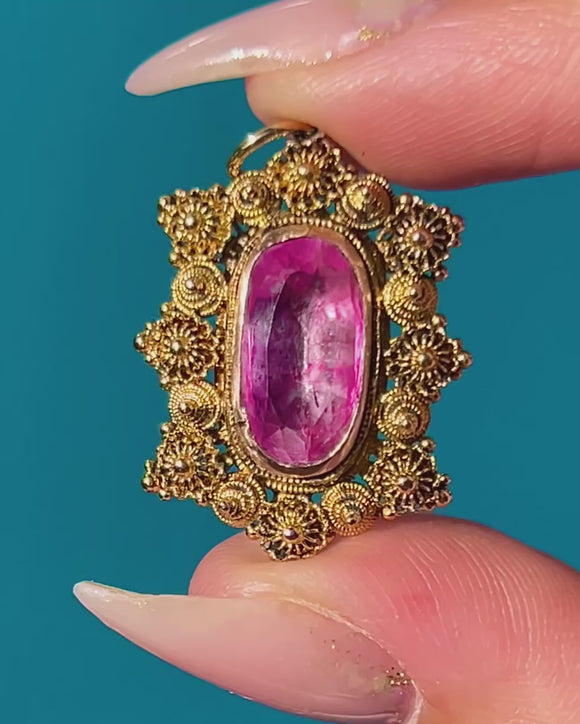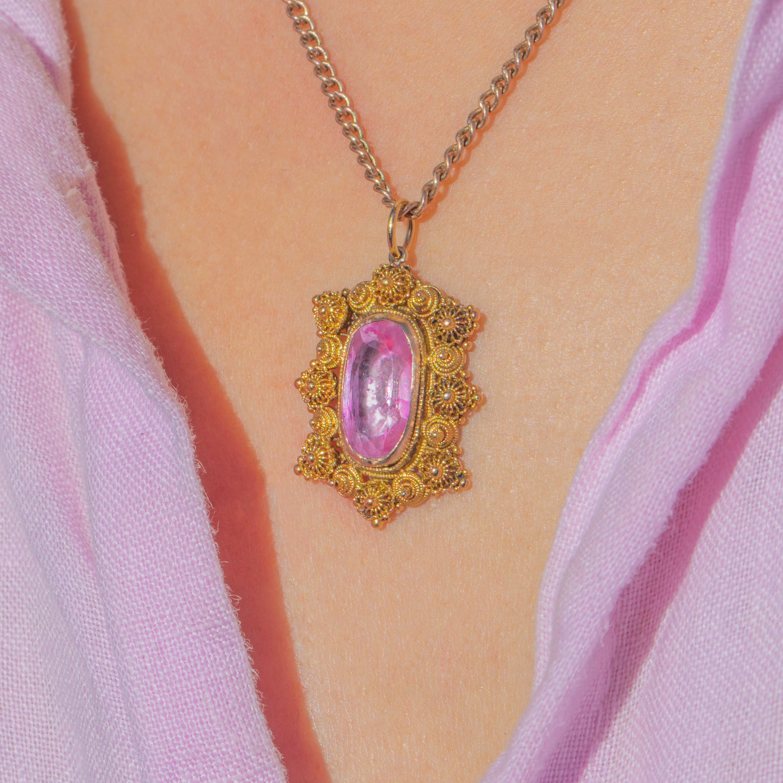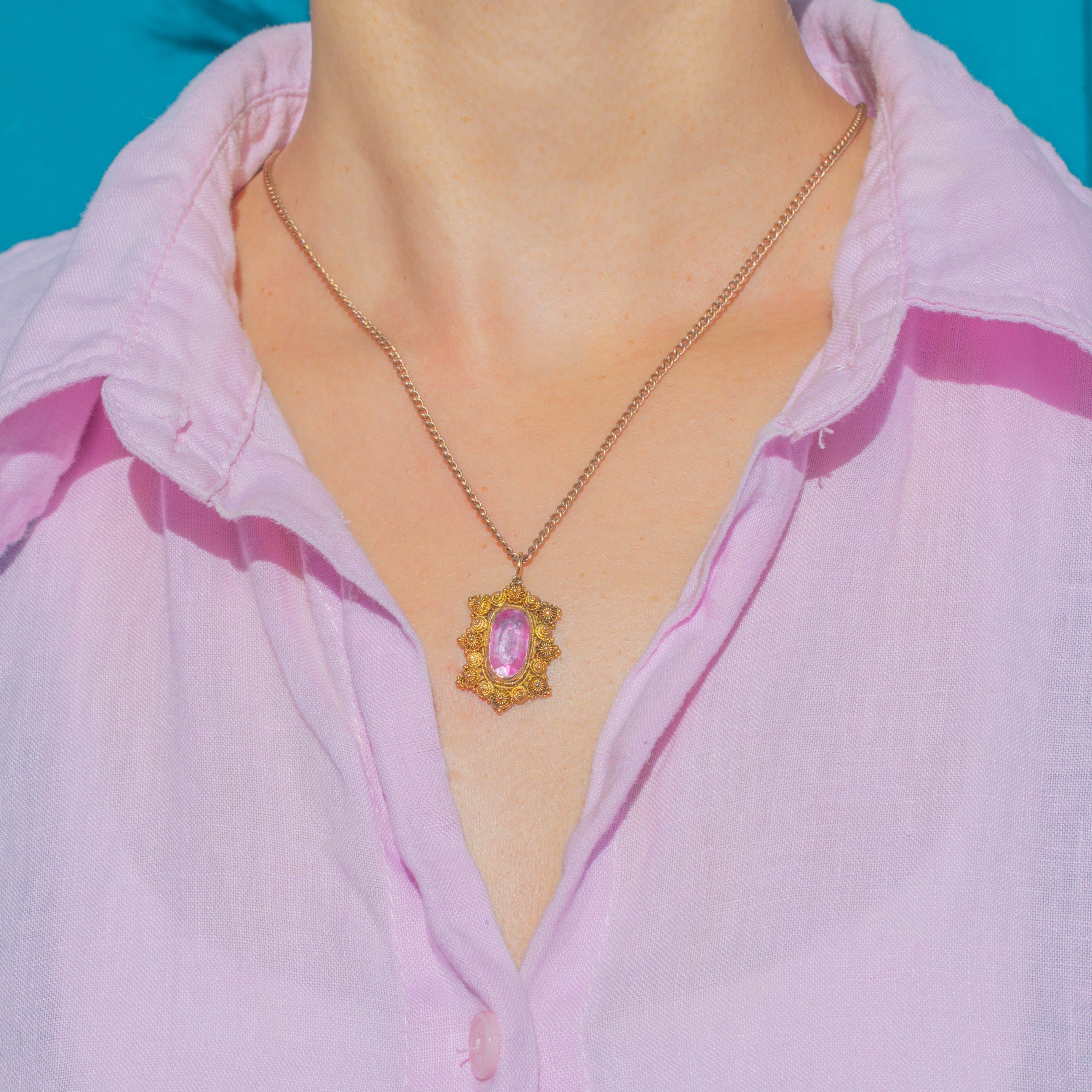 EXCELLENT: The pretty Georgian Pink Topaz is the most sought-after, luscious baby pink, and shows some natural inclusions. The foiling is intact and the charm has only the  lightest surface wear, consistent with her great age. At over 200 years old we think she looks pretty exceptional!! The 18ct Gold cannetille work is bright yellow and well preserved with only minor softening of detail. Overall, the pendant has been well cared for and remains in beautiful antique condition.