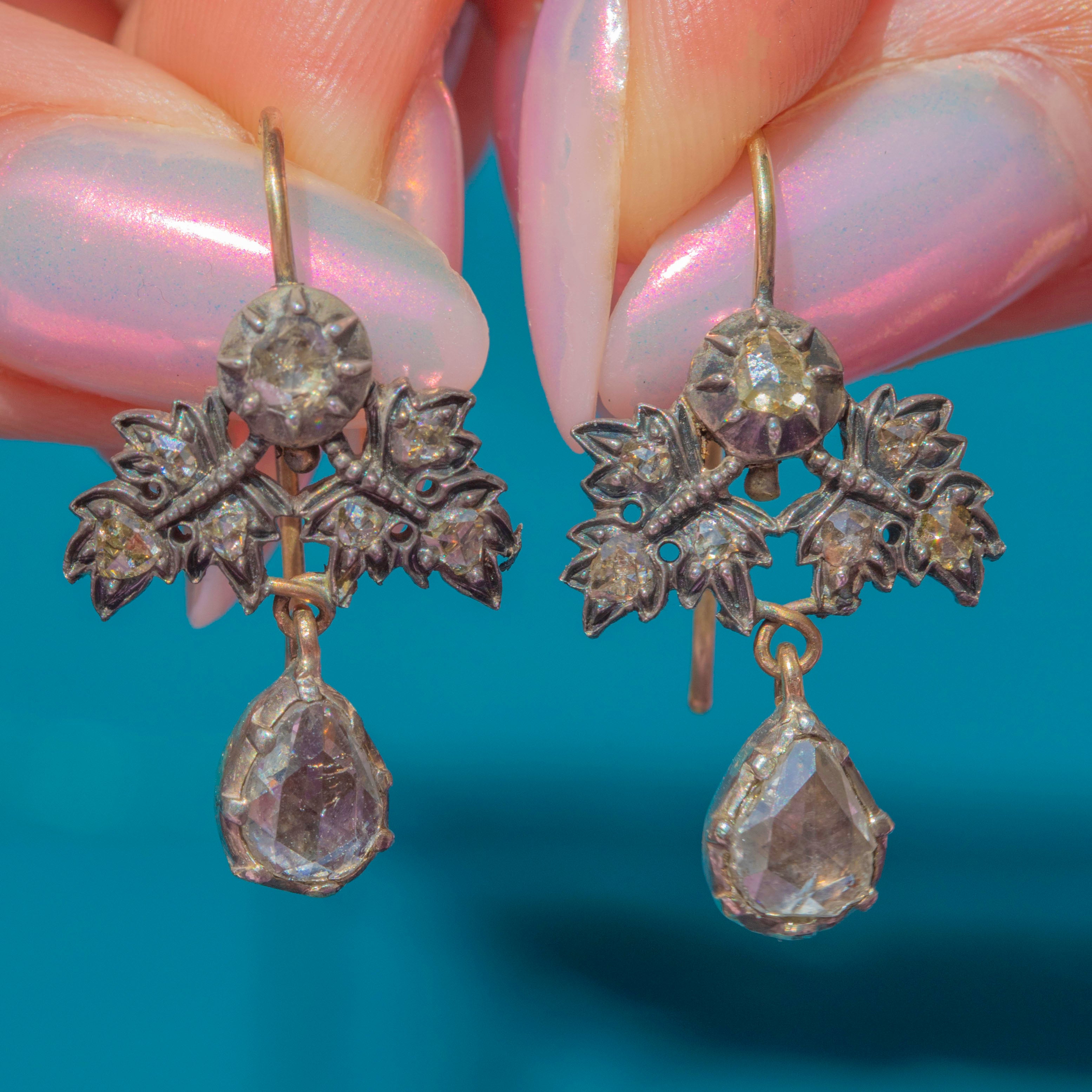 EXCELLENT: The rare Georgian era rose-cut Diamonds are securely held within their Silver settings and have a wonderful sparkle. There are a few scratches on the pear Diamond drops, noticeable only under the inspection of a loupe, and is completely understandable considering their vast age. The 18ct Gold hooks are slender and robust, allowing you to wear these antique Diamond earrings with utmost confidence!