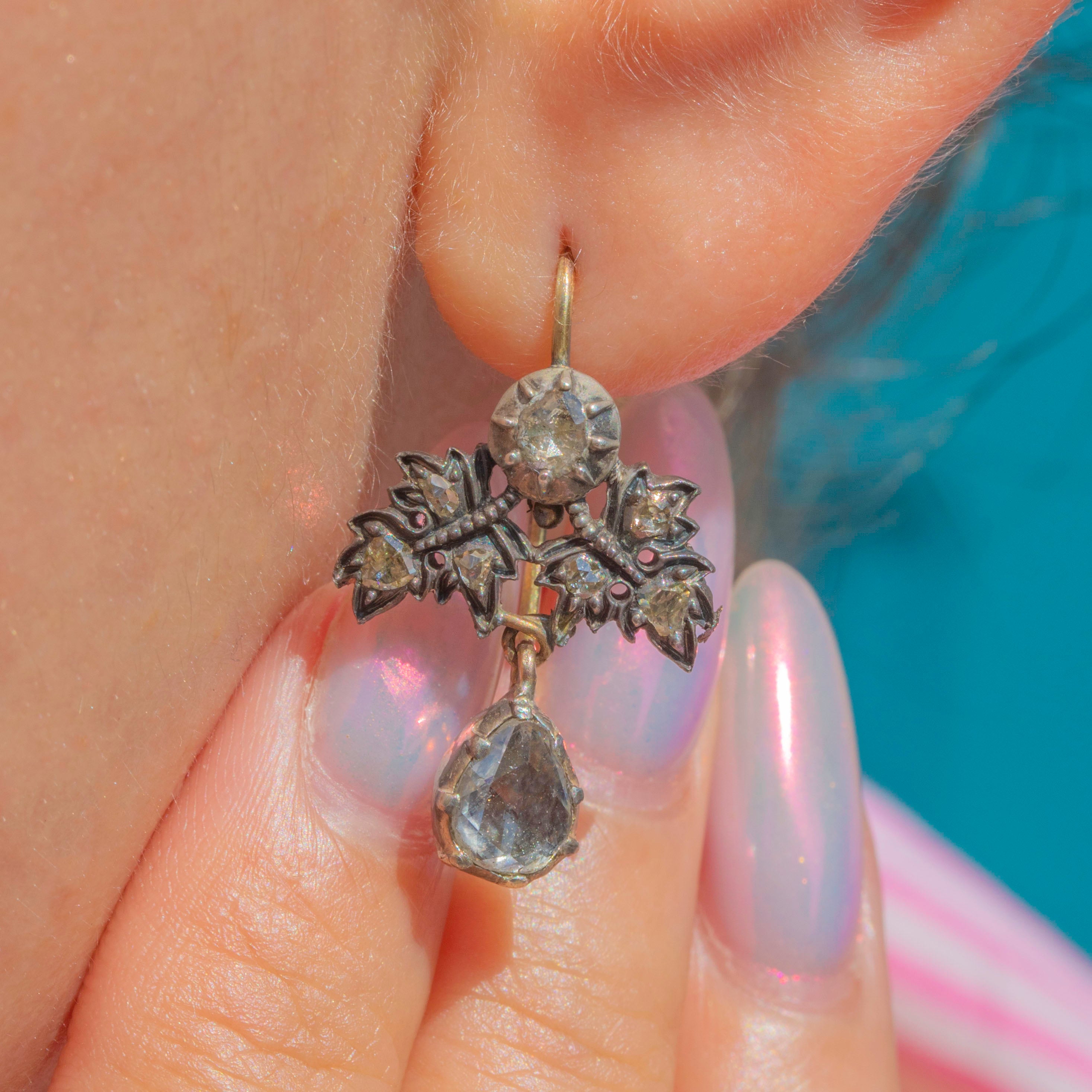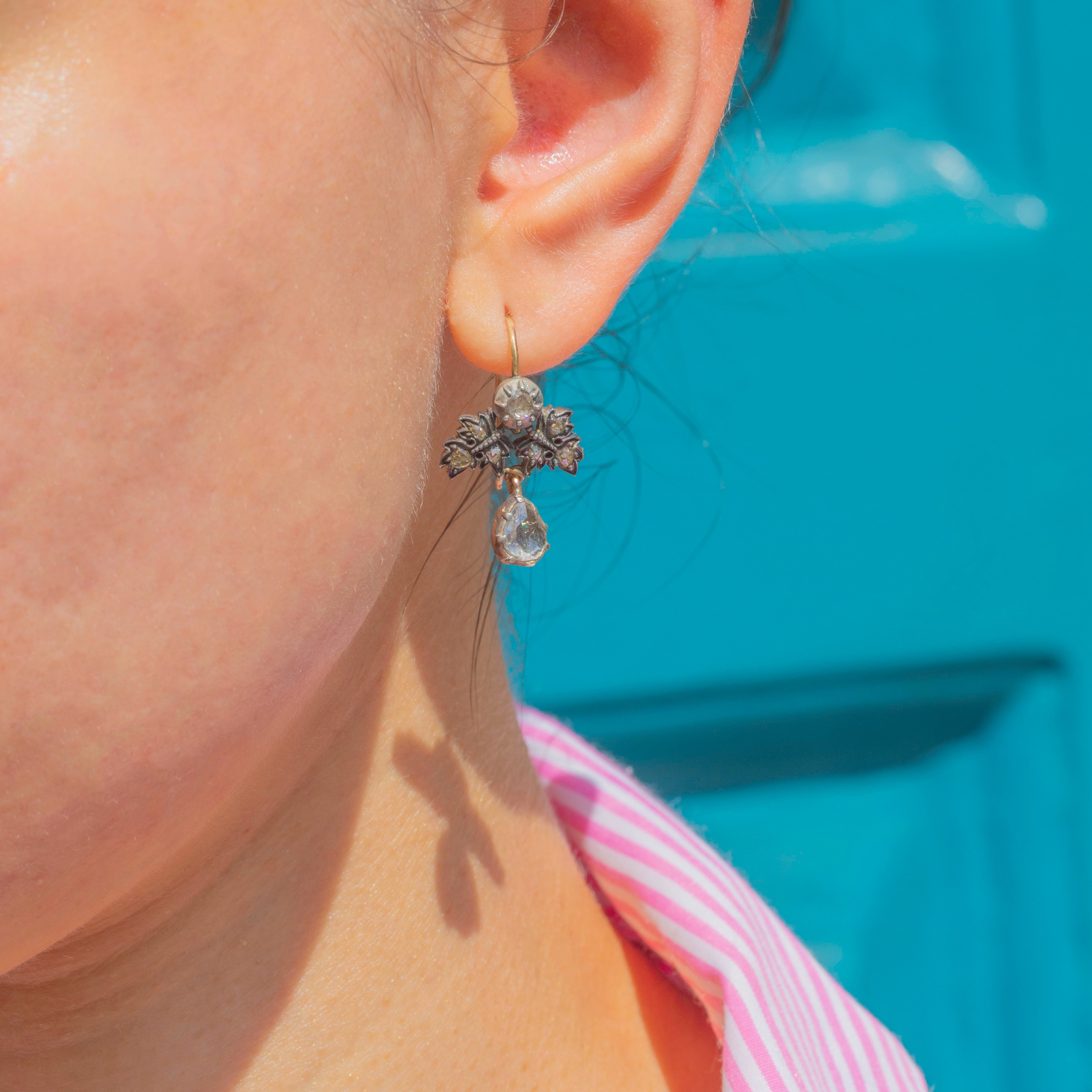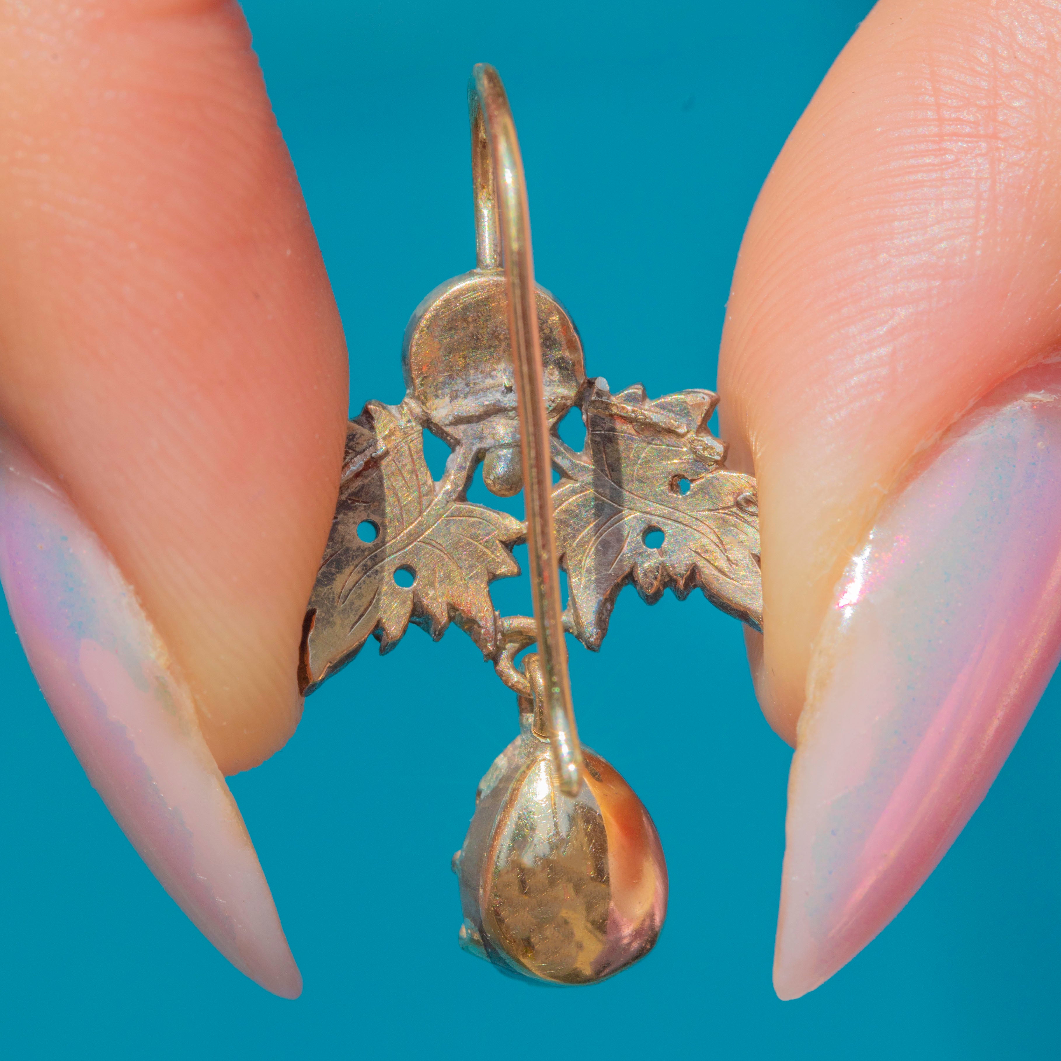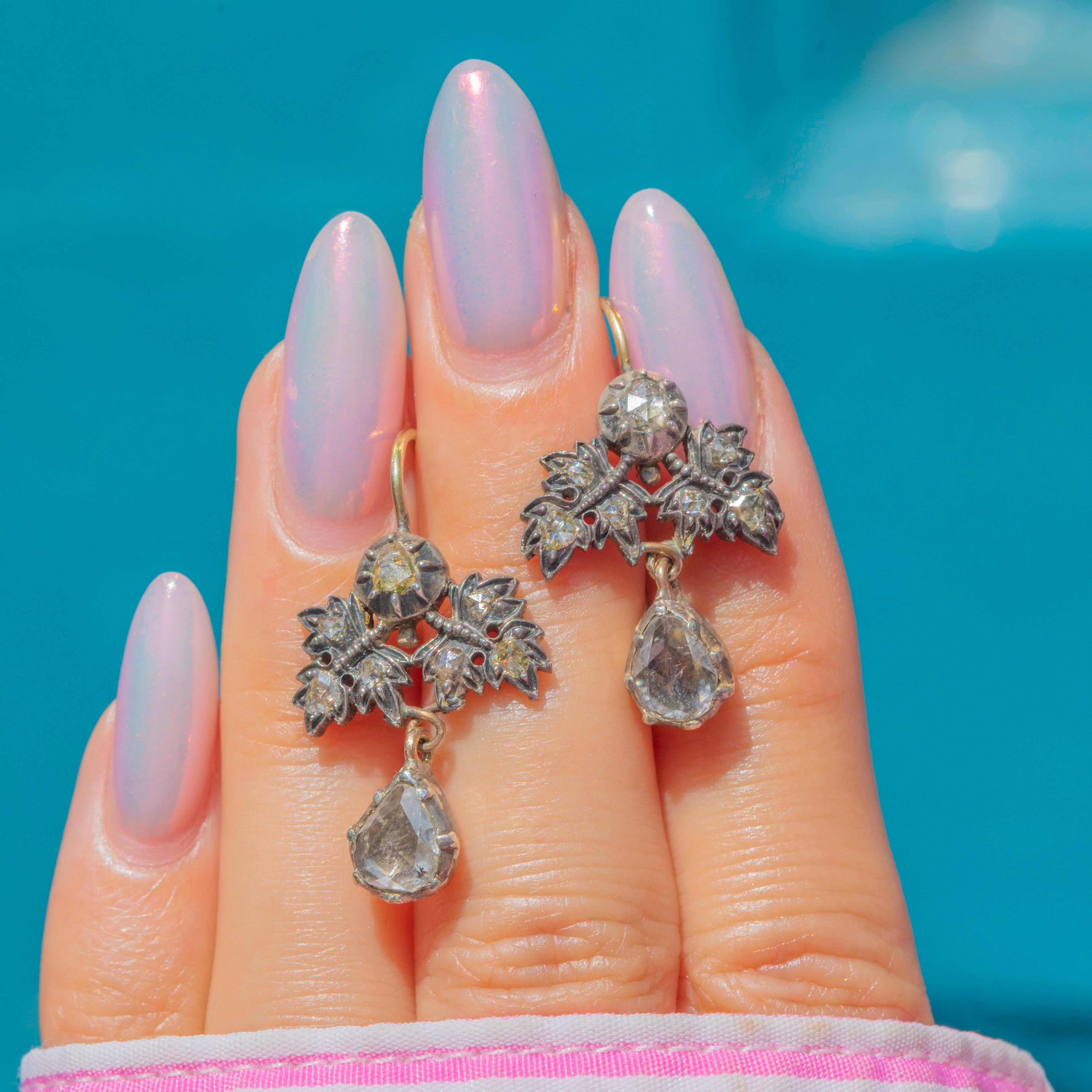 Complete with Silver settings, 18ct Gold hooks and rare Georgian rose-cut Diamonds, these antique earrings are certainly show stoppers!
