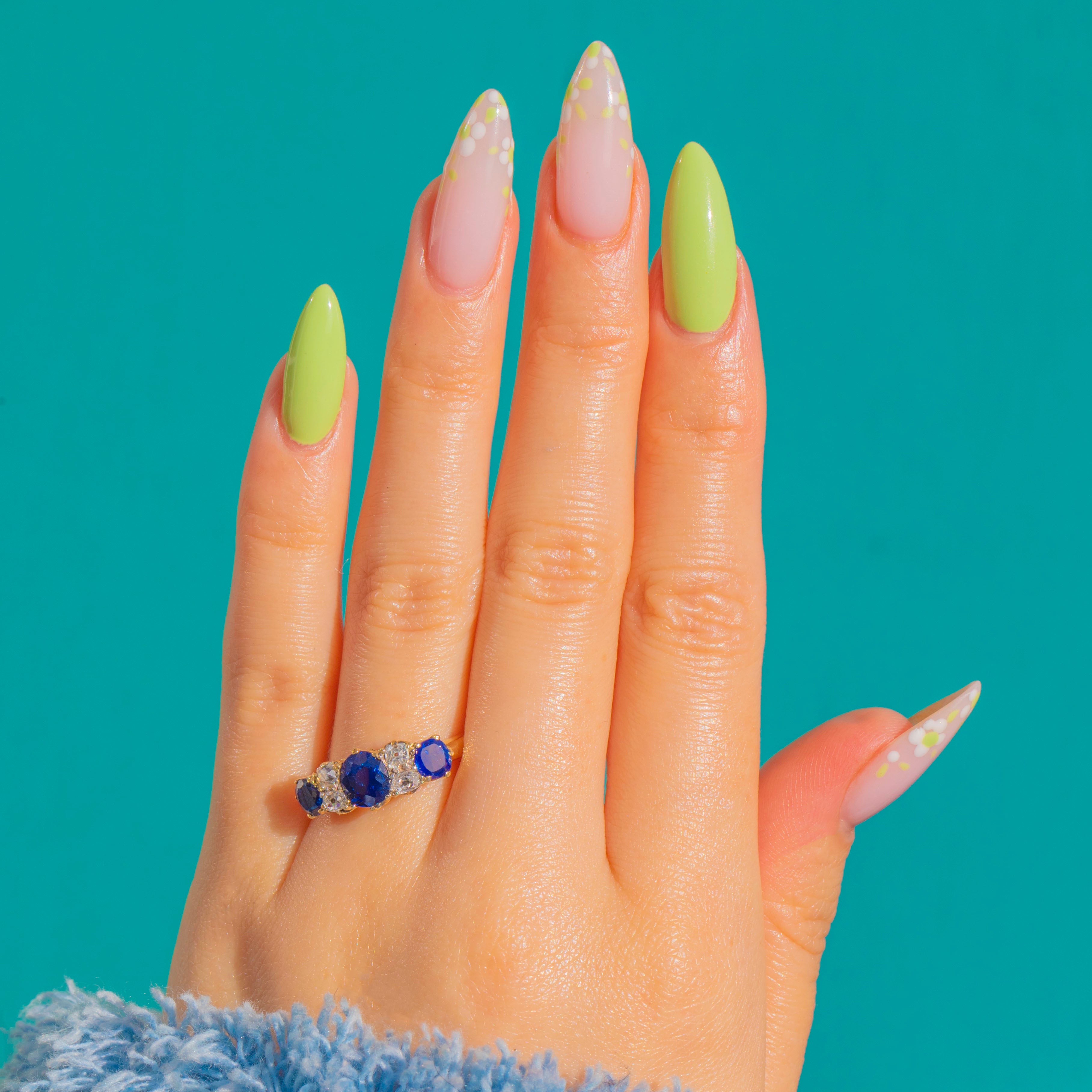 Outer Sapphires measure 4mm in diameter, weighing approx. 0.95ct combined