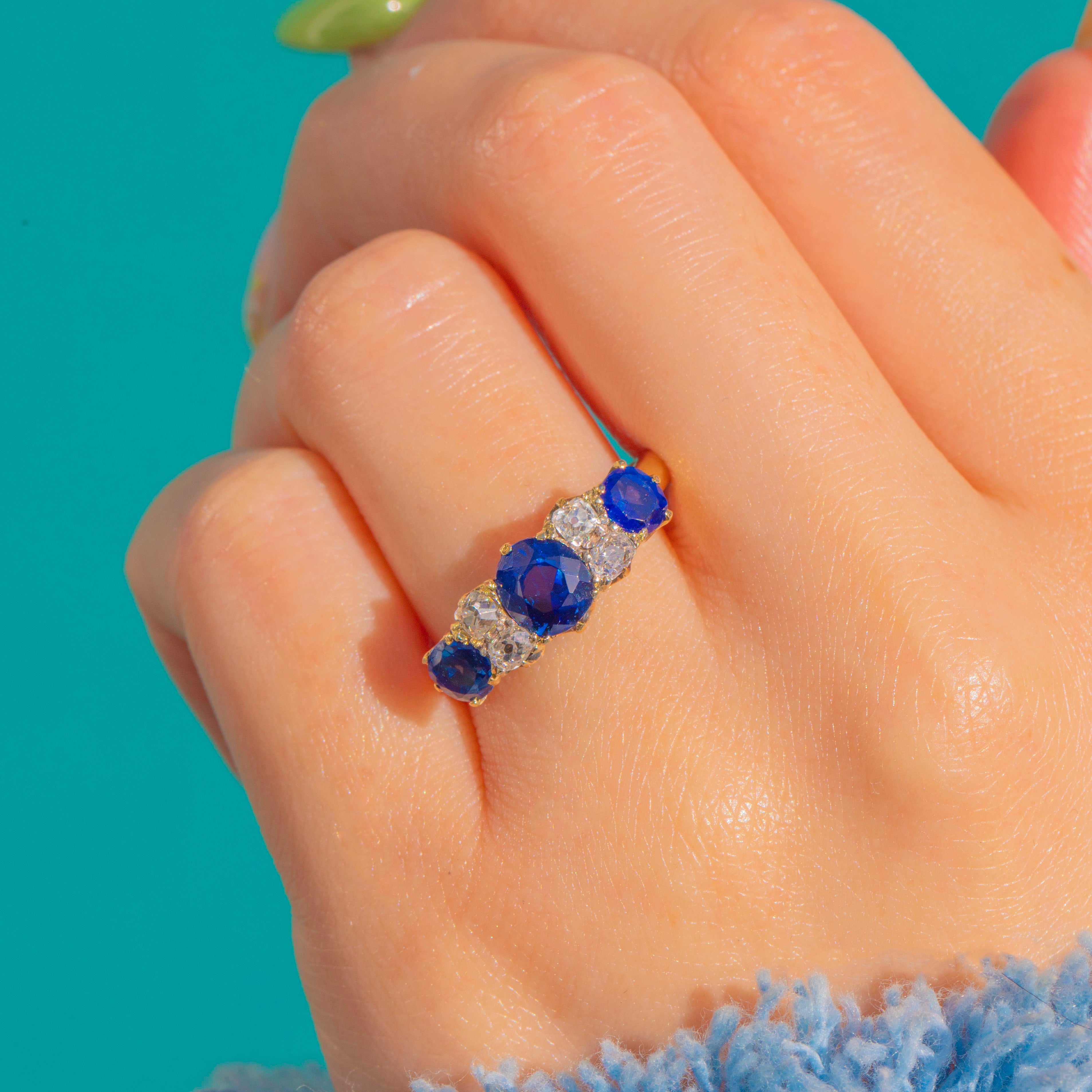 Gloriously Victorian and beautifully refined, this five-stone ring is crafted in rich 18ct Gold with a graceful, raised crown and pierced gallery. A sumptuous royal-blue Sapphire sits centre stage, flanked by four bright Diamonds and two further blue Sapphires, each in individually scalloped claw settings for a delicate, heritage silhouette.