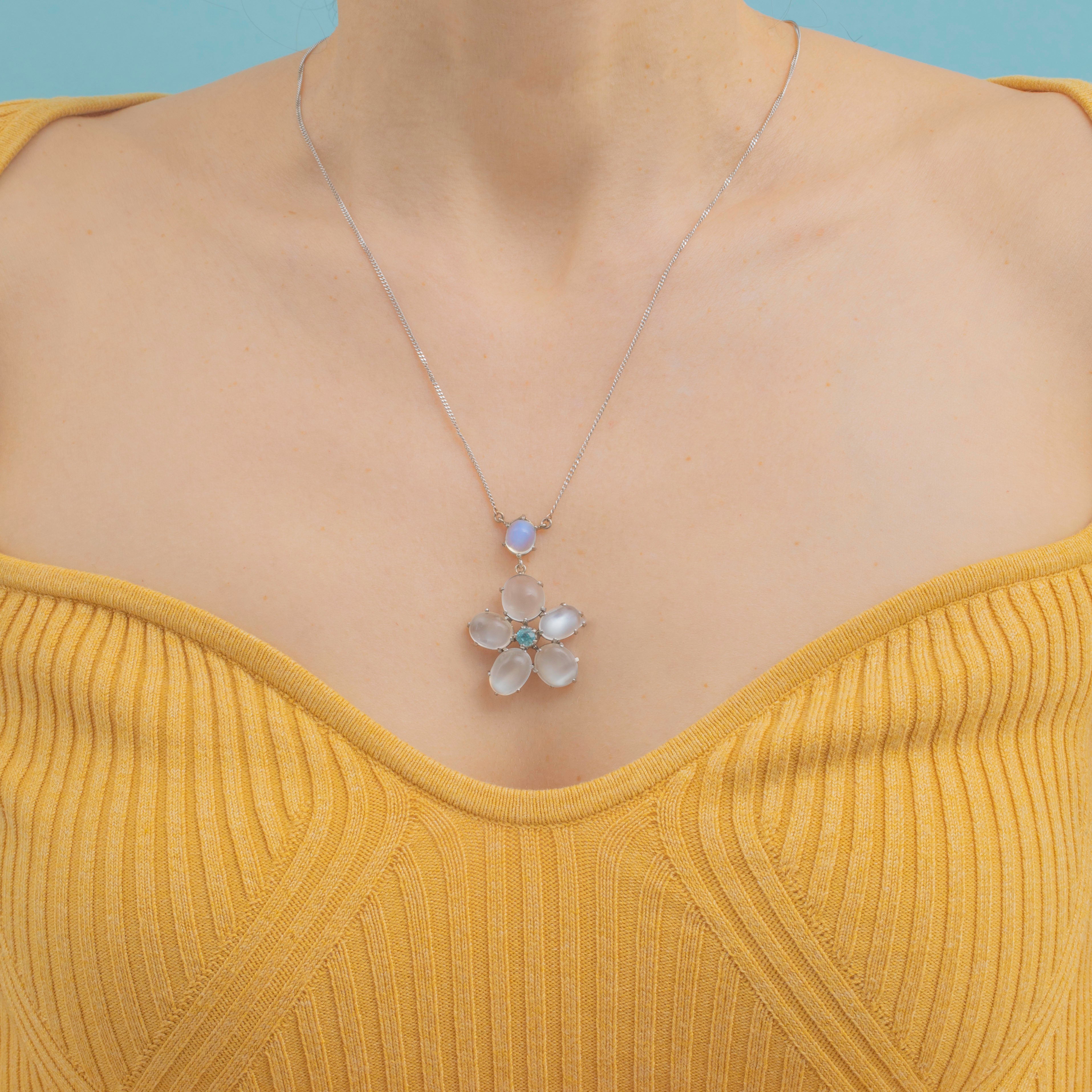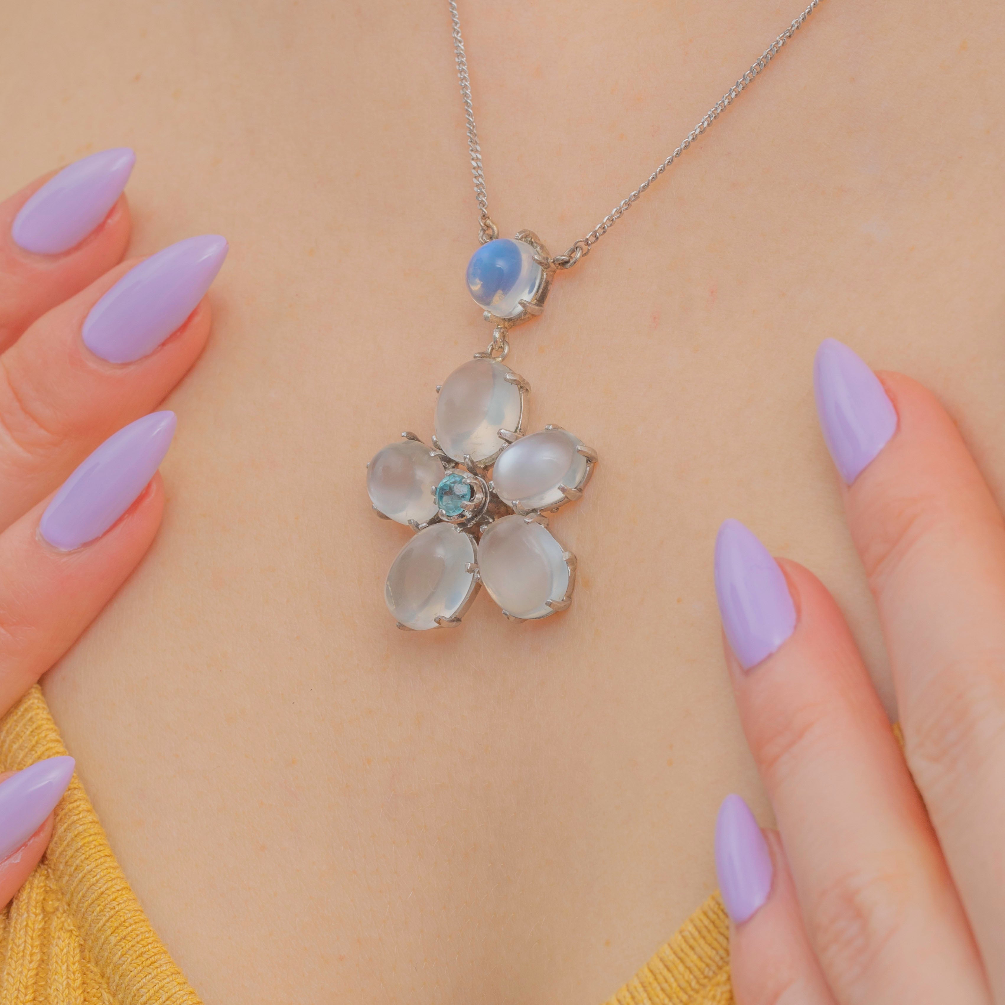 Six plump Moonstones are arranged in a gorgeous flower design, each billowing a wonderful silvery-blue adularescence. Her floral motif is centred by a vibrant blue Zircon, radiating gorgeous icy blue hues, effortlessly complimenting the softness of her surrounding Moonstones.