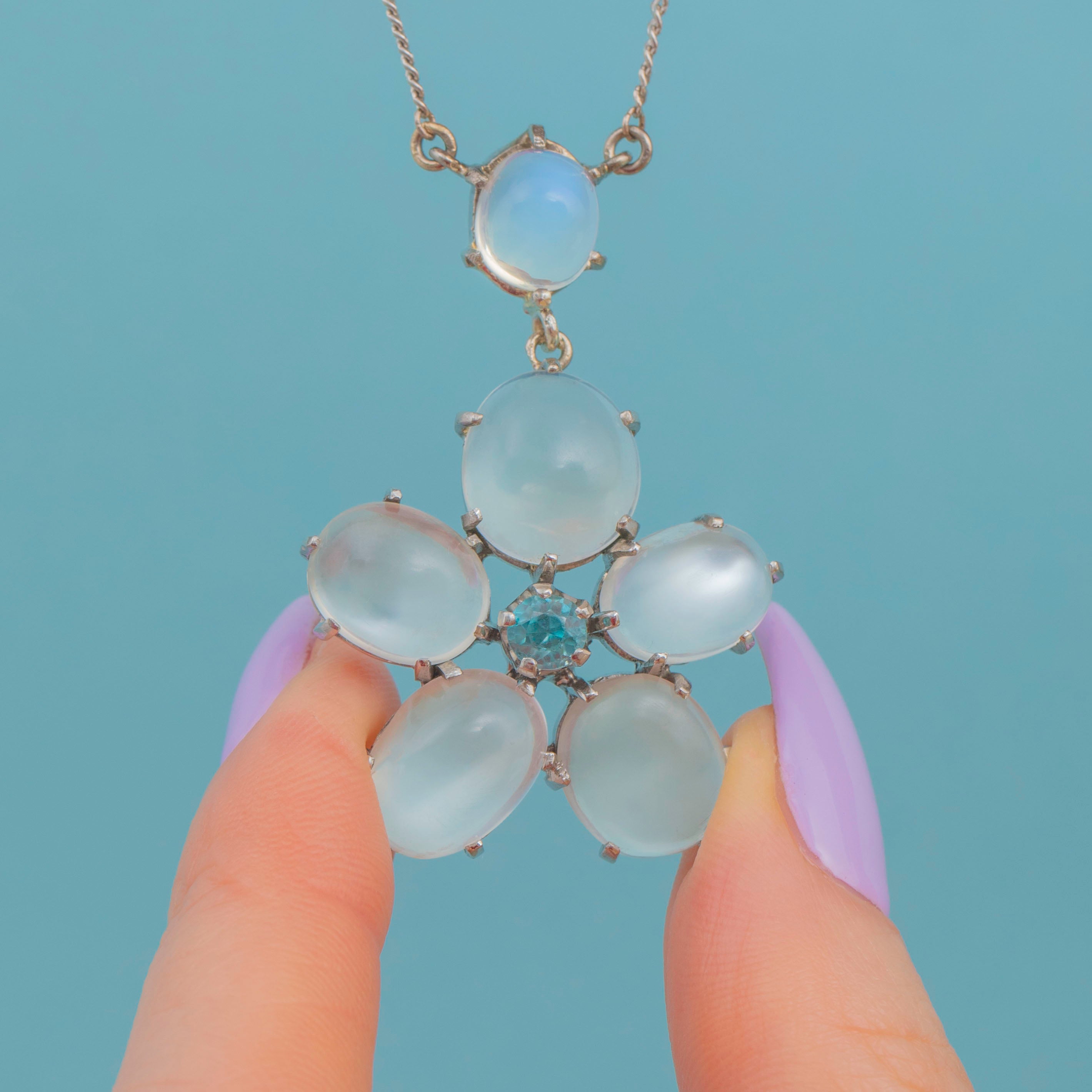 VERY GOOD-EXCELLENT. This 18ct Gold Moonstone and Blue Zircon flower drop necklace is in lovely condition. Each of her gemstones is radiant, with only some minor scratches to the surface of Moonstones commensurate with age. With a secure chain, you can wear her with the utmost confidence.