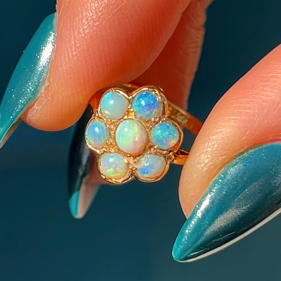 We adore this 18ct Gold Opal flower cluster ring. This vintage beauty features a pretty Opal flower, resting on a 18ct Gold band!