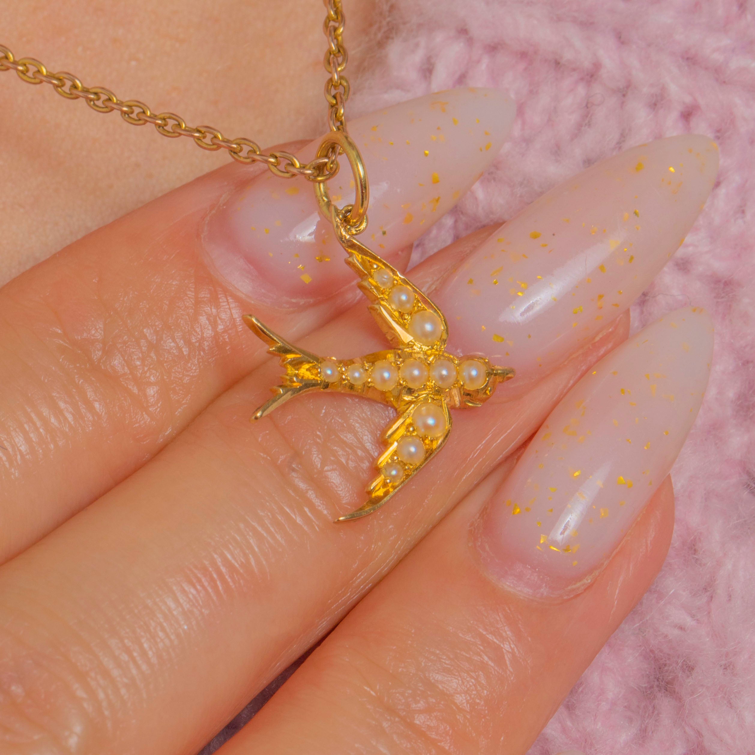 Petite and poetic, this 18ct Gold sparrow pendant is adorned with a delicate sweep of creamy Seed Pearls that trace the bird’s body and wing. The low-relief sculpting and polished finish catch the light beautifully, while the pearls add a soft, romantic glow.