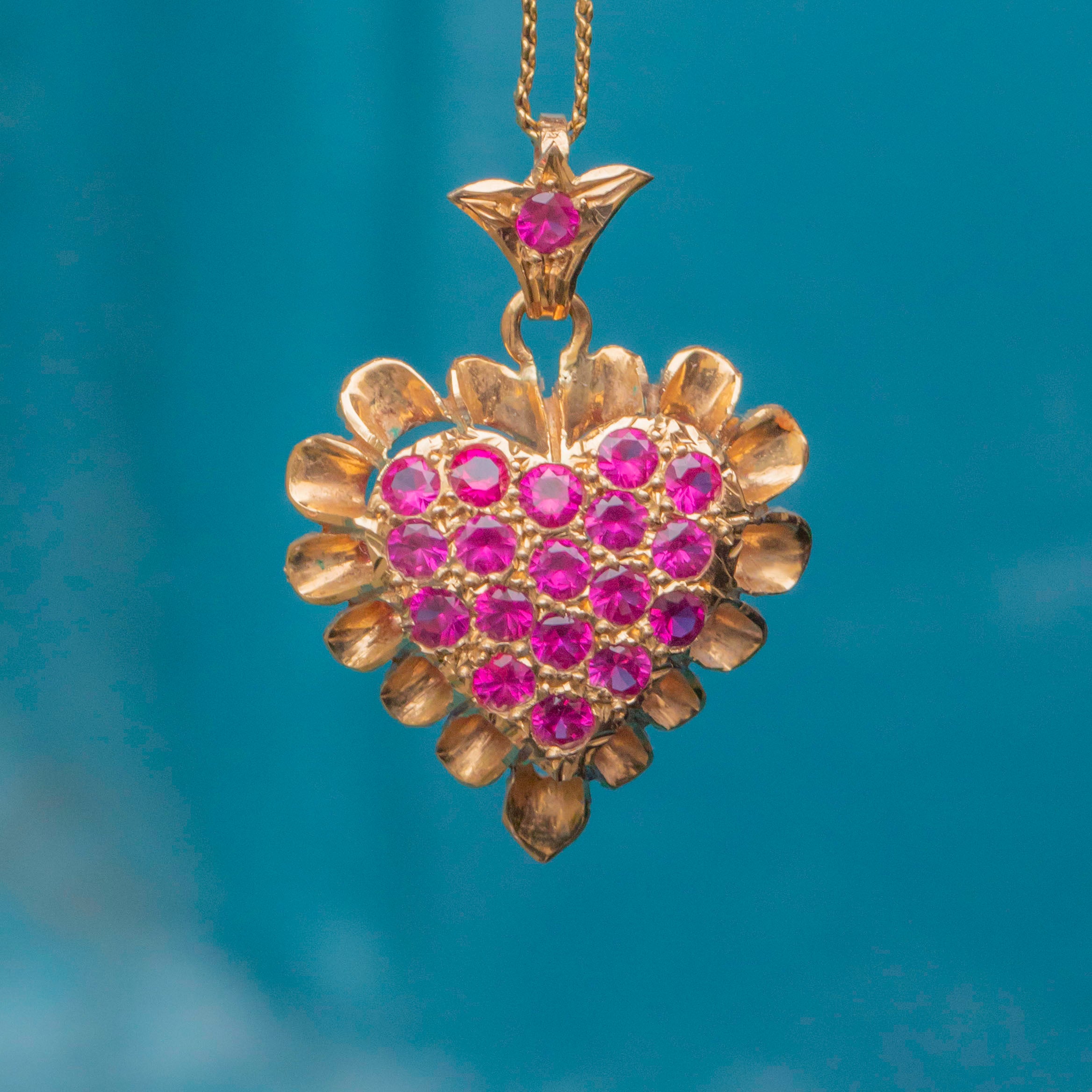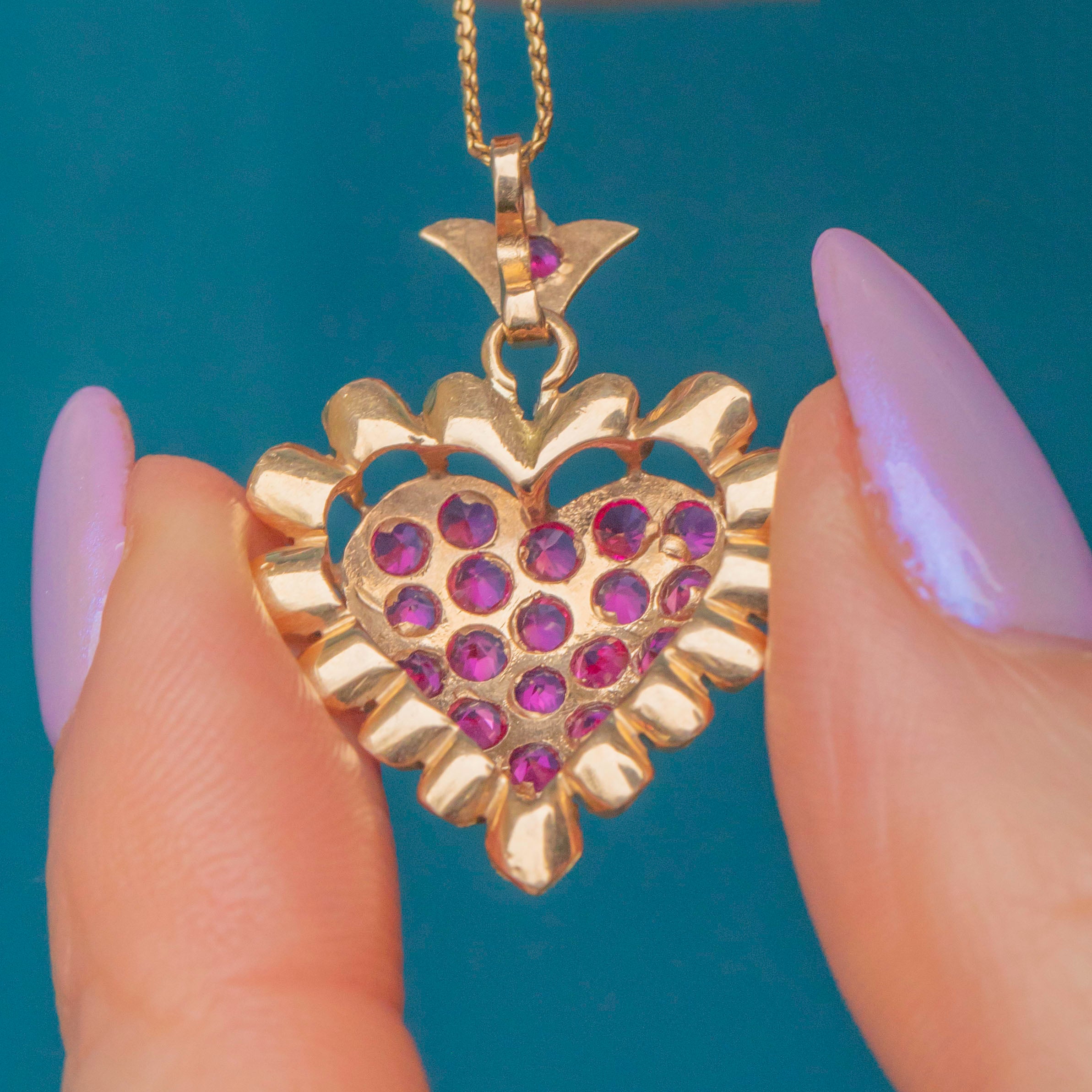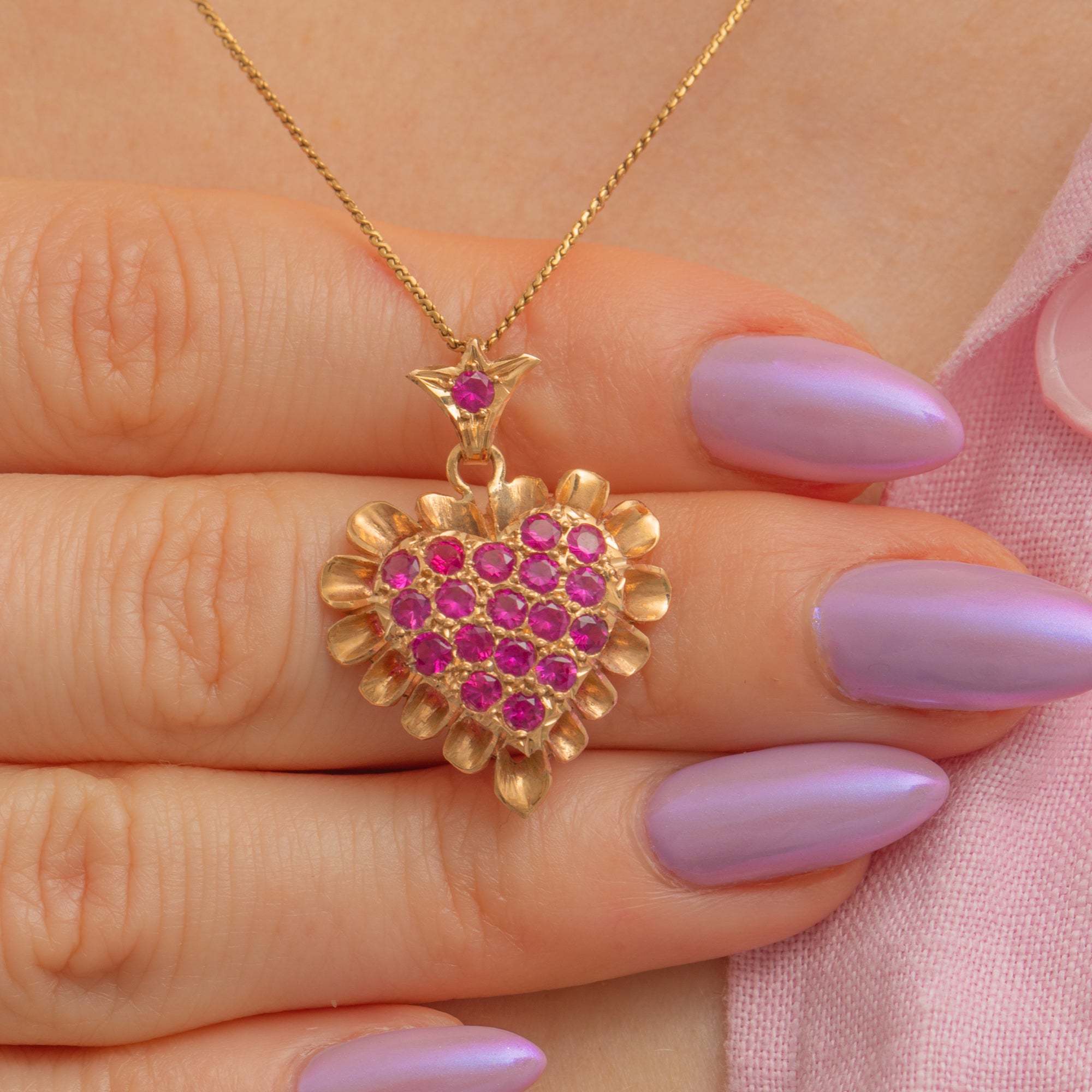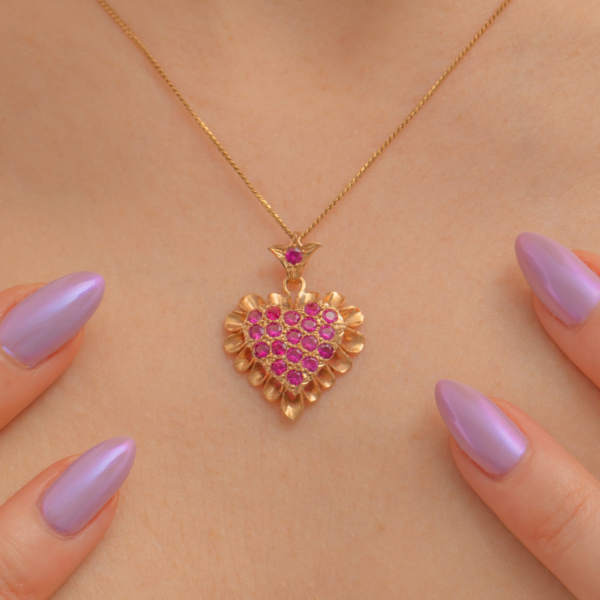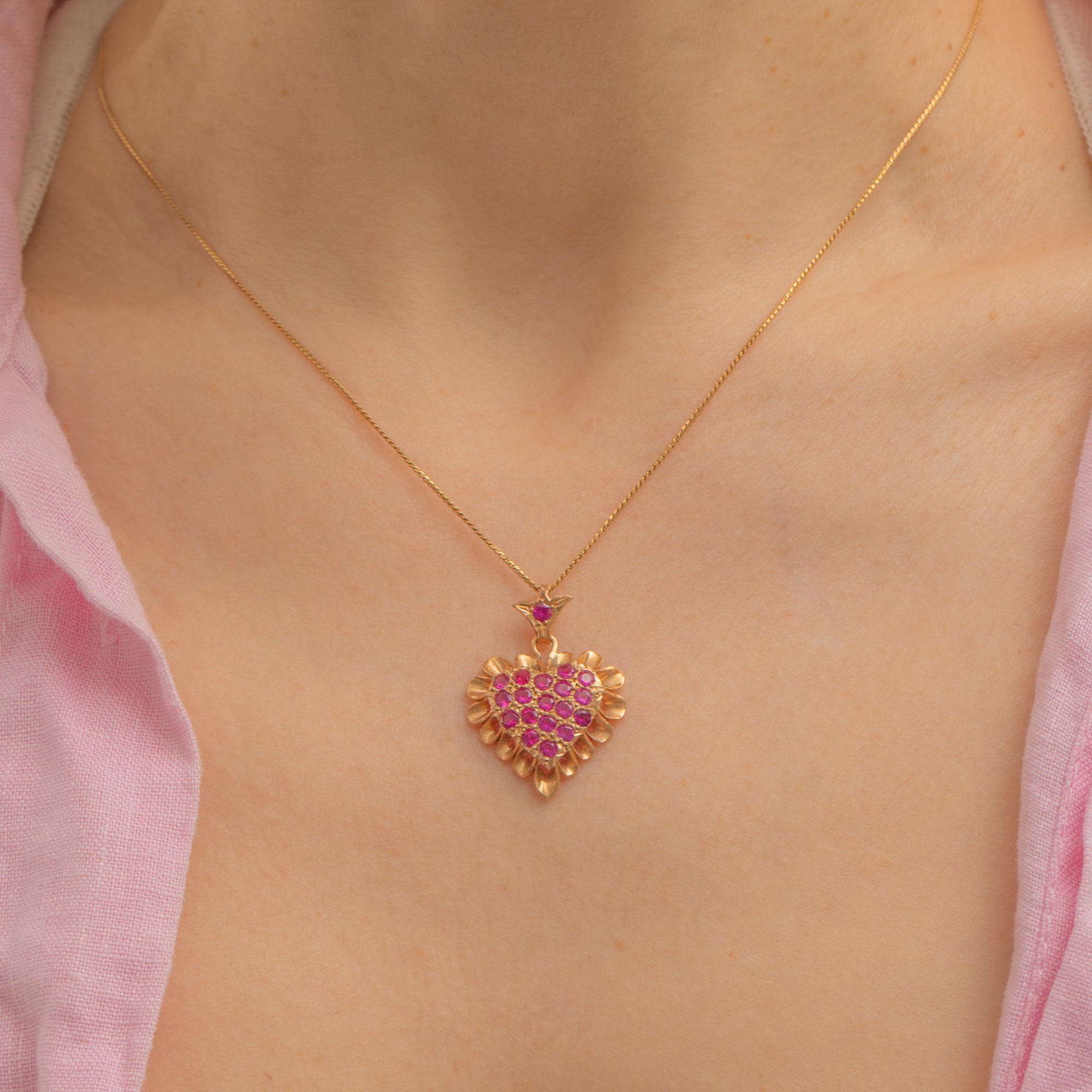 A 20" chain suspends an 18ct Gold pave heart pendant, adorned with a myriad of vibrant fuchsia Sapphires. With 19 pink Sapphires weighing 0.66ct in total, this vintage pendant is bursting with character and vibrancy.