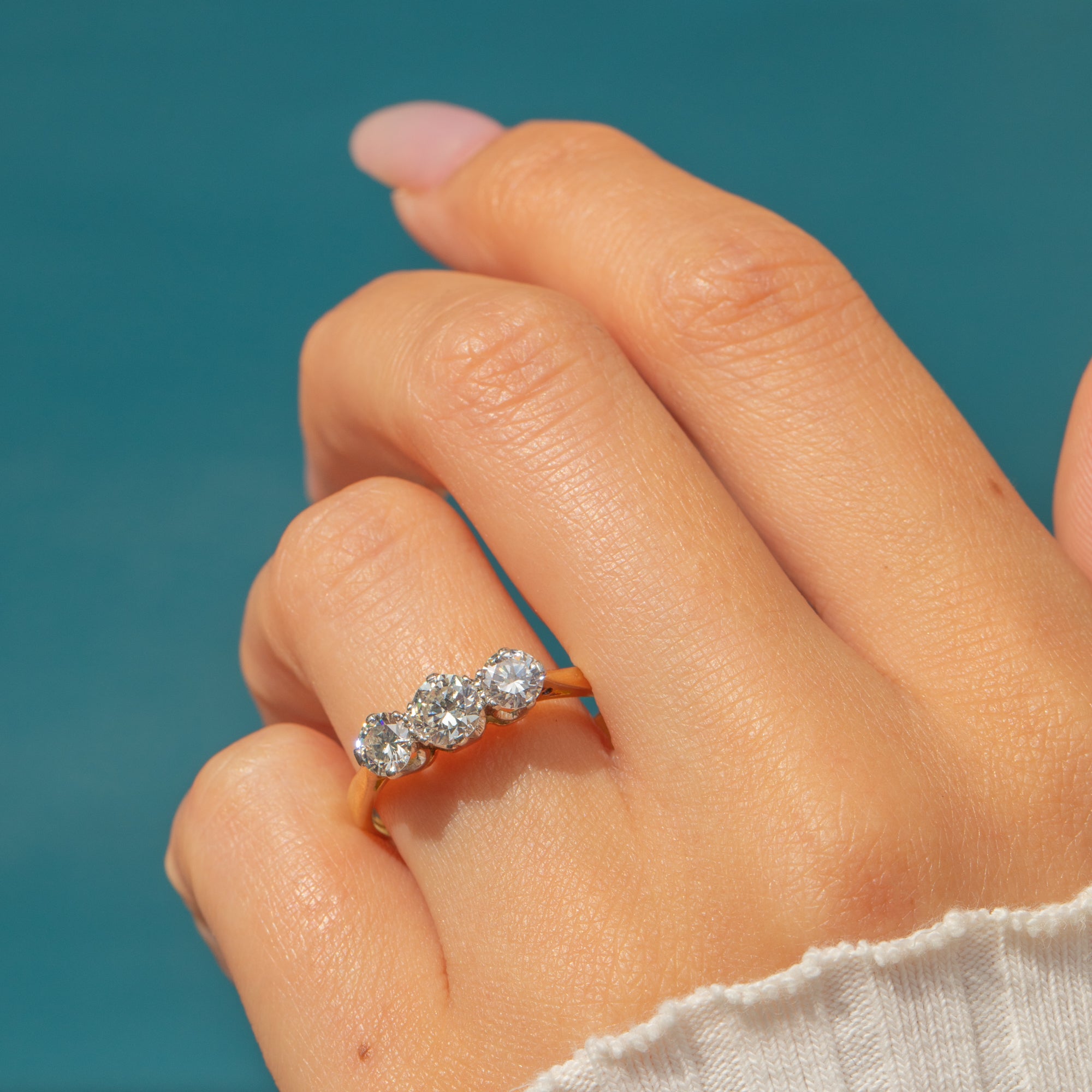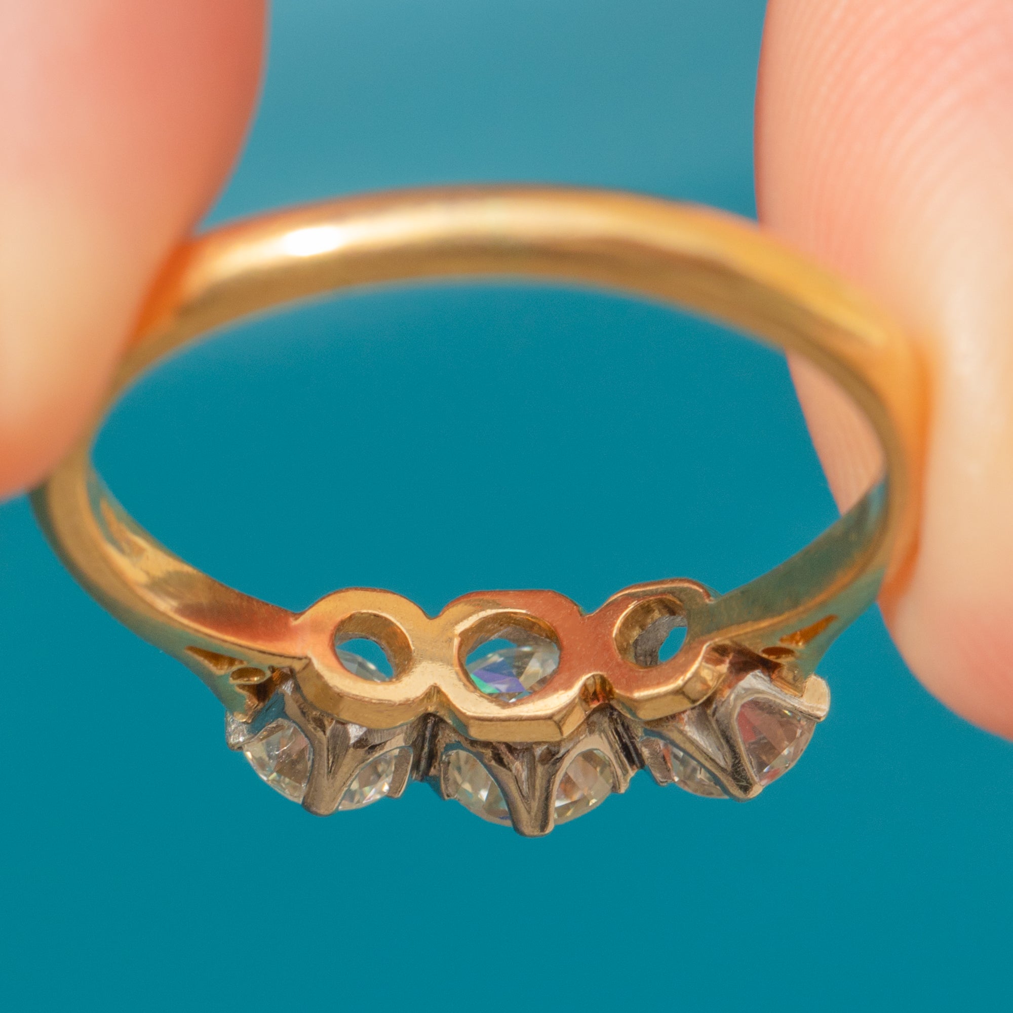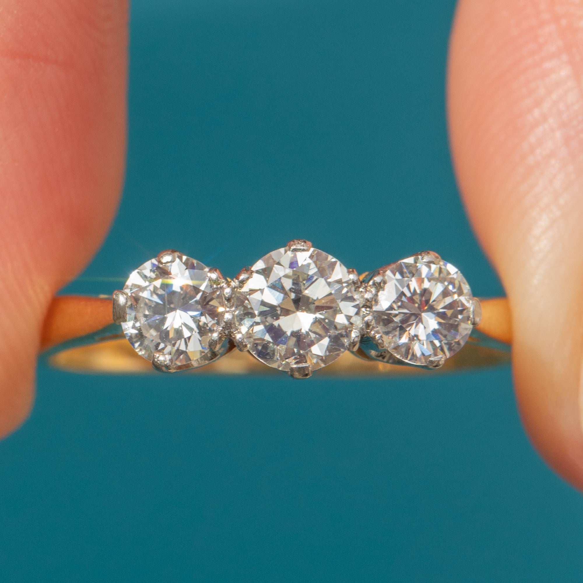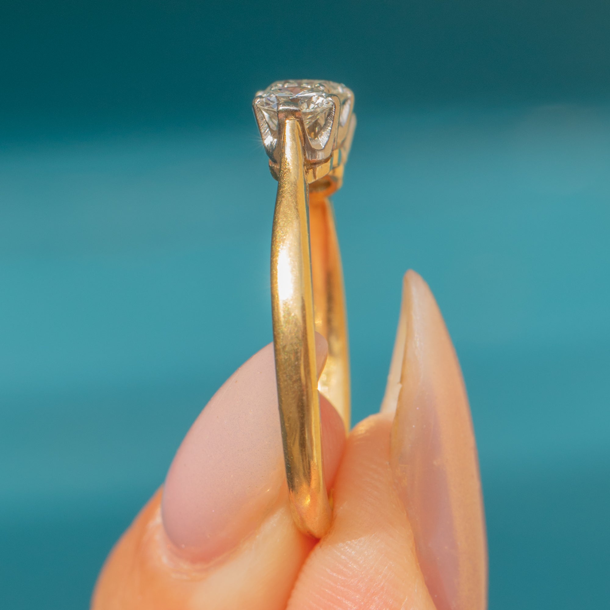 A refined Art Deco Diamond trilogy ring, c.1920s, crafted in 18ct Yellow Gold with Platinum settings. The ring is set with three bright and sparkling round-cut Diamonds. With a total Diamond weight of 0.65ct, the gems are lively and full of brilliance, displaying excellent white colour and clarity.