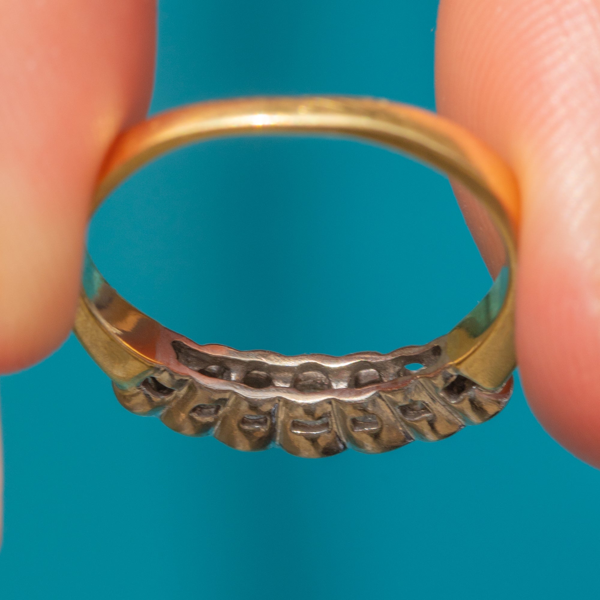 EXCELLENT: A stunning 18ct Gold Diamond ring in excellent vintage condition. All seven scintillating Diamonds are securely set and free from fleabites. The 18ct Yellow and Platinum are in glorious condition, free from dings, dents or scratches.
