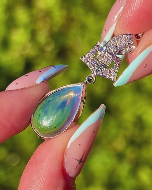EXCELLENT: The Moonstones are bright with only light surface abrasions visible under close inspection. The Diamond settings are crisp with all stones secure; the Platinum and 18ct Gold show fine milgrain detail and a gentle, even patina in the recesses. Articulation and fittings are sound with minimal wear consistent with careful use.