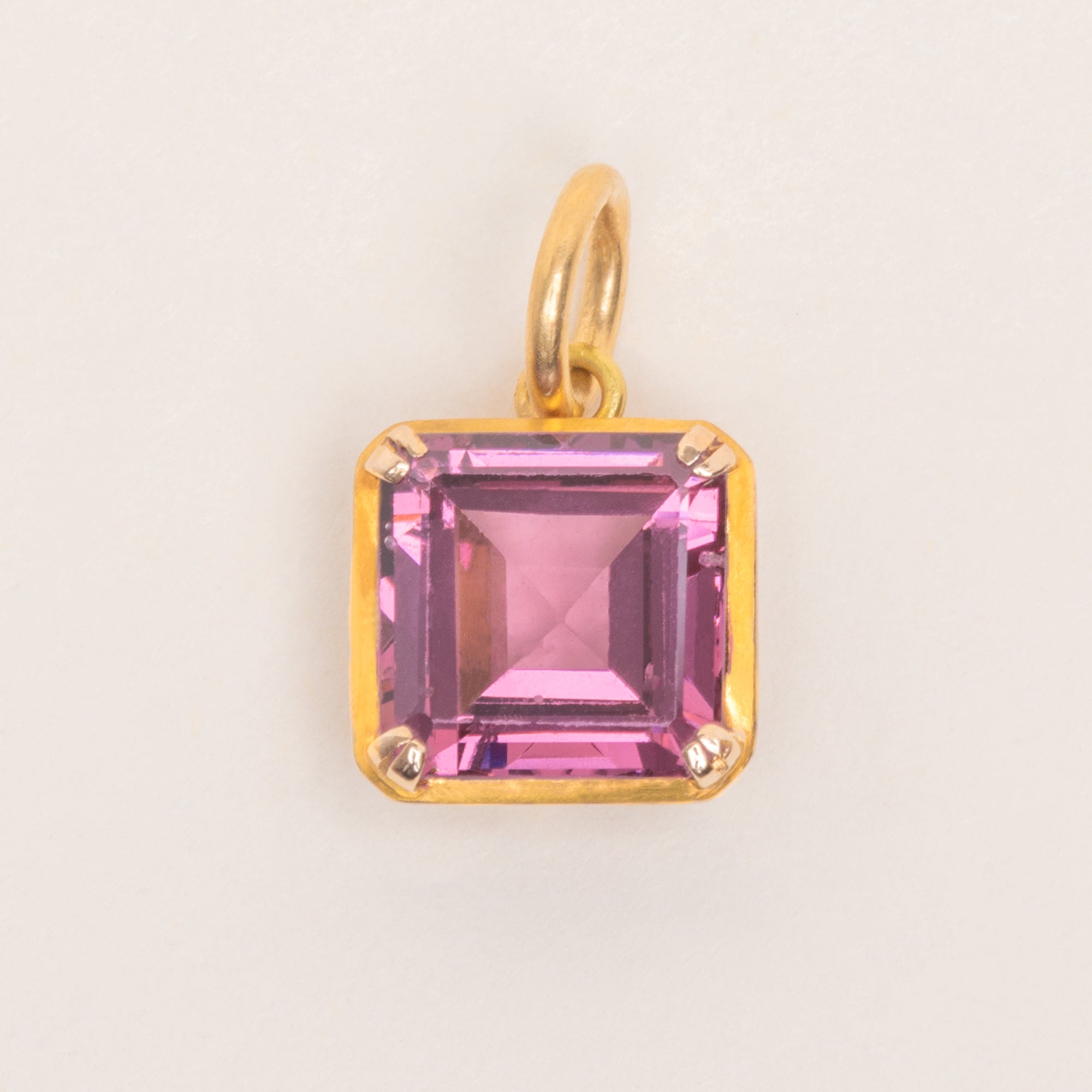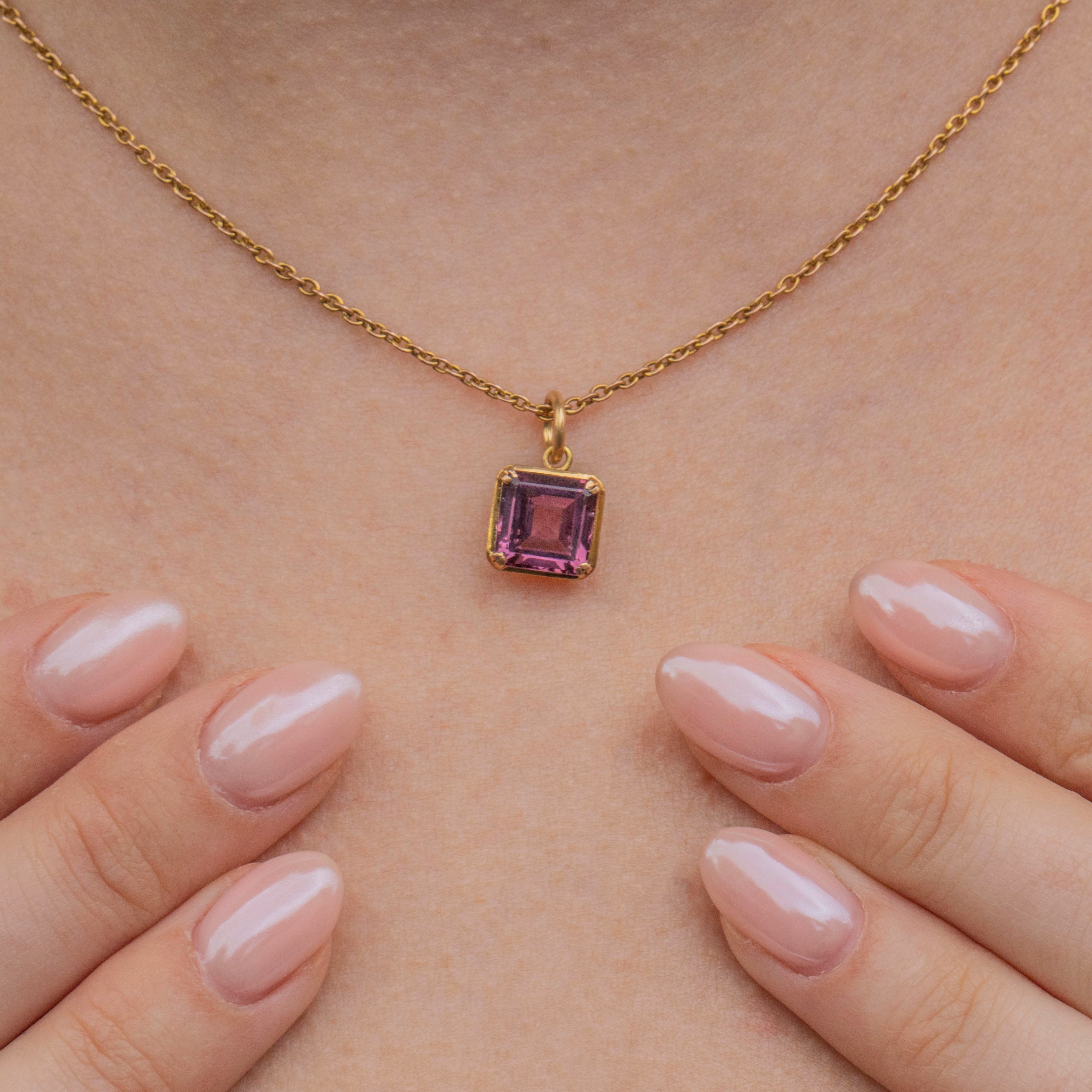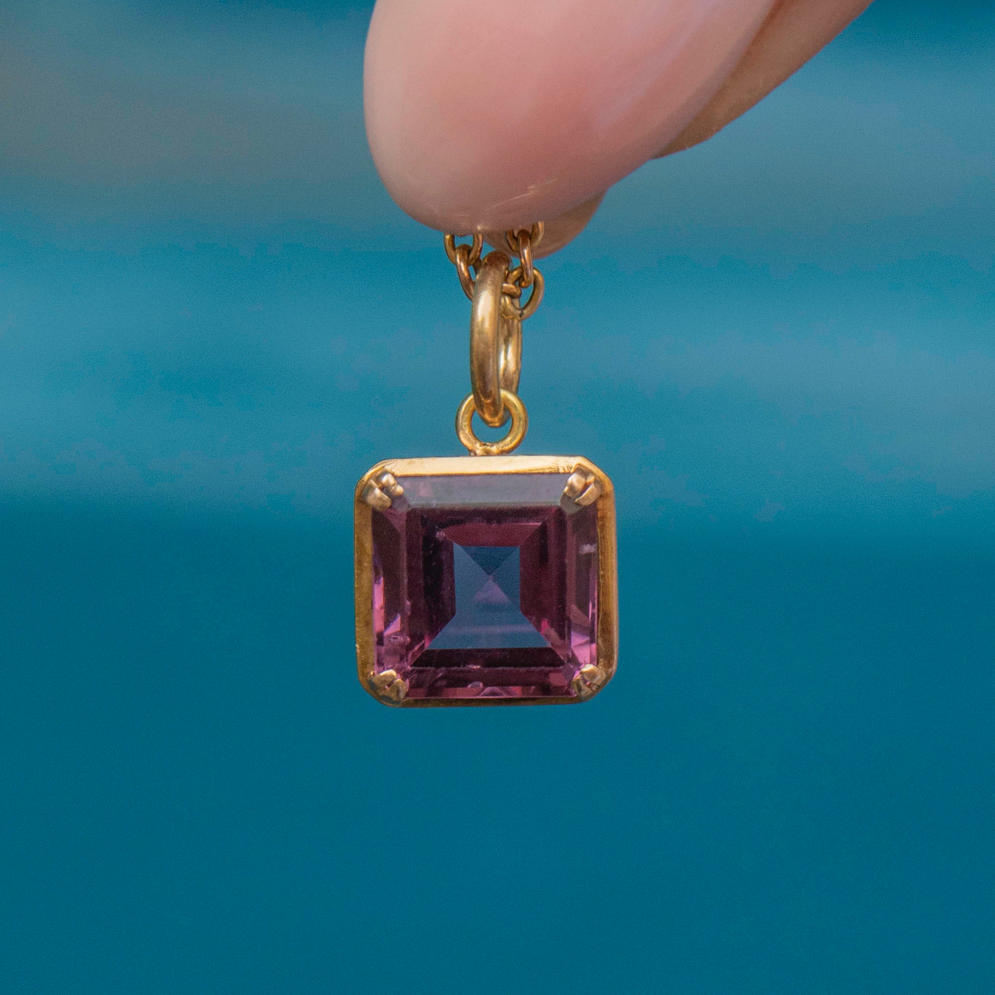 Add a pop of colour to your décolletage with this Art Deco 18ct Gold purple synthetic Spinel charm! Boasting gorgeous geometric facets, this Art Deco charm is crafted from richly saturated 18ct Gold and homes a violet hued Synthetic Spinel.