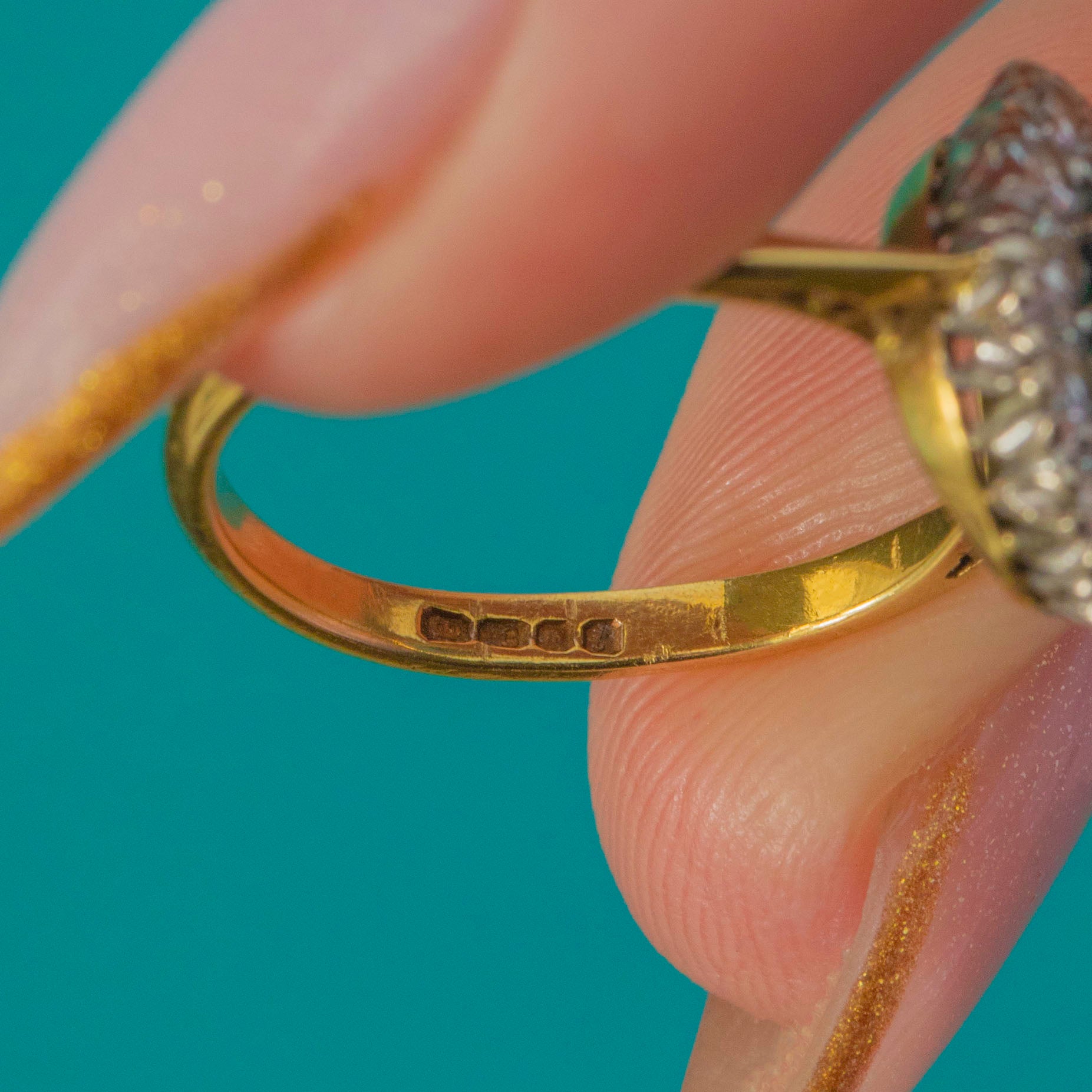 HALLMARKS: Crown, 18, London Leopard’s Head, Date letter “t” for 1974.