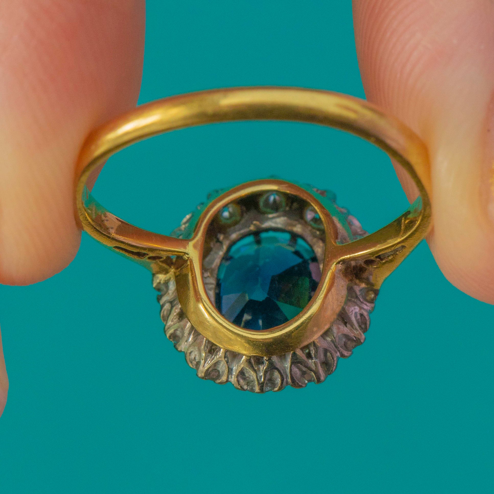 EXCELLENT: The Sapphire is bright and well-polished with no chips or abrasions. The Diamonds are clean and lively, securely set with no damage. The 18ct Gold band shows minimal wear and retains a strong, well-preserved shape. A beautifully maintained Vintage halo ring.