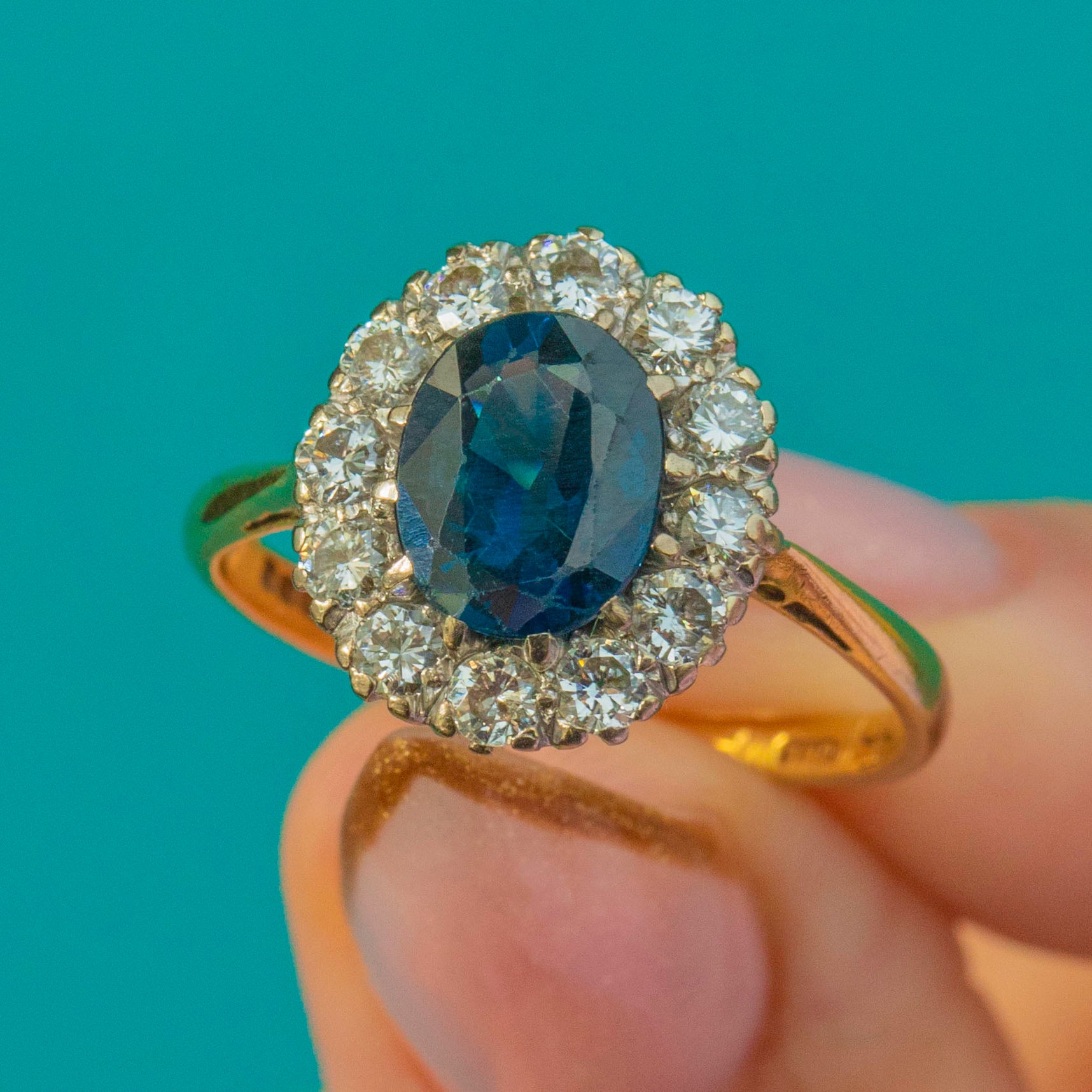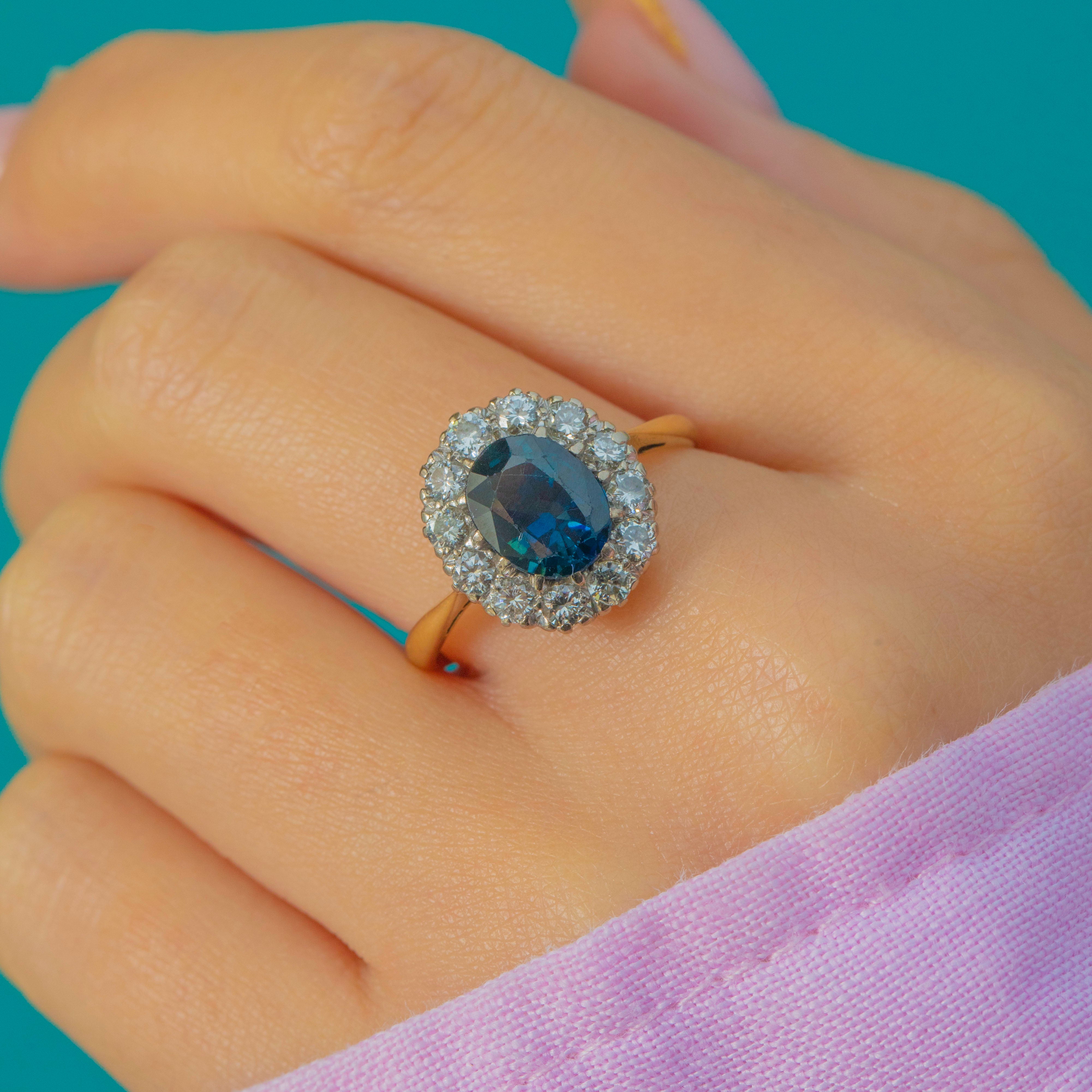 A striking Vintage Sapphire and Diamond ring dating to 1974, crafted in rich 18ct Gold. The centrepiece is a beautifully proportioned oval 2.00ct Sapphire, framed by a halo of twelve bright Diamonds totalling approximately 0.75cts. Bold, elegant and wonderfully glamorous, it’s a timeless late-20th-century design that wears beautifully on the hand.