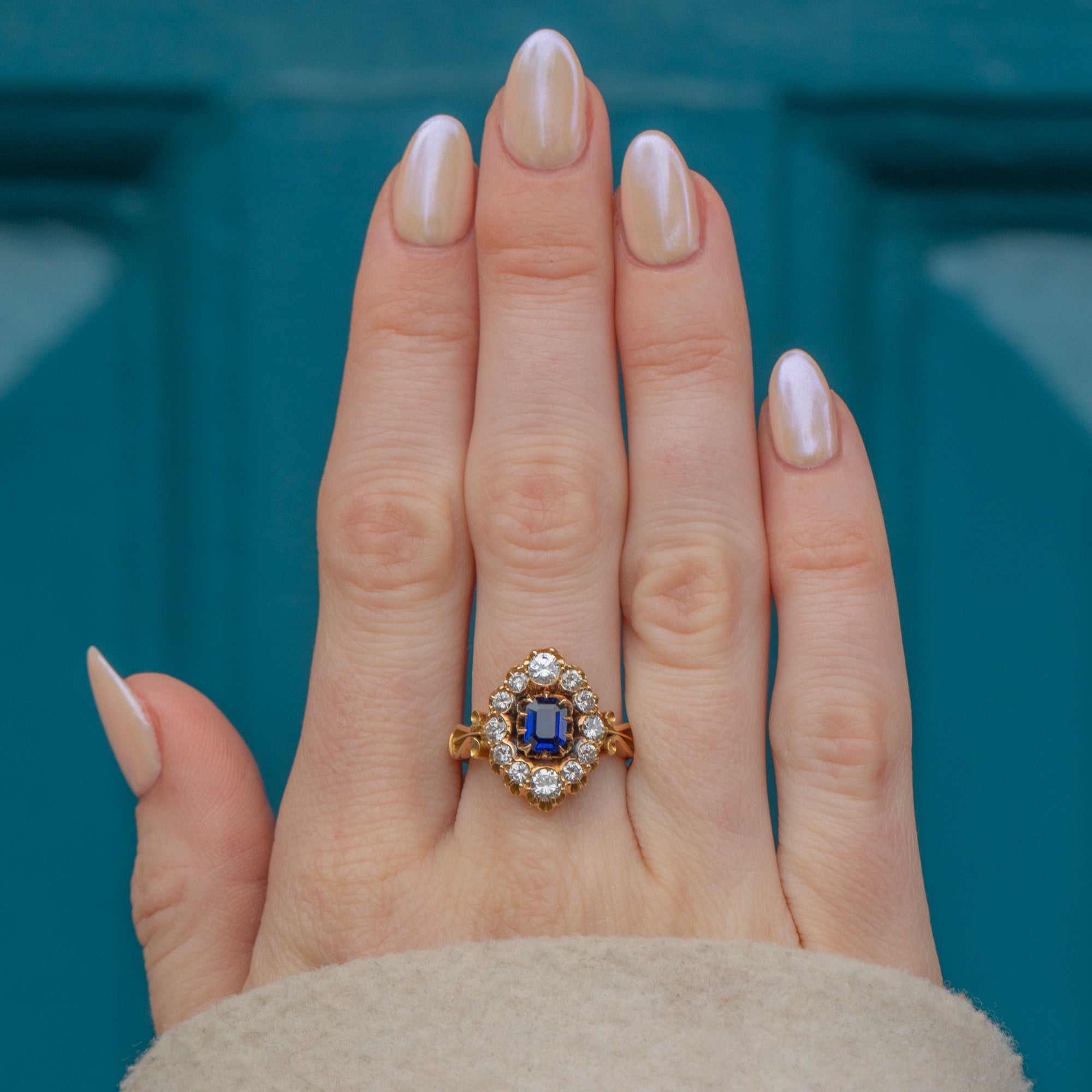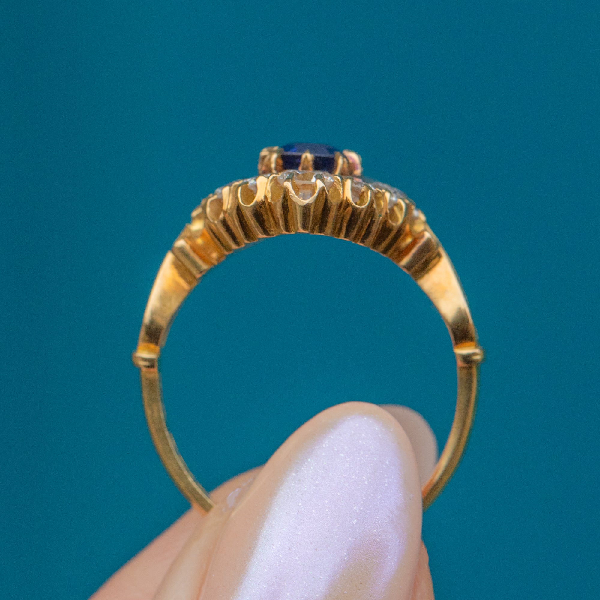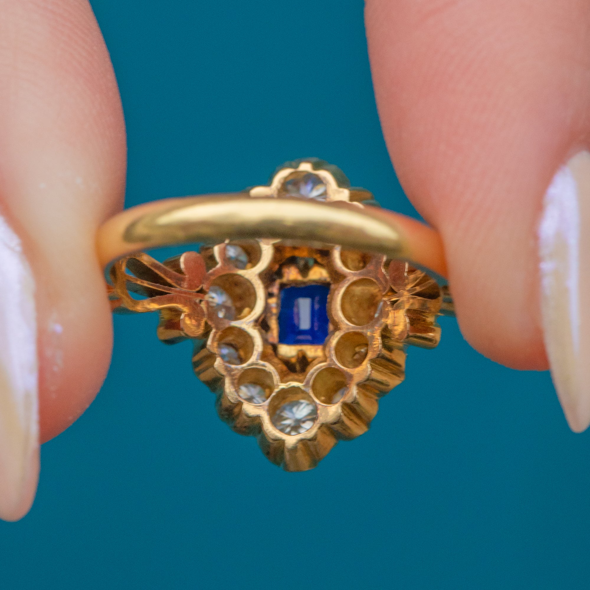 If you love antique Gold rings, then you'll love this 18ct Gold Sapphire Diamond marquise cluster ring! Although hallmarked to 1976, this ring certainly looks antique, like it was made circa 1900.