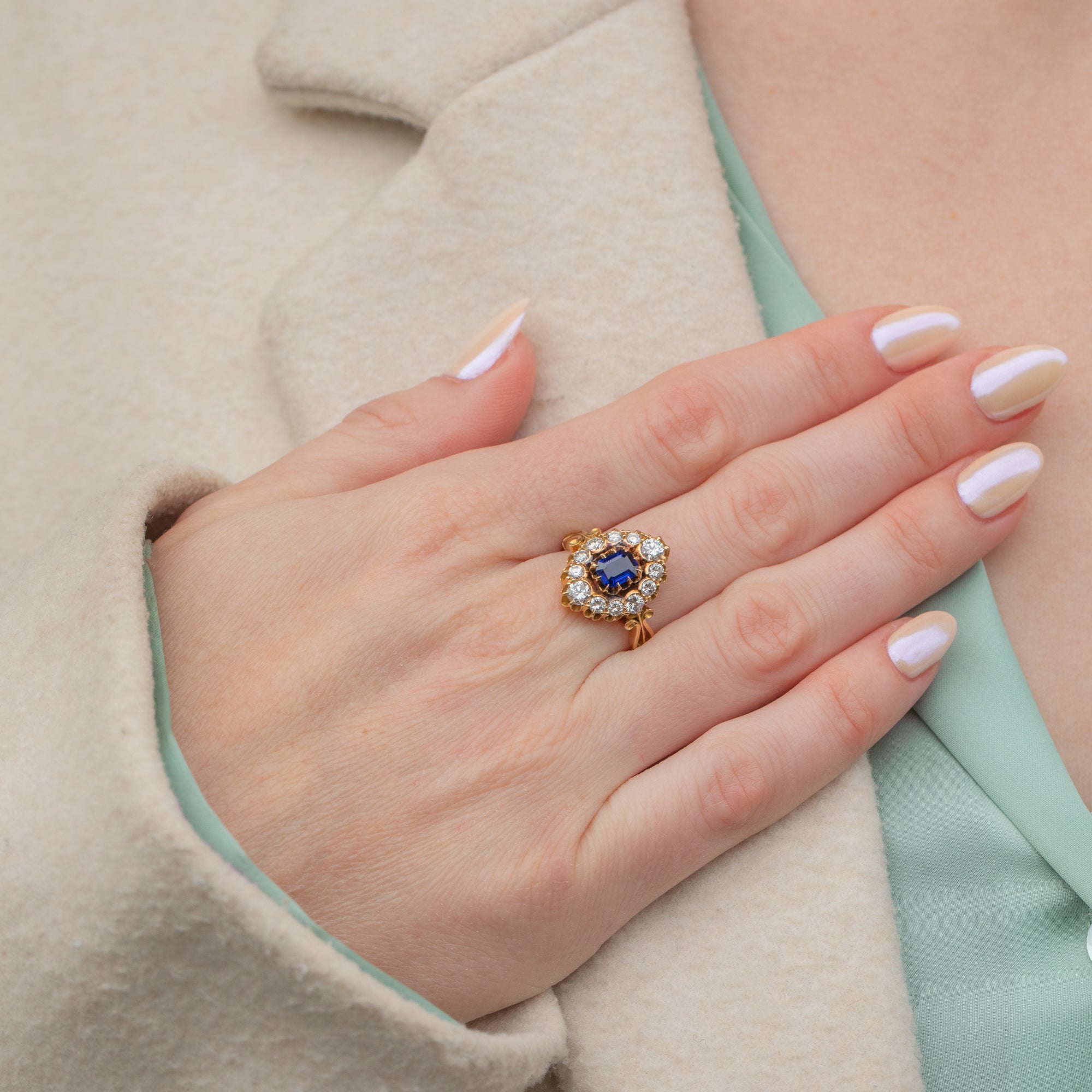 EXCELLENT. This 18ct Gold Sapphire Diamond marquise cluster ring is in excellent condition. The gemstones are secure and sparkle beautifully. The ring is hallmarked to 1976, but impresses with an antique allure. The shoulder are pretty and lead out to a robust shank.