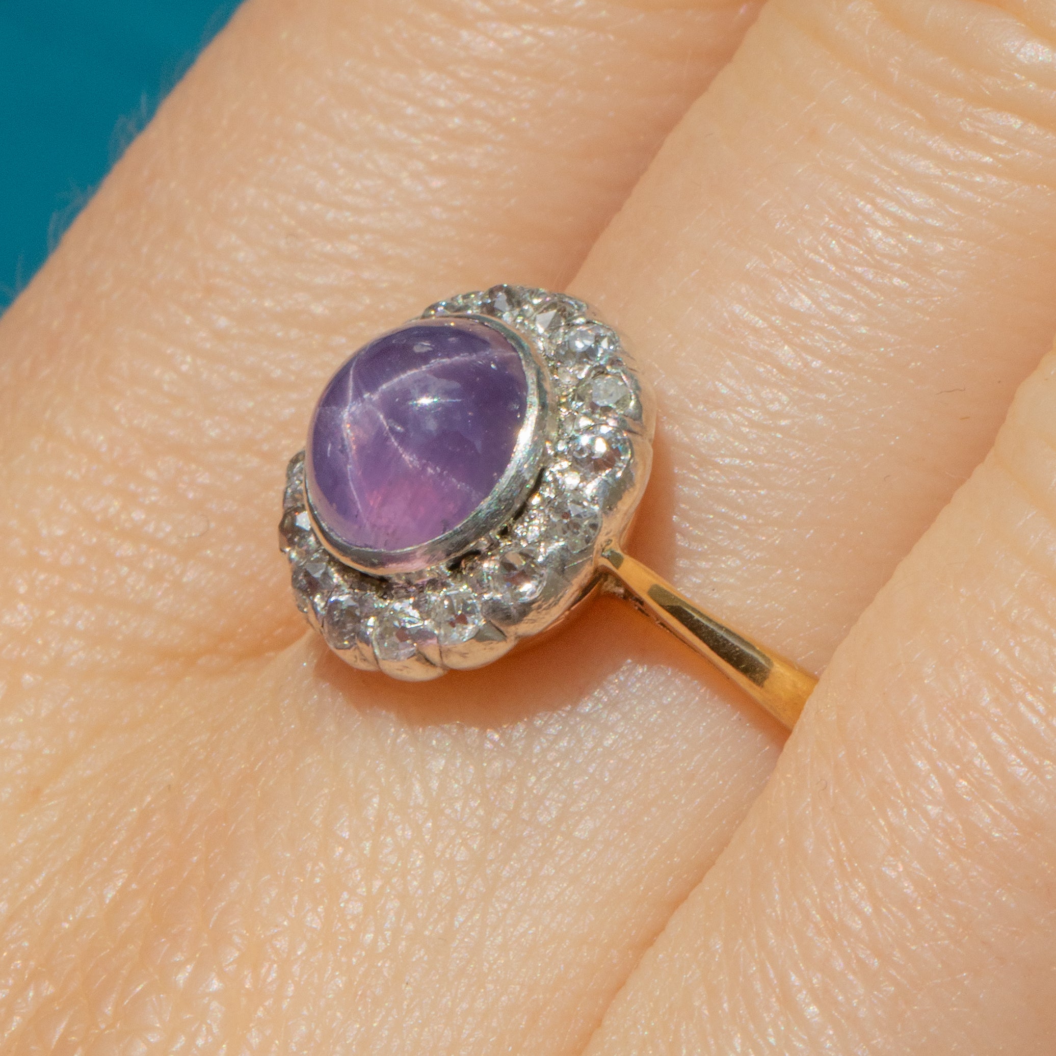 We are pleased to introduce this exquisite Victorian 18ct Gold star Ruby cabochon Diamond cluster ring, a timeless masterpiece crafted to captivate your attention! Nestled within a lustrous Golden embrace, the lavender-hued 3.00ct star Ruby cabochon is surrounded by a halo of scintillating Diamonds creating a truly spectacular piece.