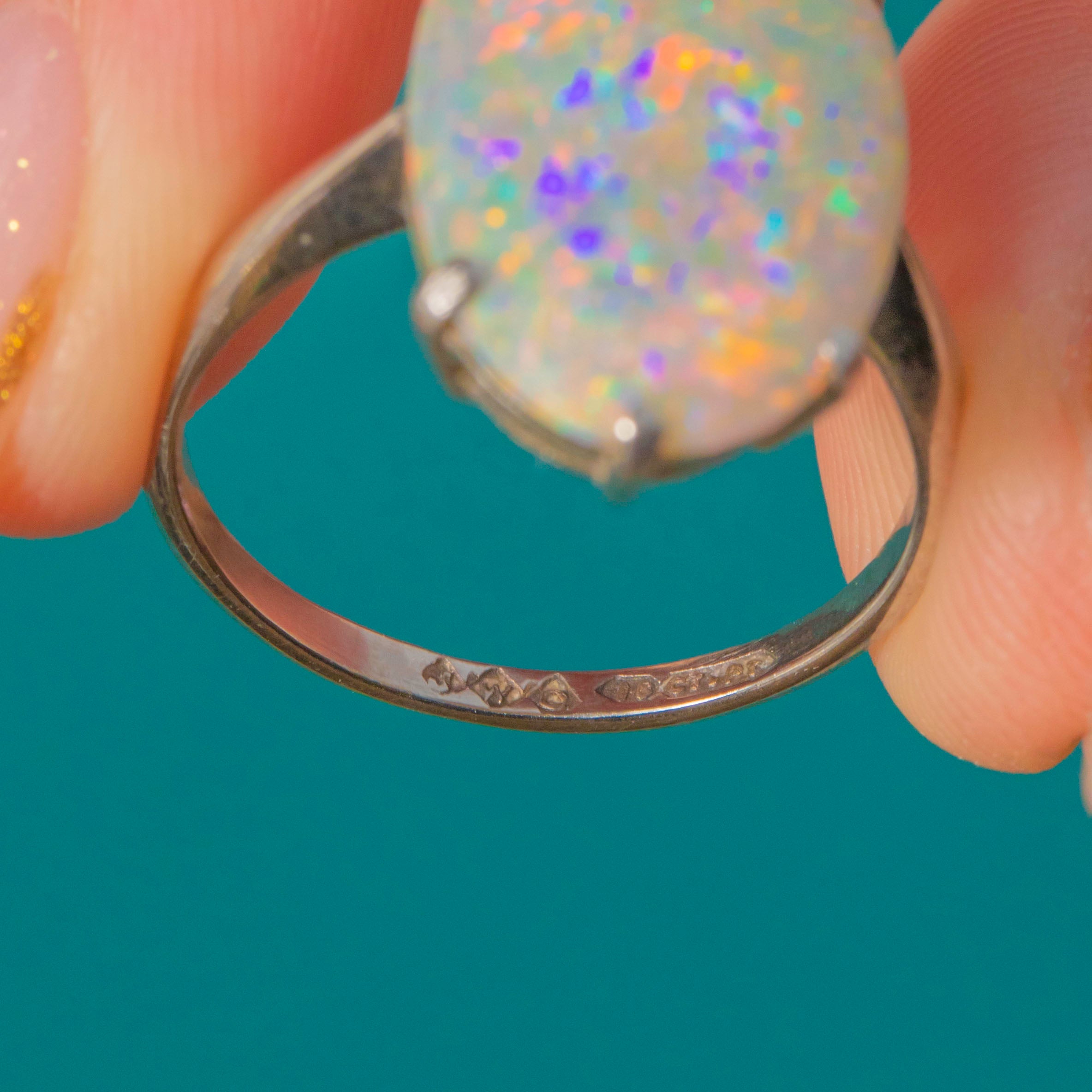 EXCELLENT: The Opal is bright with strong play-of-colour and no chips visible. The six-claw white Gold setting is secure with a smooth, well-shaped shank showing only light wear consistent with gentle use.