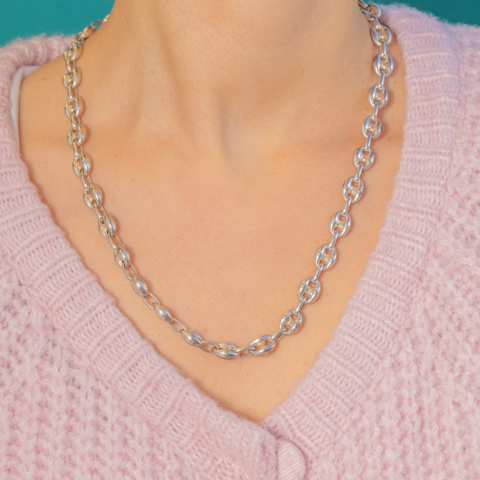 Bold, sculptural and wonderfully sleek, this Vintage Silver mariner link chain showcases repeating domed puffy oval stations of classic Mariner style links connected by smaller open ovals for that clean, geometric rhythm we love! The highly polished finish amplifies its fluid silhouette, catching the light across every curved link.