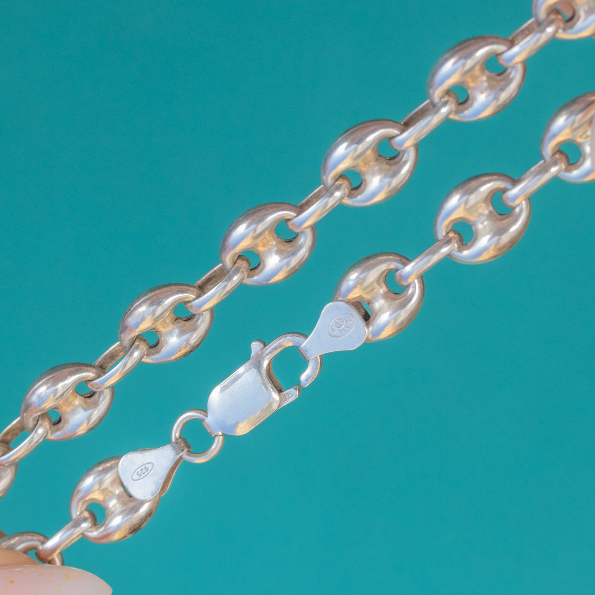 Tests as Sterling Silver and fitted with a robust lobster-claw clasp, this chain carries crisp “925” stamps alongside maker’s marks. With a substantial 34.5g presence, it delivers a confident, minimalist look that feels timeless and contemporary.