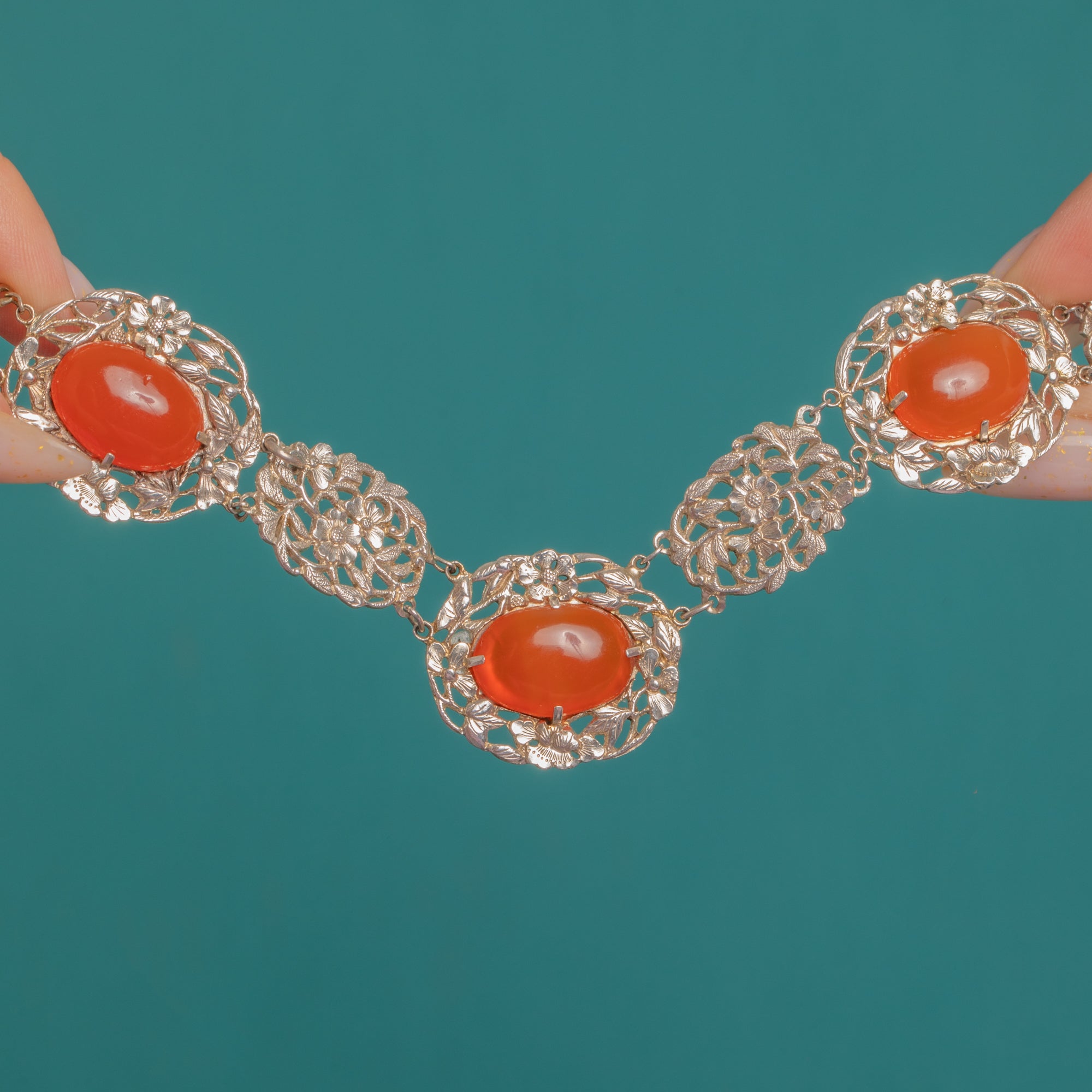 Radiant Carnelian cabochons glow against intricate Silver openwork in this Chinese Art Deco necklace. Alternating floral plaques and oval stations create a lace-like rhythm, the domed orange to orange-red Carnelians bringing a warm, luminous contrast to the cool-toned metal.