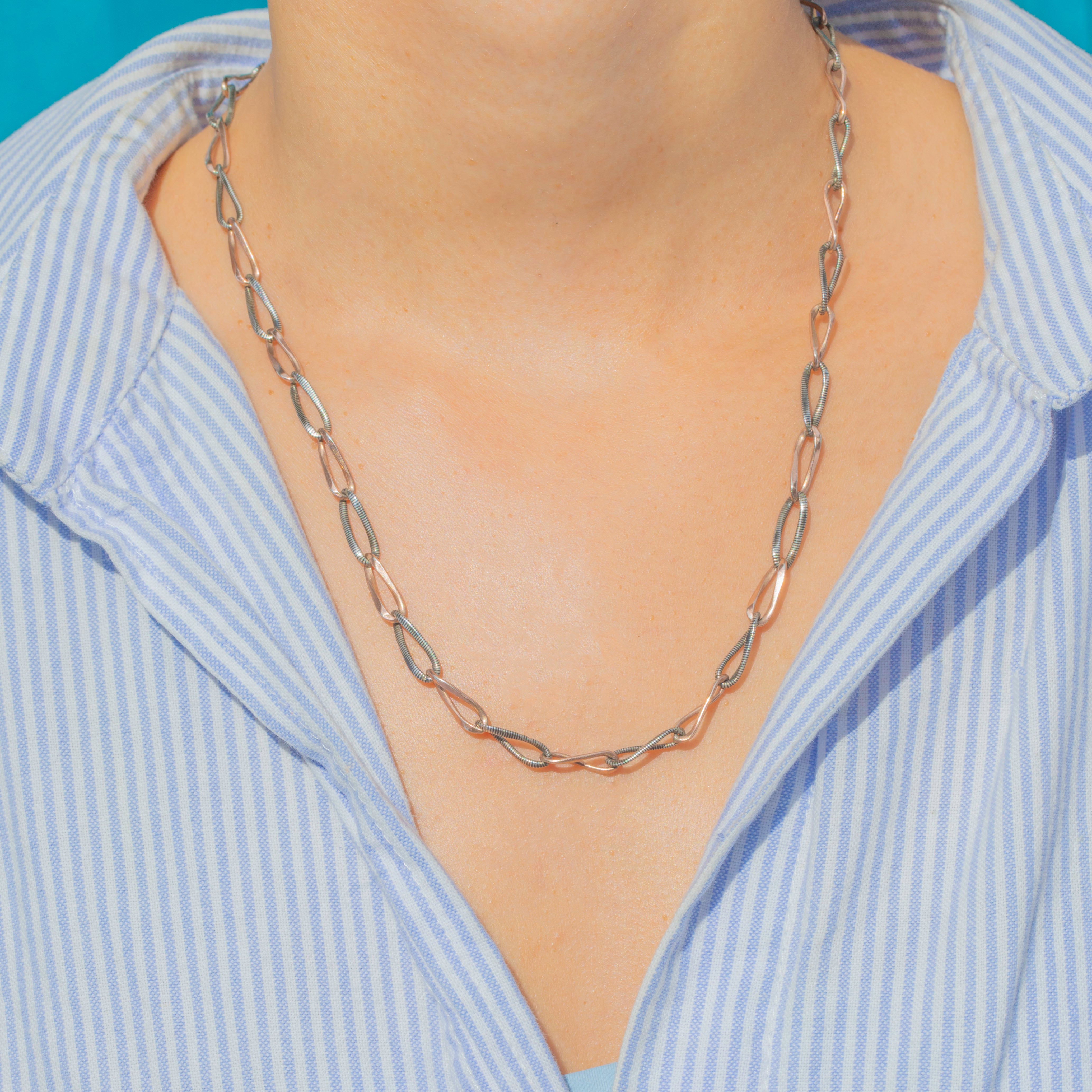 This antique Victorian necklace is crafted in Silver and decorated with striking black Niello. The elongated oval links are detailed with fine ridged engravings, giving the chain depth and texture, while the contrasting black Niello lends a bold, graphic appeal. Completing the necklace is a large 20mm bolt-ring clasp, both practical and stylish, ideal for attaching a pendant or locket.