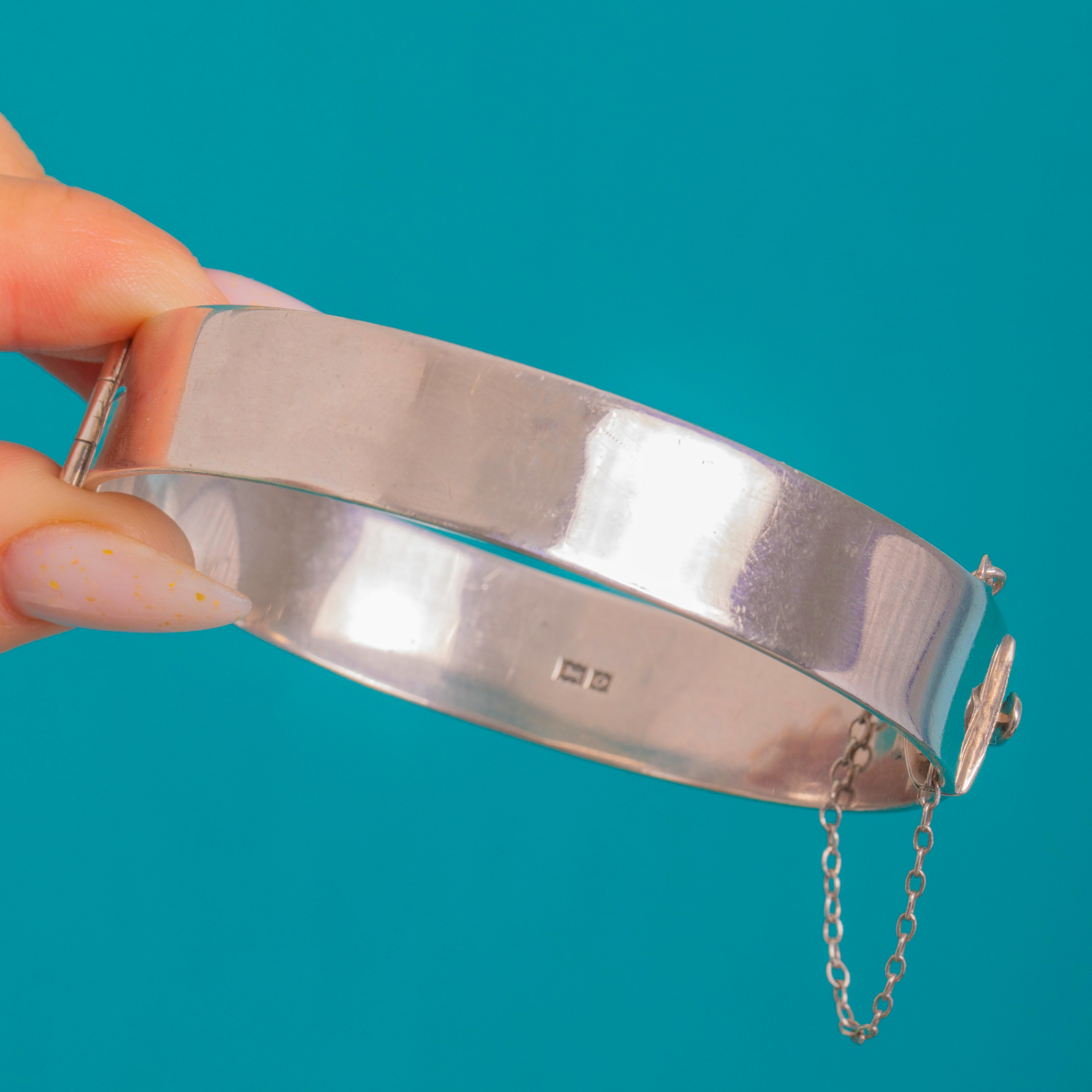 It closes with a neat tongue-in-box clasp and retains its original safety chain for added peace of mind. A classic Mid-Century piece with enduring charm, beautifully made in solid Silver with clear Birmingham hallmarks for 1963.