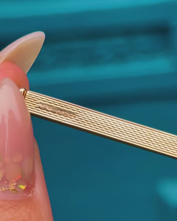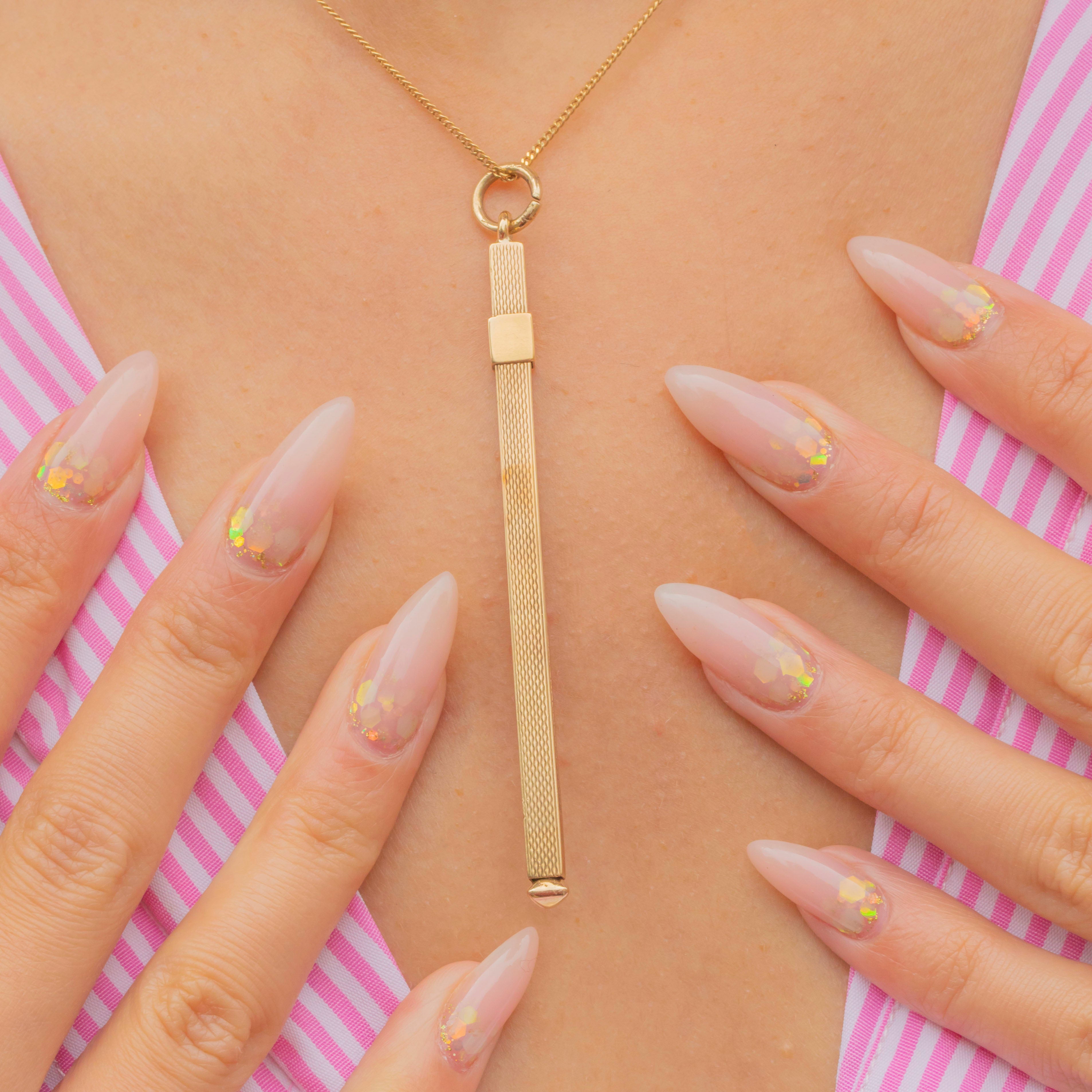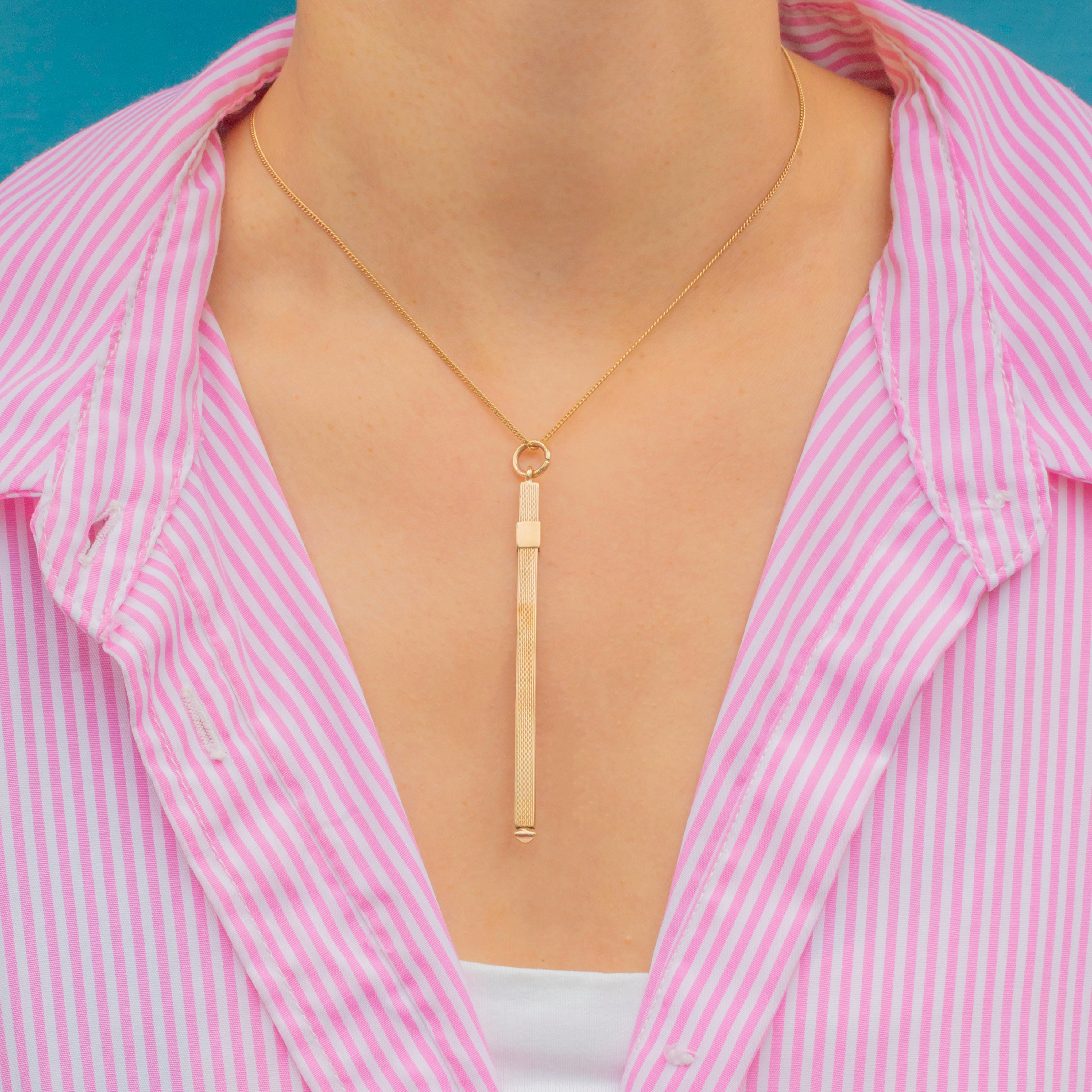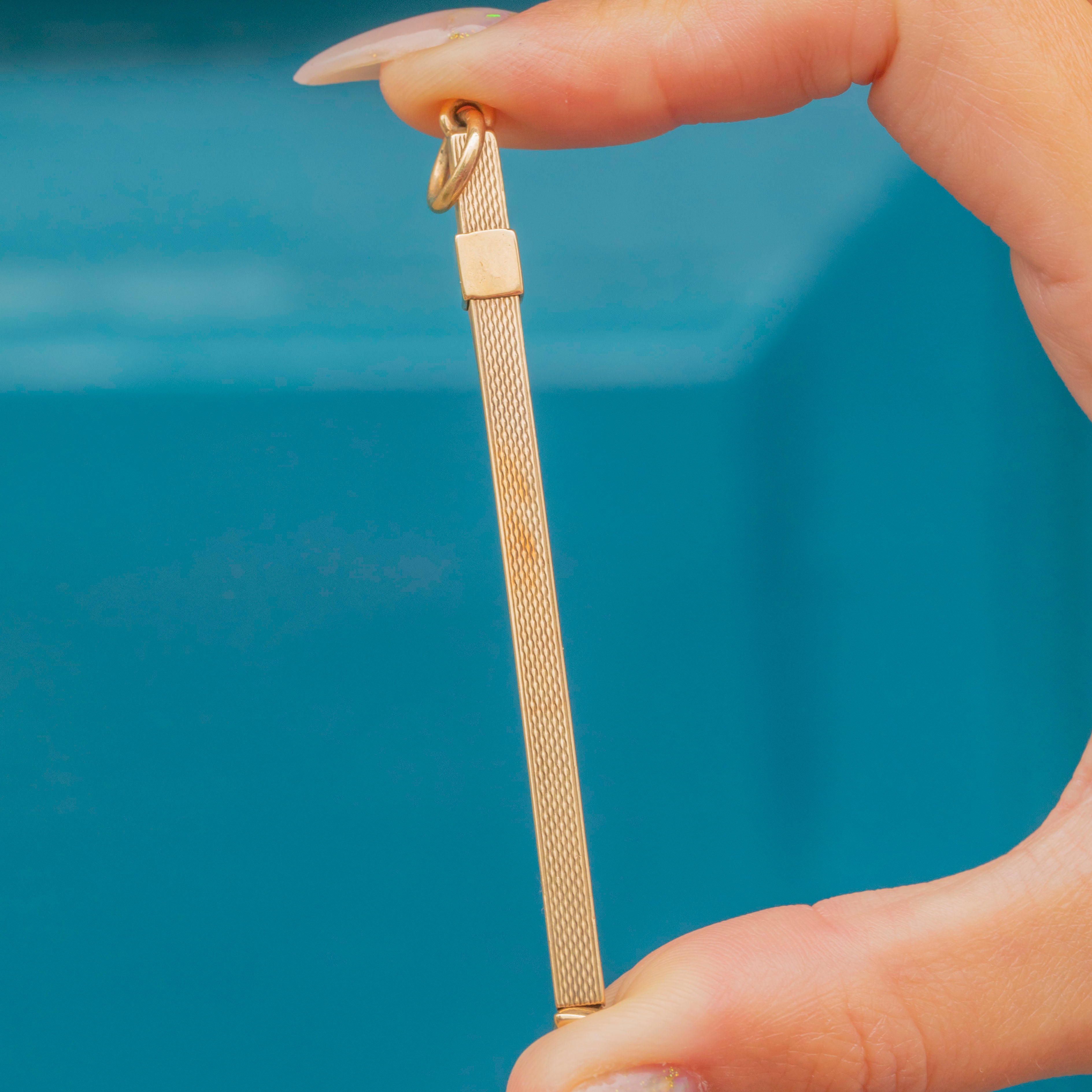 A fun and unusual 1970s Retro swizzle stick charm crafted in 9ct Gold. Complete with a jump ring for easy wear, this miniature cocktail stirrer extends and retracts smoothly, making it both a playful conversation starter and a collectable piece for everyday wear.