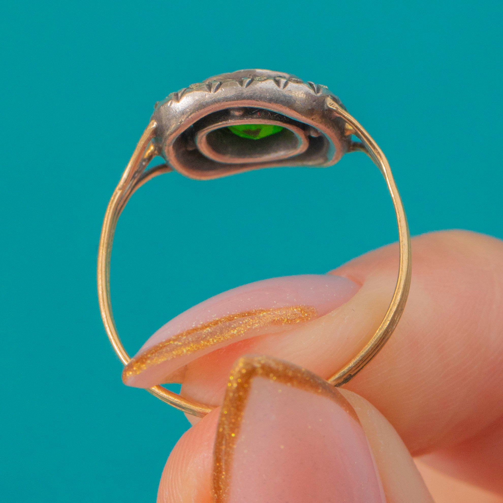 The colour and composition are beautifully balanced — the bright verdant hue of the Paste perfectly offset by the soft metallic shimmer of Marcasite and the warmth of the antique Gold. Its charming split triple-band design and handmade setting embody the craftsmanship of the Georgian to early 19th-century era, making this a truly special antique treasure.