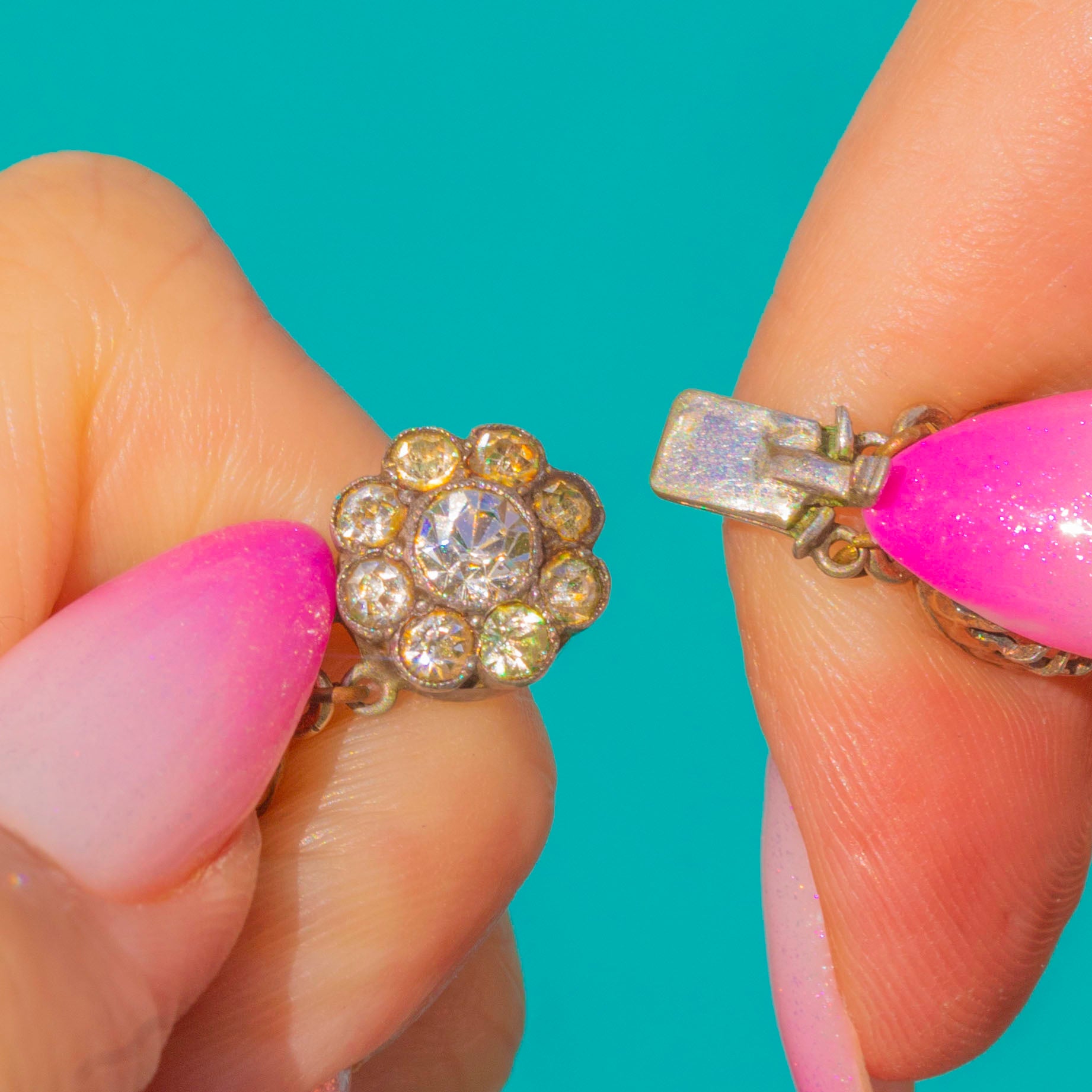 EXCELLENT: Paste stones are bright with only mild surface wear visible under close inspection, retaining lovely sparkle. Silver and Gold-backed settings show gentle, even wear and a light patina consistent with age. No obvious signs of repair observed; overall beautifully preserved for the period.