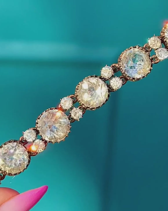 A shimmering Victorian Paste Riviere bracelet, elegantly composed of graduating stones that flow in a continuous line of light. Crafted in Silver with a desirable Gold-backed construction, the warm glow of the backing enhances the crisp brilliance of the Paste, creating a refined, timeless sparkle.