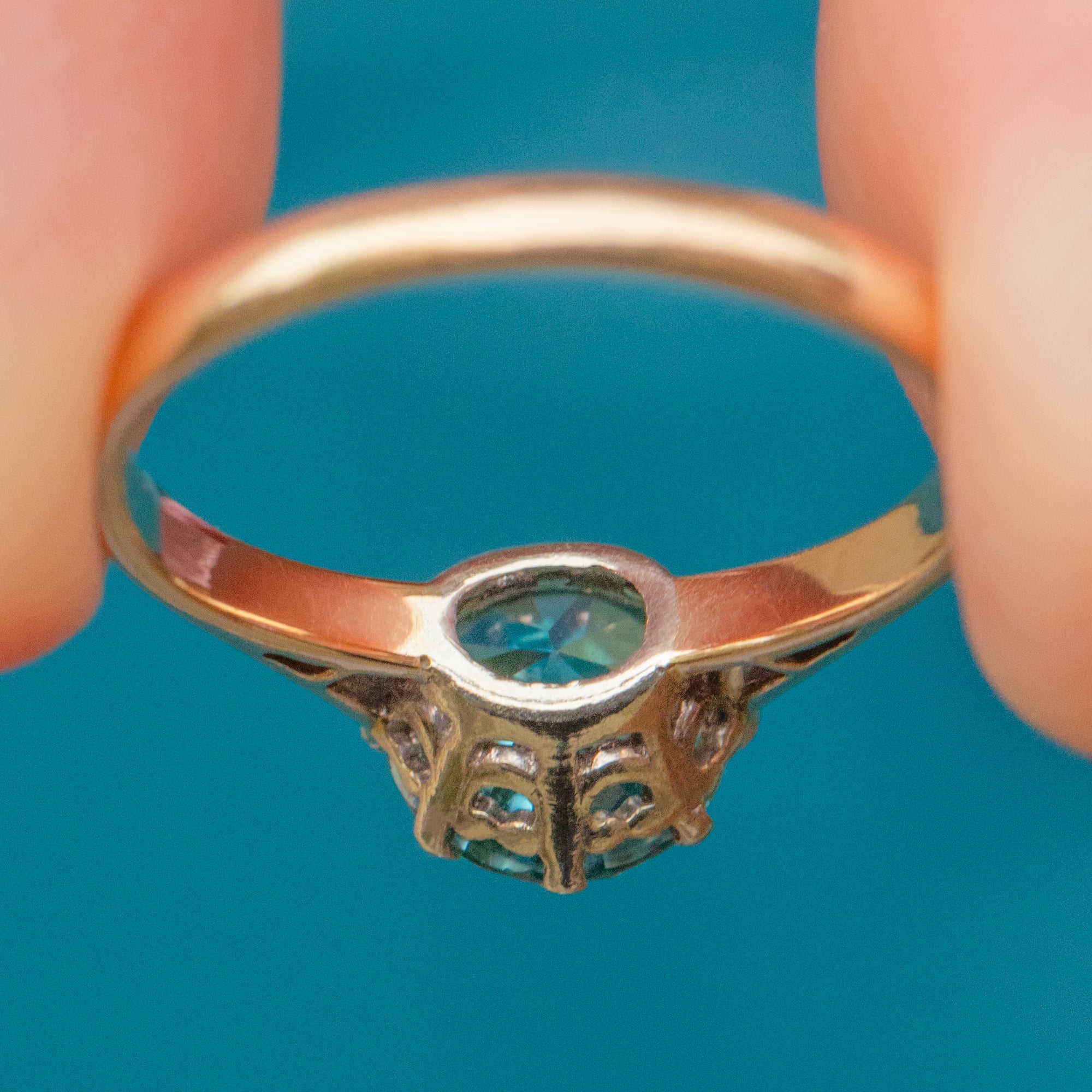 This dazzling Art Deco ring centres a vivid blue Zircon weighing approximately 2.50cts. The gem’s electric brilliance and depth of colour are mesmerising, capturing the crisp geometry and glamour of the 1930s era.