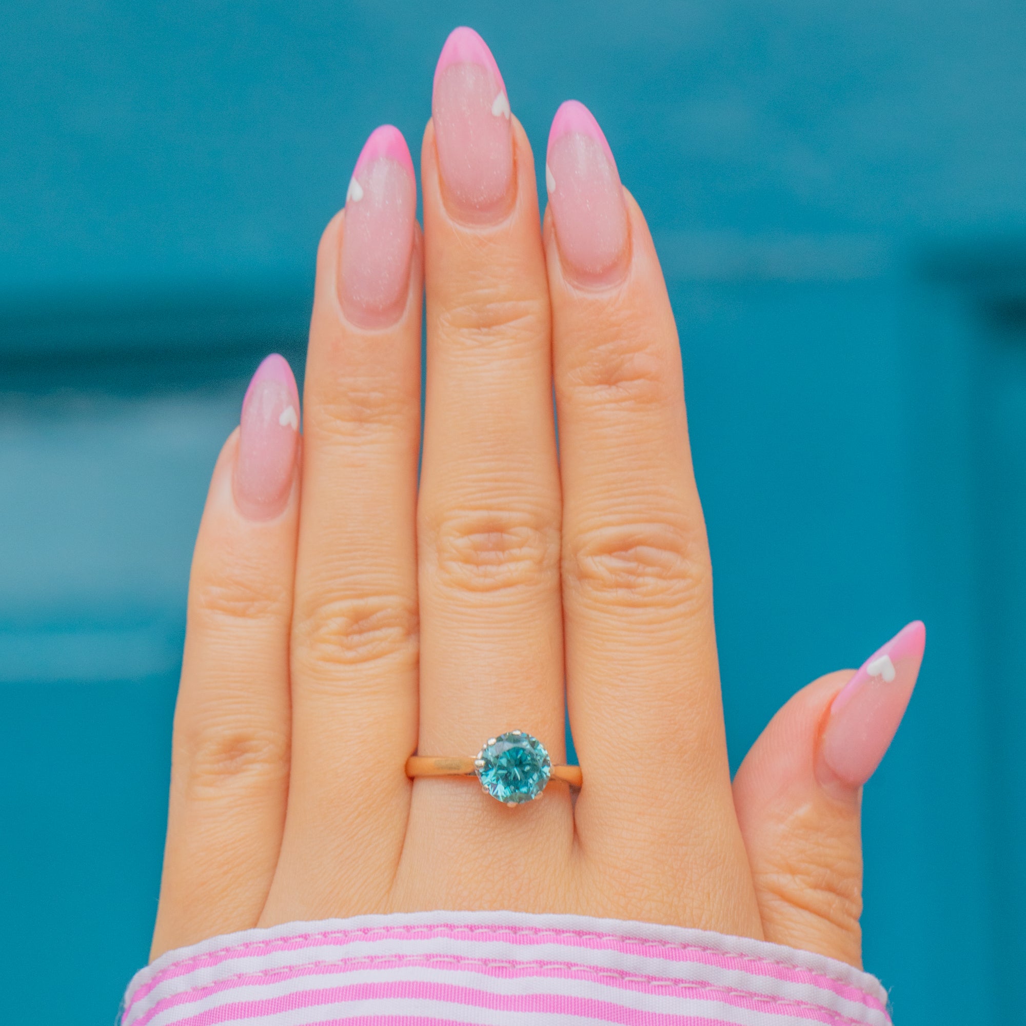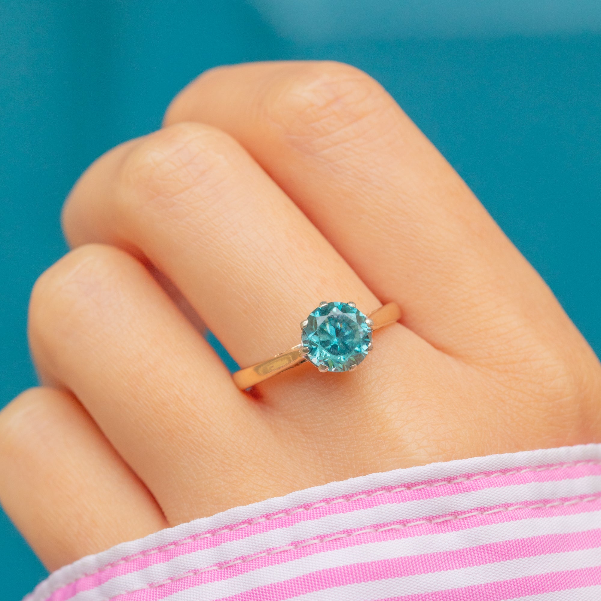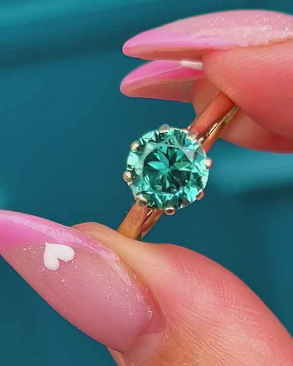 Set in a simple 9ct Gold claw mount, the design lets the Zircon take centre stage — a timeless and elegant statement of Art Deco style that radiates light with every movement.