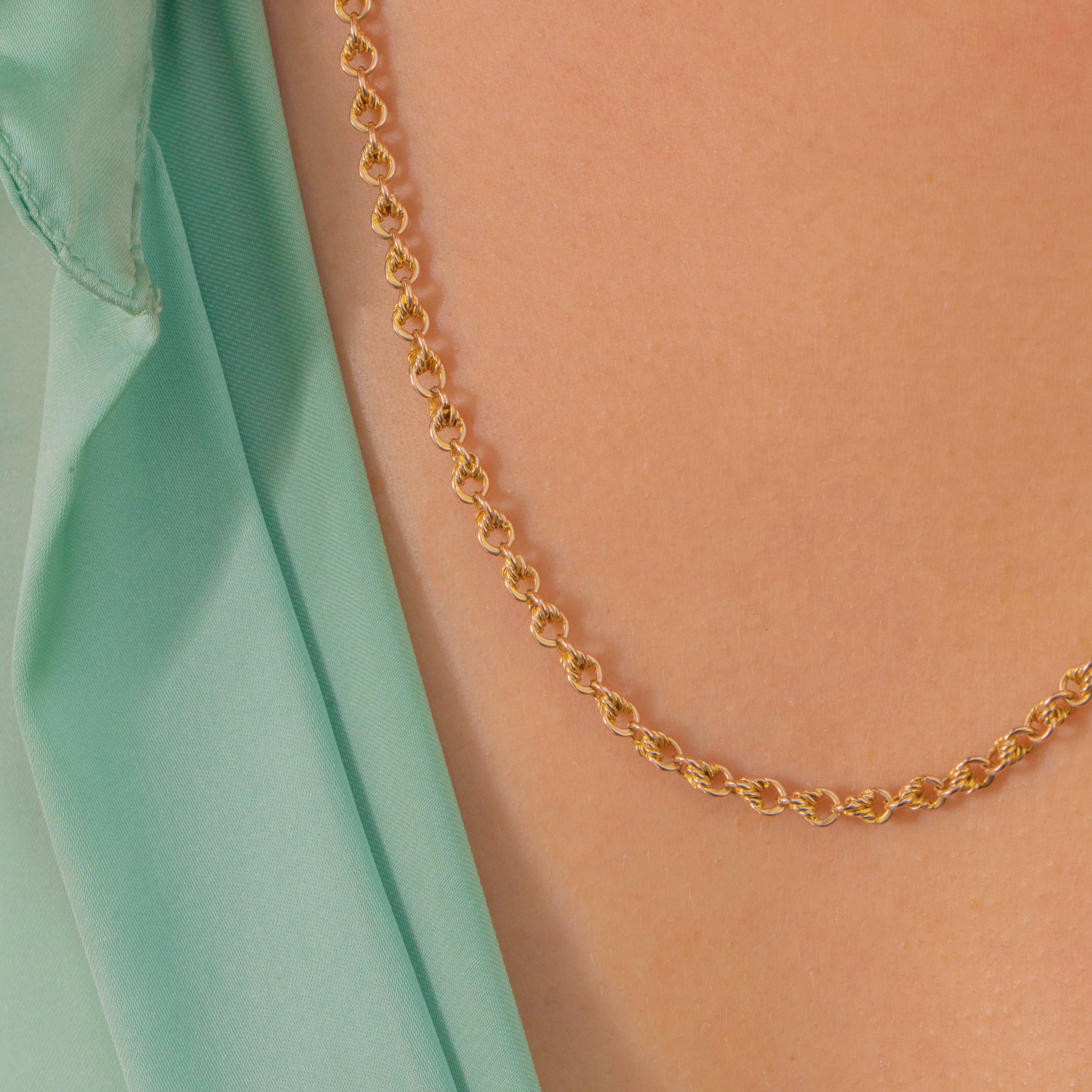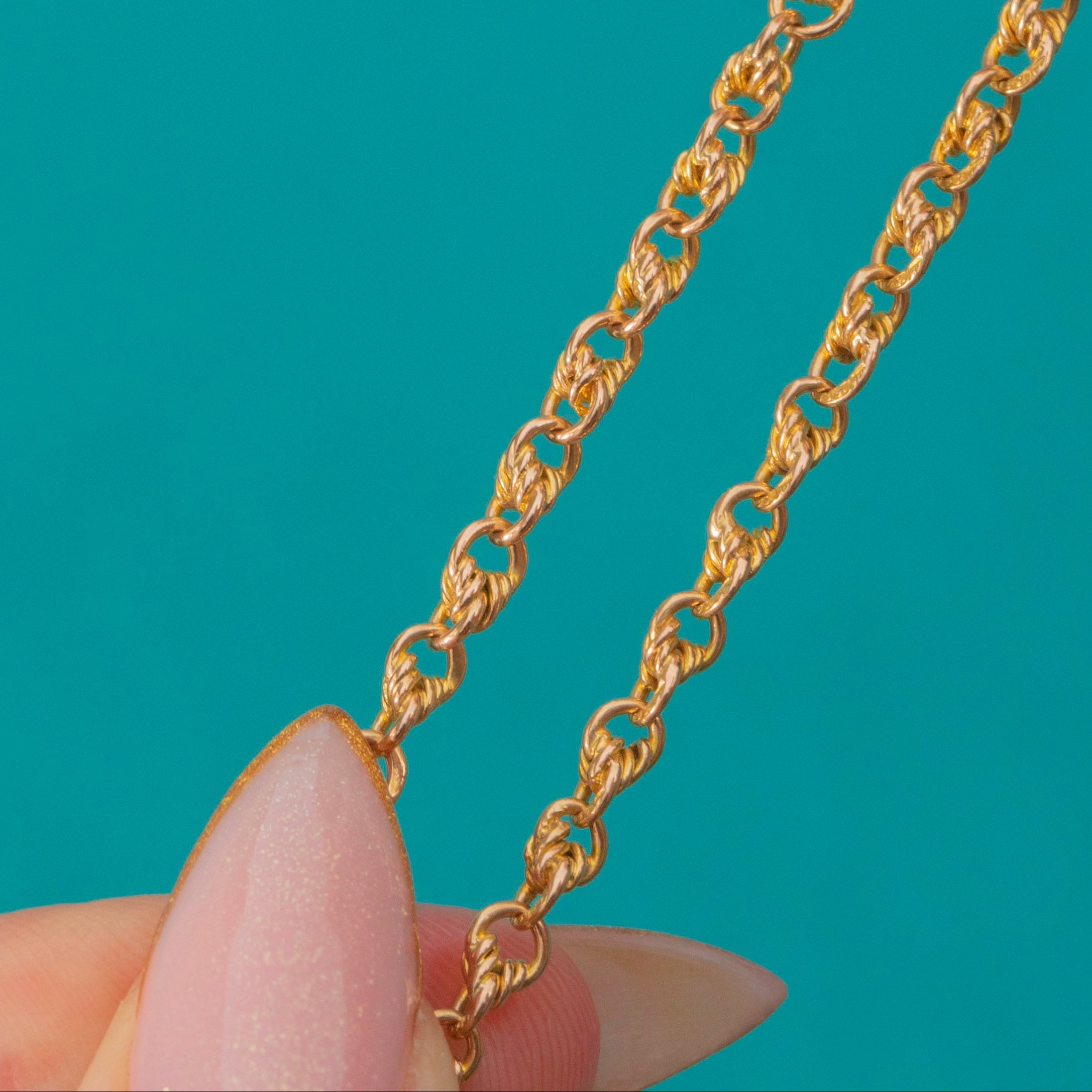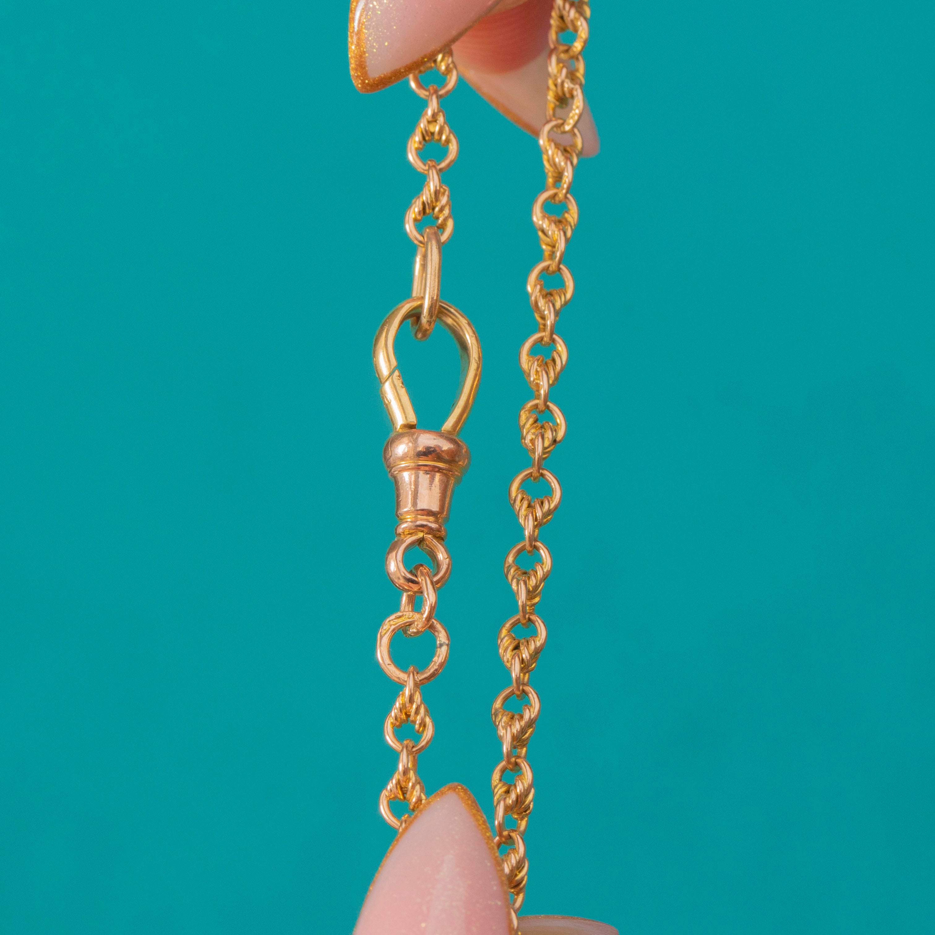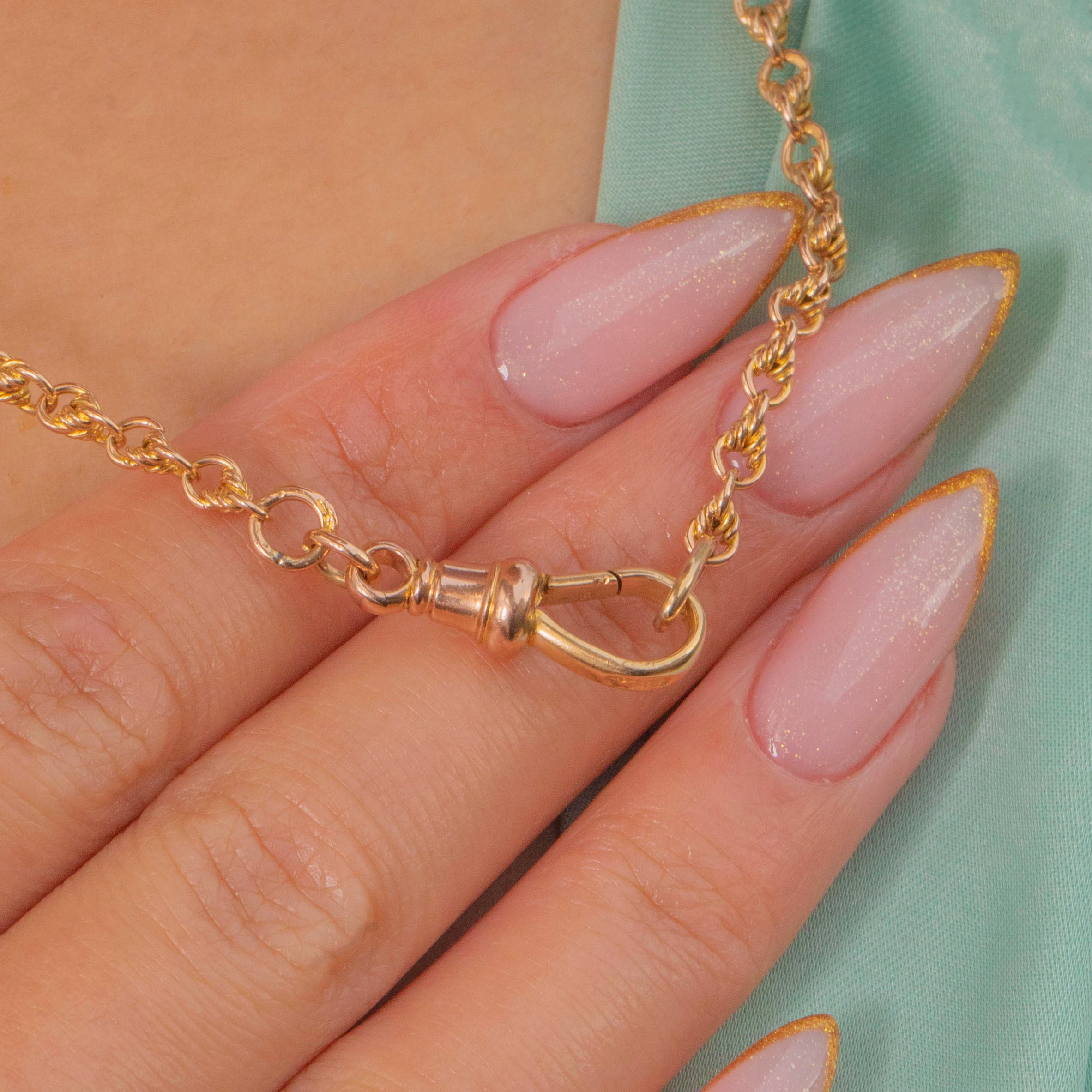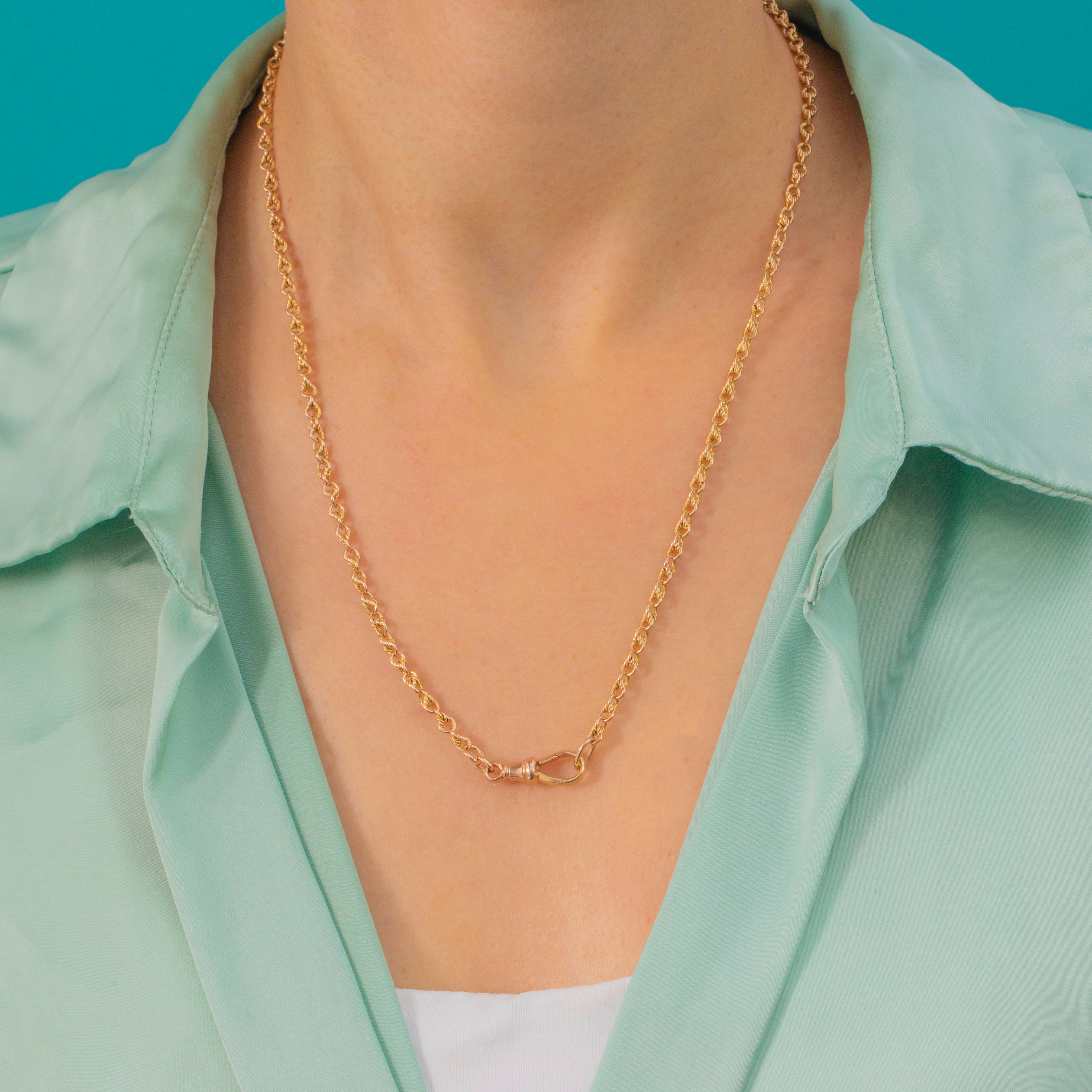 An exquisite Victorian 15ct Gold lover’s knot chain with its original dog-clip clasp. Each link is intricately twisted and interwoven, creating a beautiful display of movement and light.