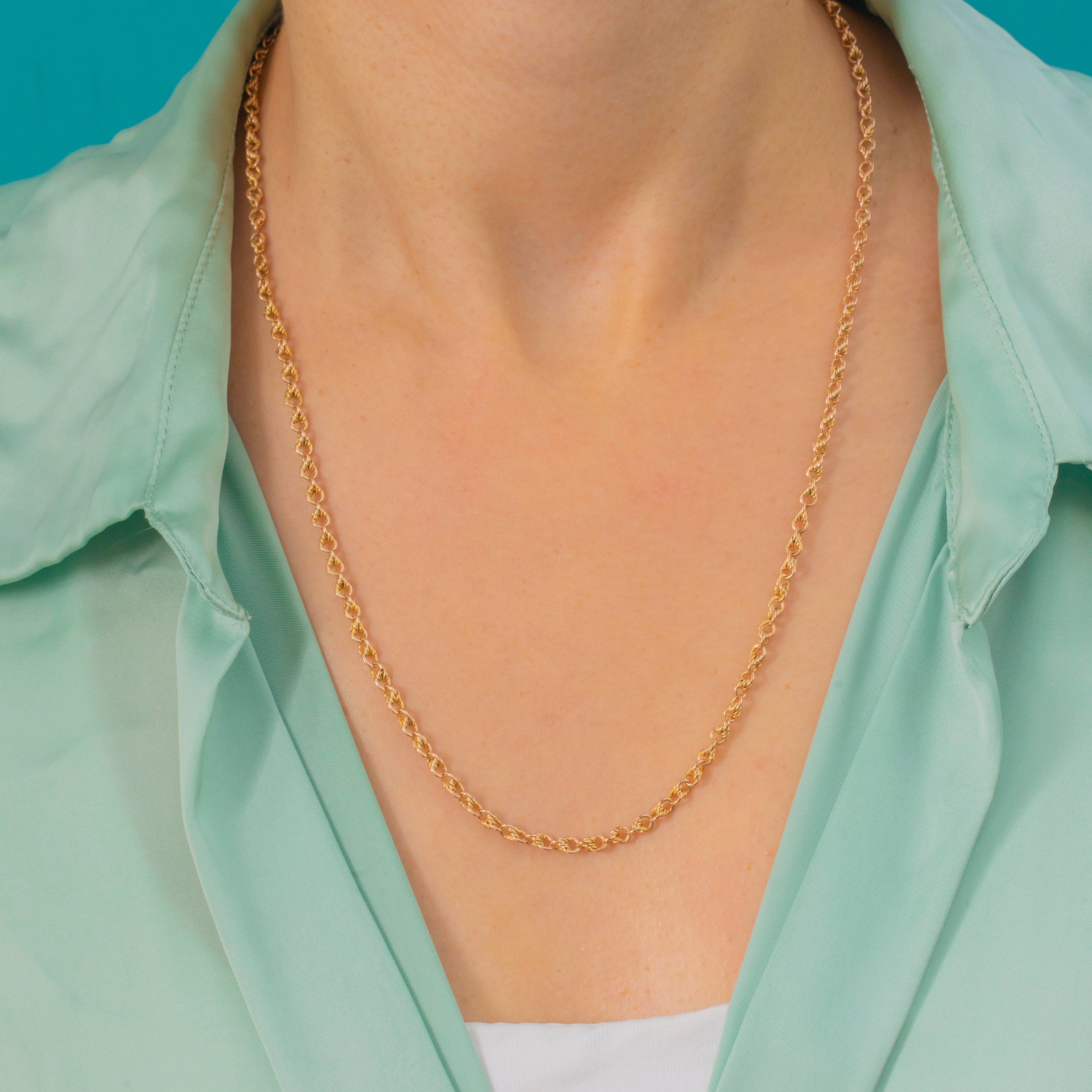 The original dog-clip clasp is both practical and decorative, stamped with full marks for 15ct Gold and the maker’s initials “W.L”. A timeless piece that layers beautifully or makes a statement on its own.